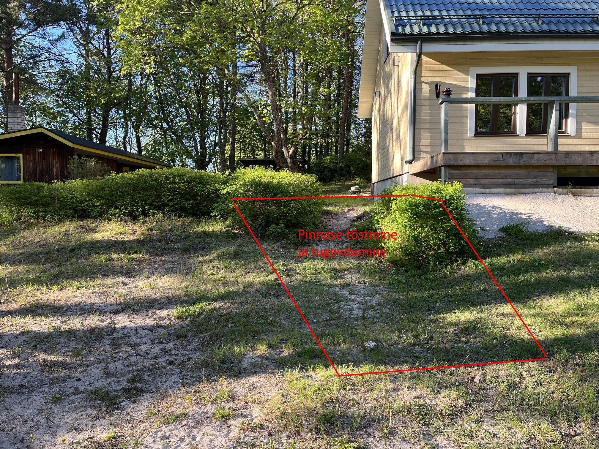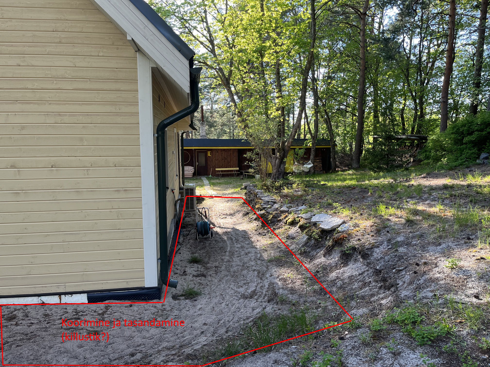 Tegu on liivapinnasega, kõrghaljastus lähedal, ilmselt leidub seal suuri puujuuri mida võiks pigem mitte ära lõhkuda. Õueala on kallaku peal, nii et tuleks ka välja mõelda kuidas mullakihti hiljem kaitsta vihmadega ära uhtumise eest.