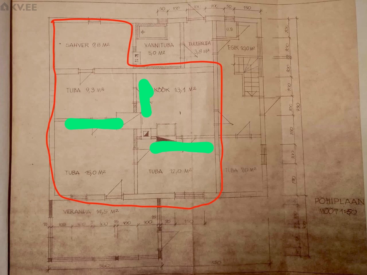 Vanal palkmajal ca 65m2 (pildil punasega osa) oleks vaja lammutada vana puitpõrand. Eemaldama muld ca 40-50cm. Ehitada uus põrand (liiv, laagid, soojustus, Osb või laud).