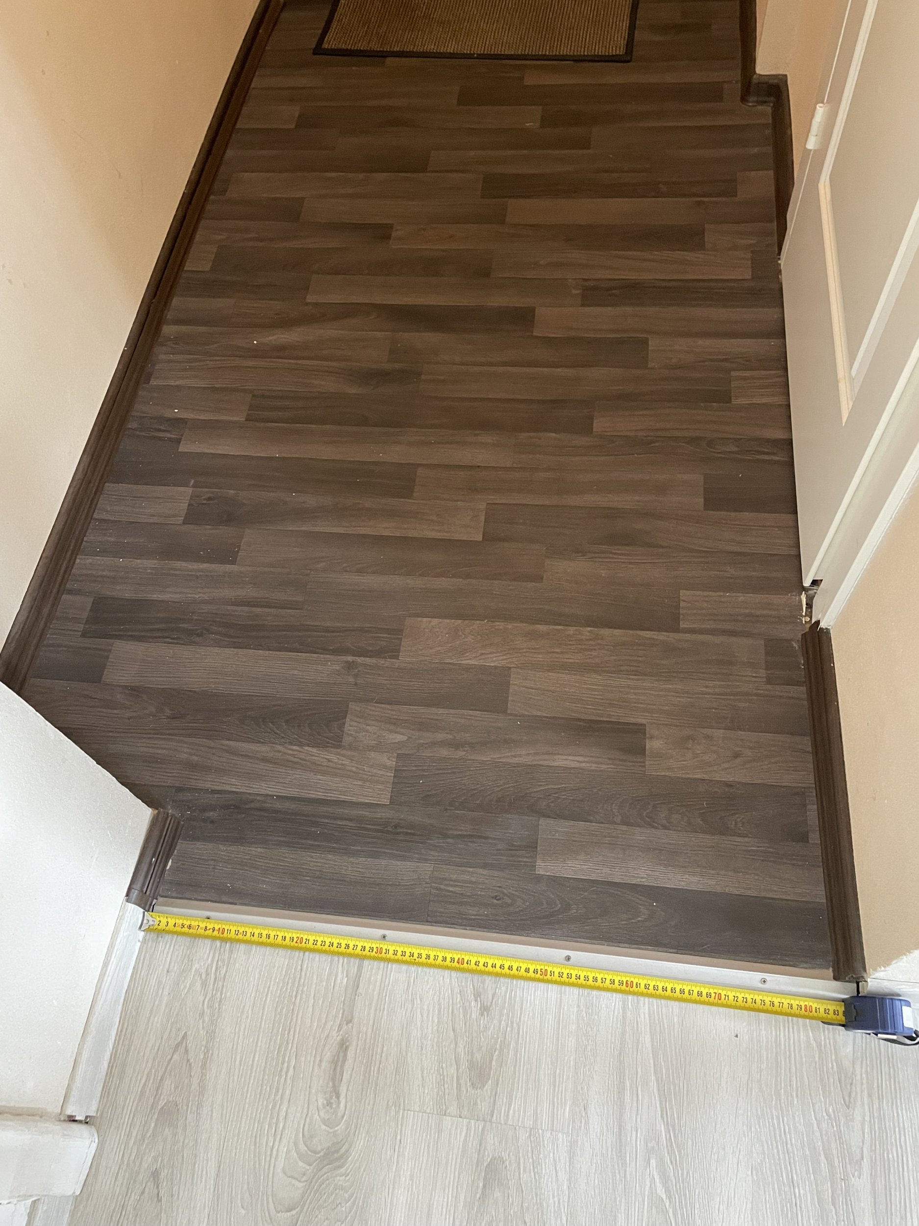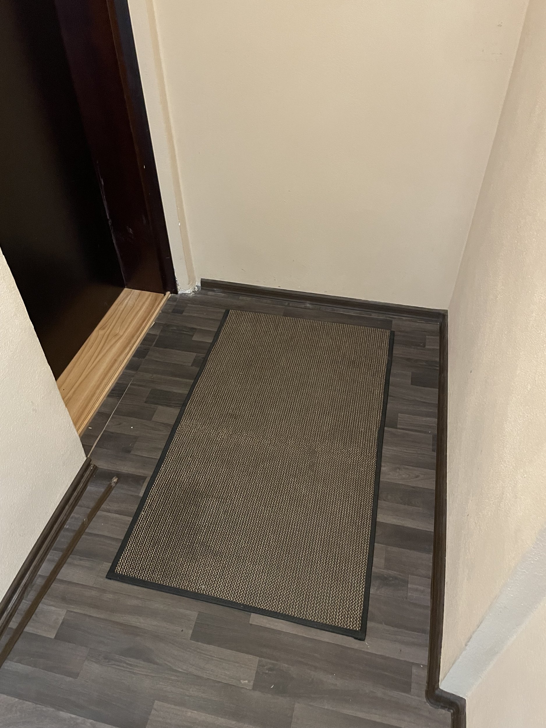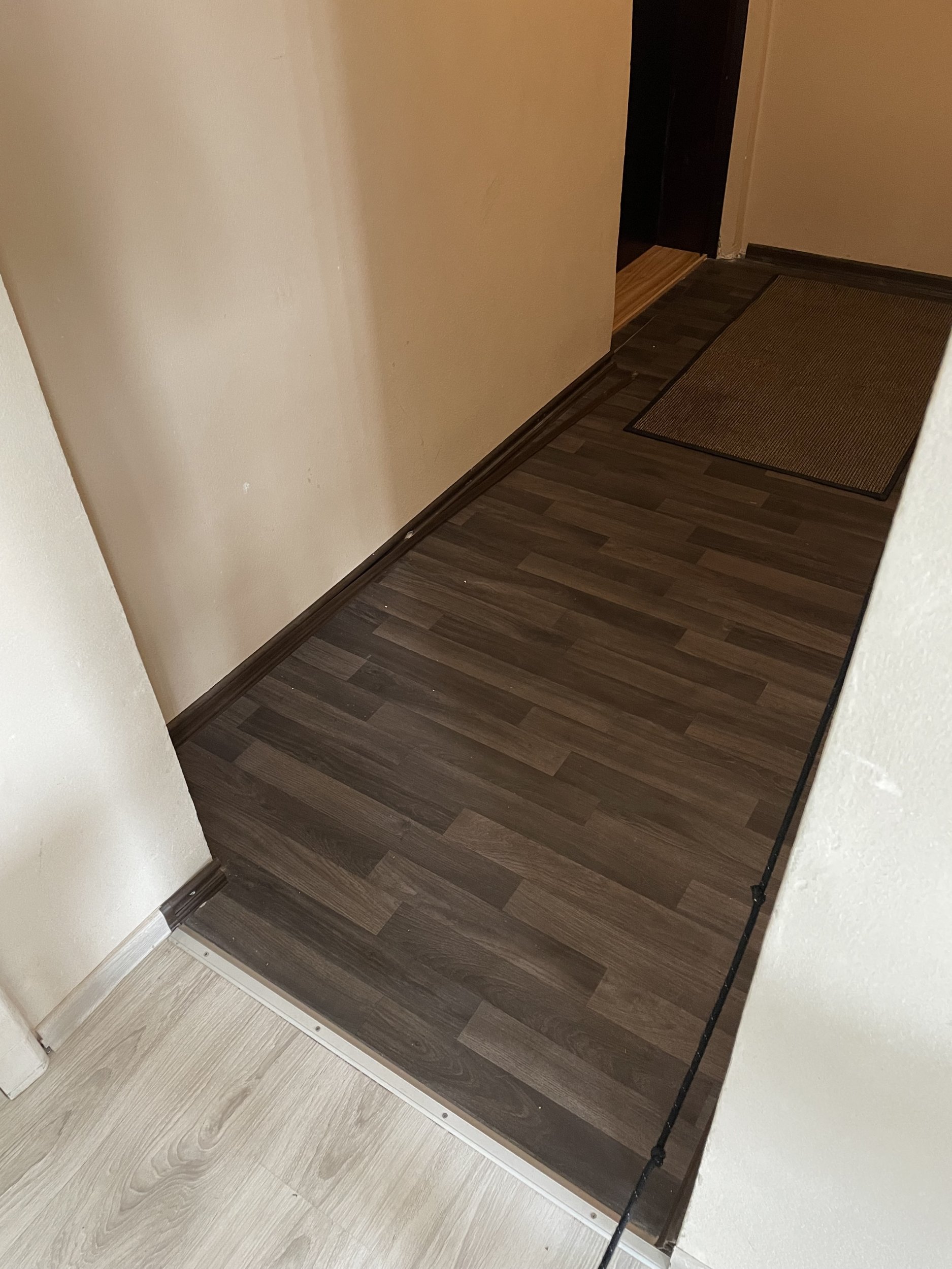 Hetkel koridoris linoleum, mis on vaja eemaldada. Esiku pikkus 3 meetrit. Laius 1,15 m.