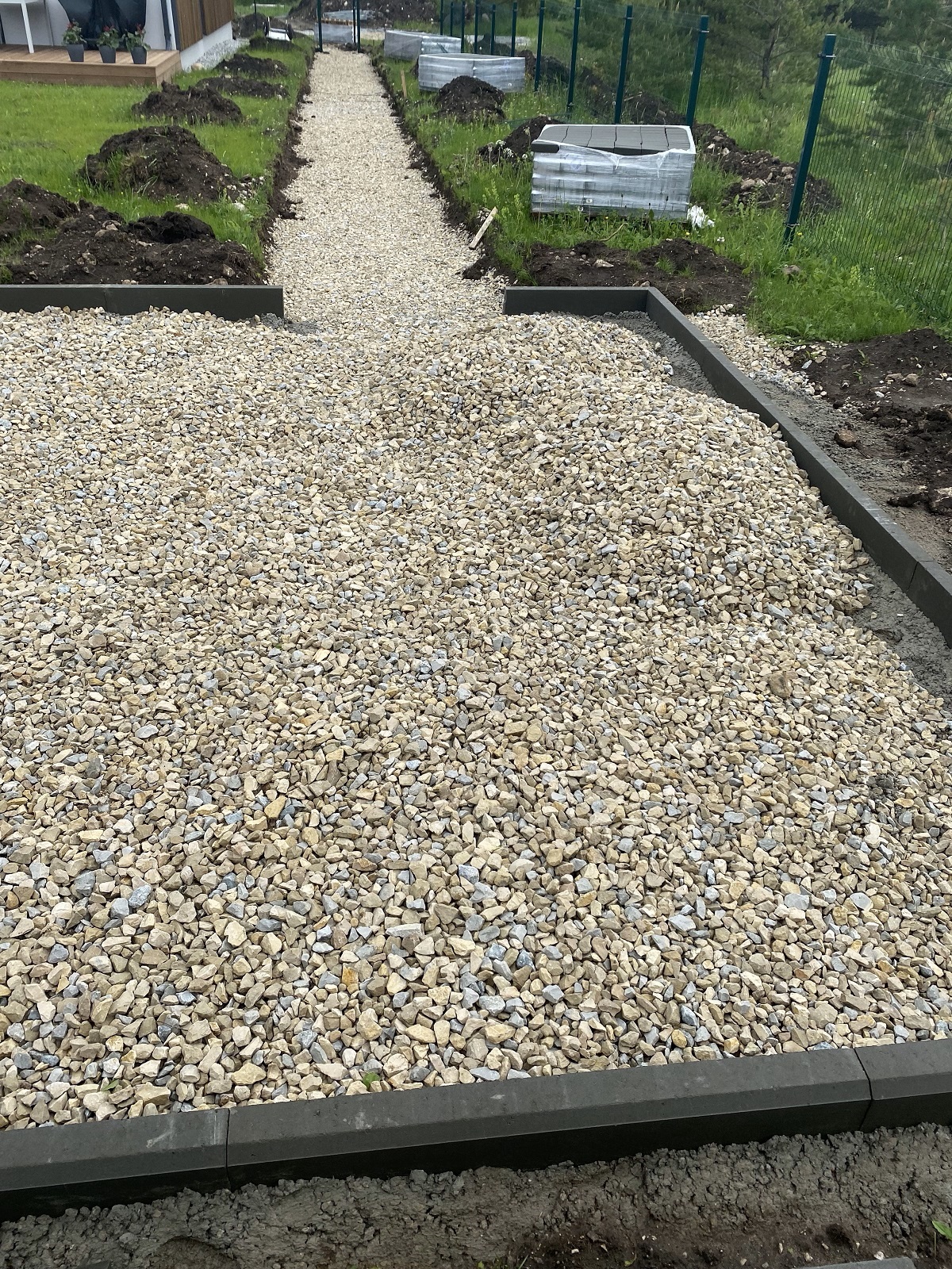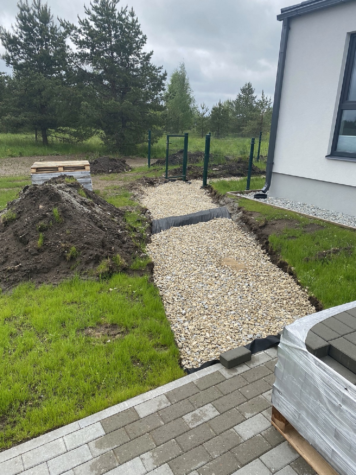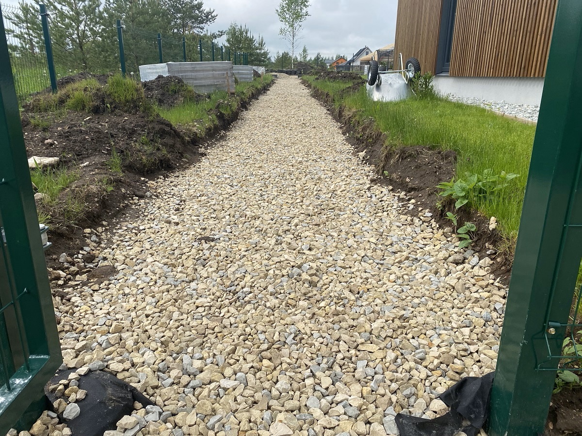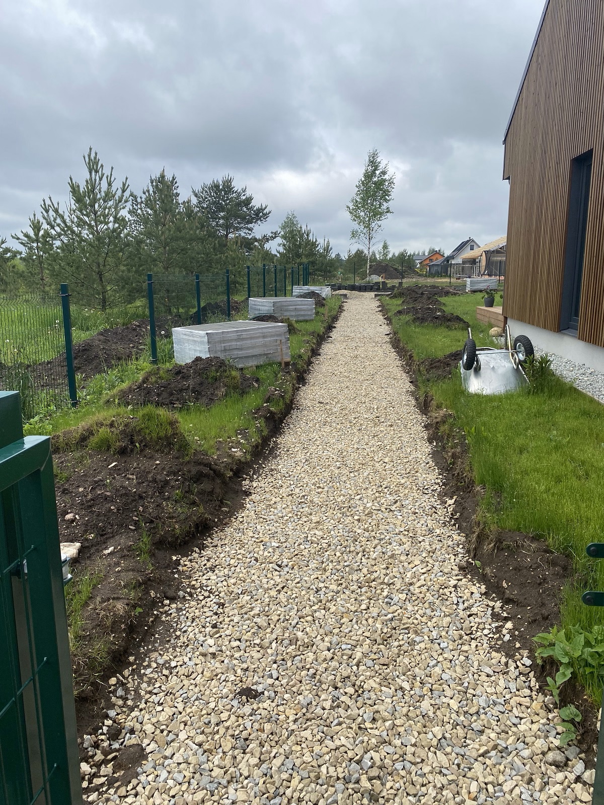 Kõnnitee 44,5m2 (37m pikk ja 1,2m lai). Tänavakivi Nunna 60 + plastik ääretugi.