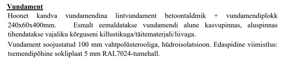 Hinnapakkumine sisaldab: geoteedi teenus (maja maha märkimine), pinnase koorimine ja ettevalmistus, killustikupadja rajamine ja tihendamine, Eesti Traadi moodulid koos betoneerimisega, armeeritud ja betoneeritud vundament Columbia plokist, kanalisatsiooni ja veetorude paigaldus (maja sisene), tagasitäide liivaga (tihendatult), põrandasoojustuse paigaldus, põranda armatuurvõrgu ja kandurite paigaldus, põrandakütte torude paigaldus, kollektori paigaldus ja survestamine, põrandaplaadi valamine ja lihvimine (kopteri pind). Ettemaks on mõeldud materjalide eest. Teostatud tööde eest tasumine etapiti. Soovi korral võimalus tellida ka väitrasside (vesi, kanal, elekter) paigaldus liitumispunktist kuni majani.