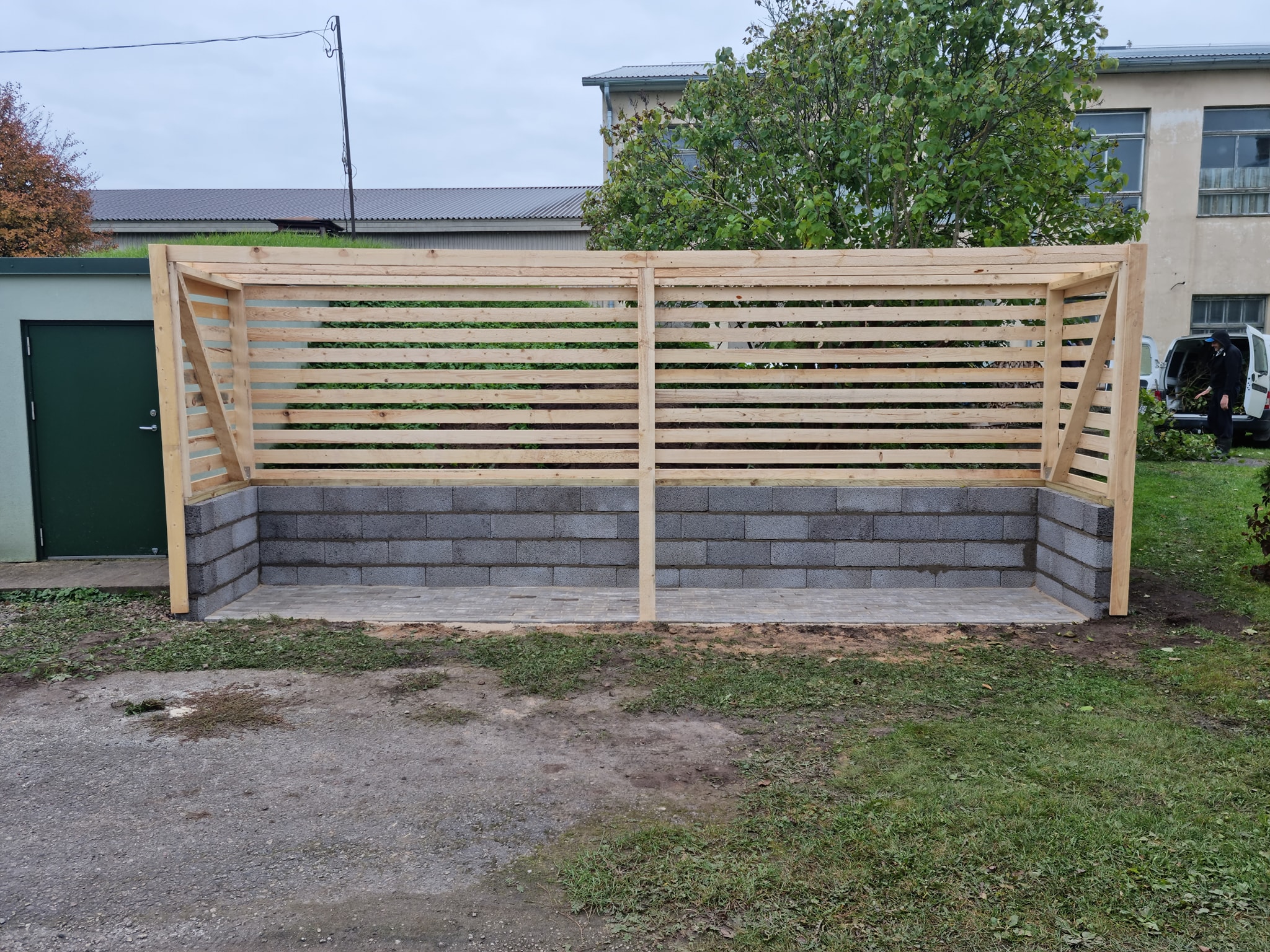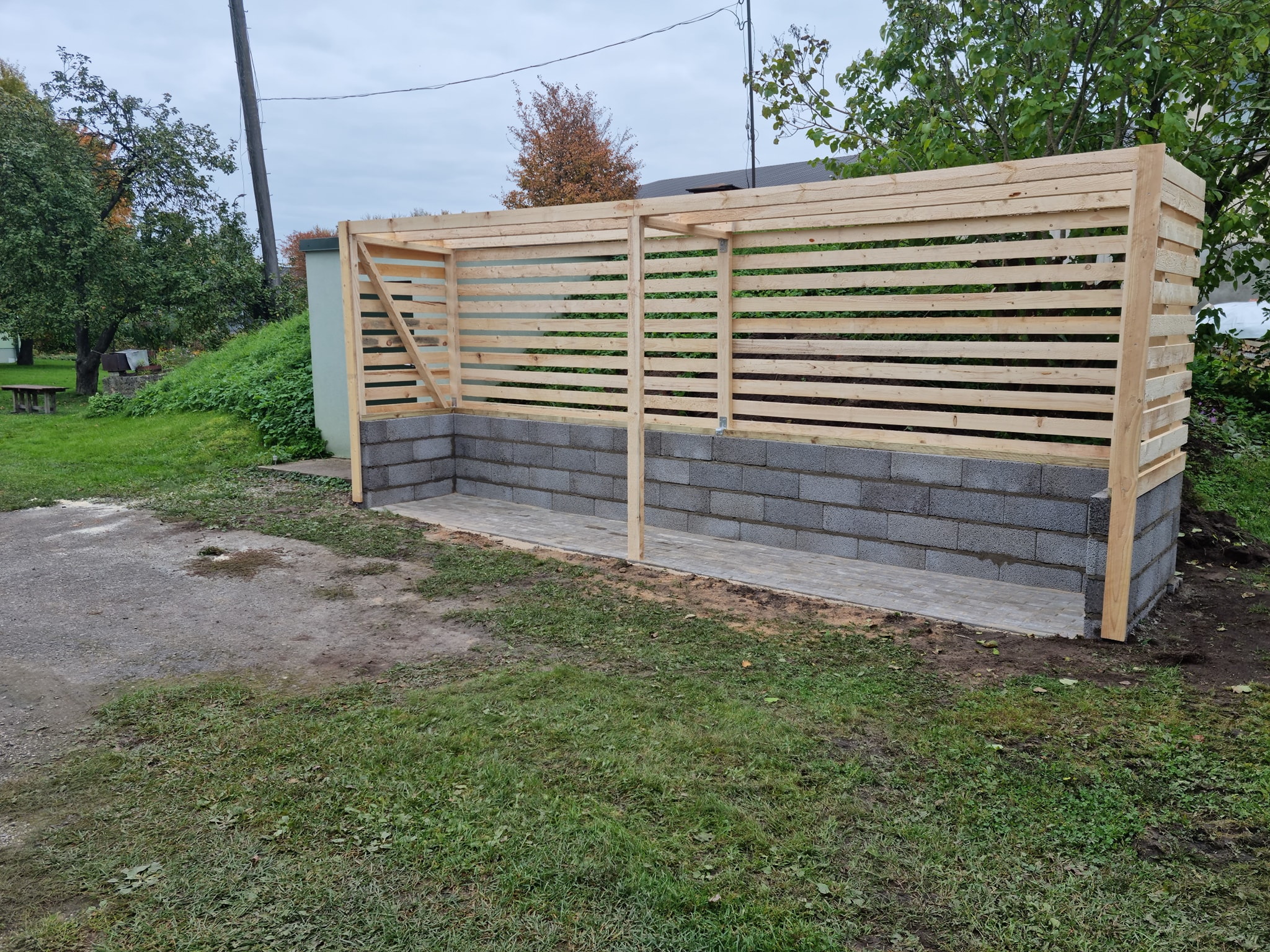 Varjualuse mõõdud 6400x3000 ja 2500 kõrge. Fotodel oleval varjualusel on all plokkidest äär, meie seda ei soovi. Kogu karkass oleks puidust.