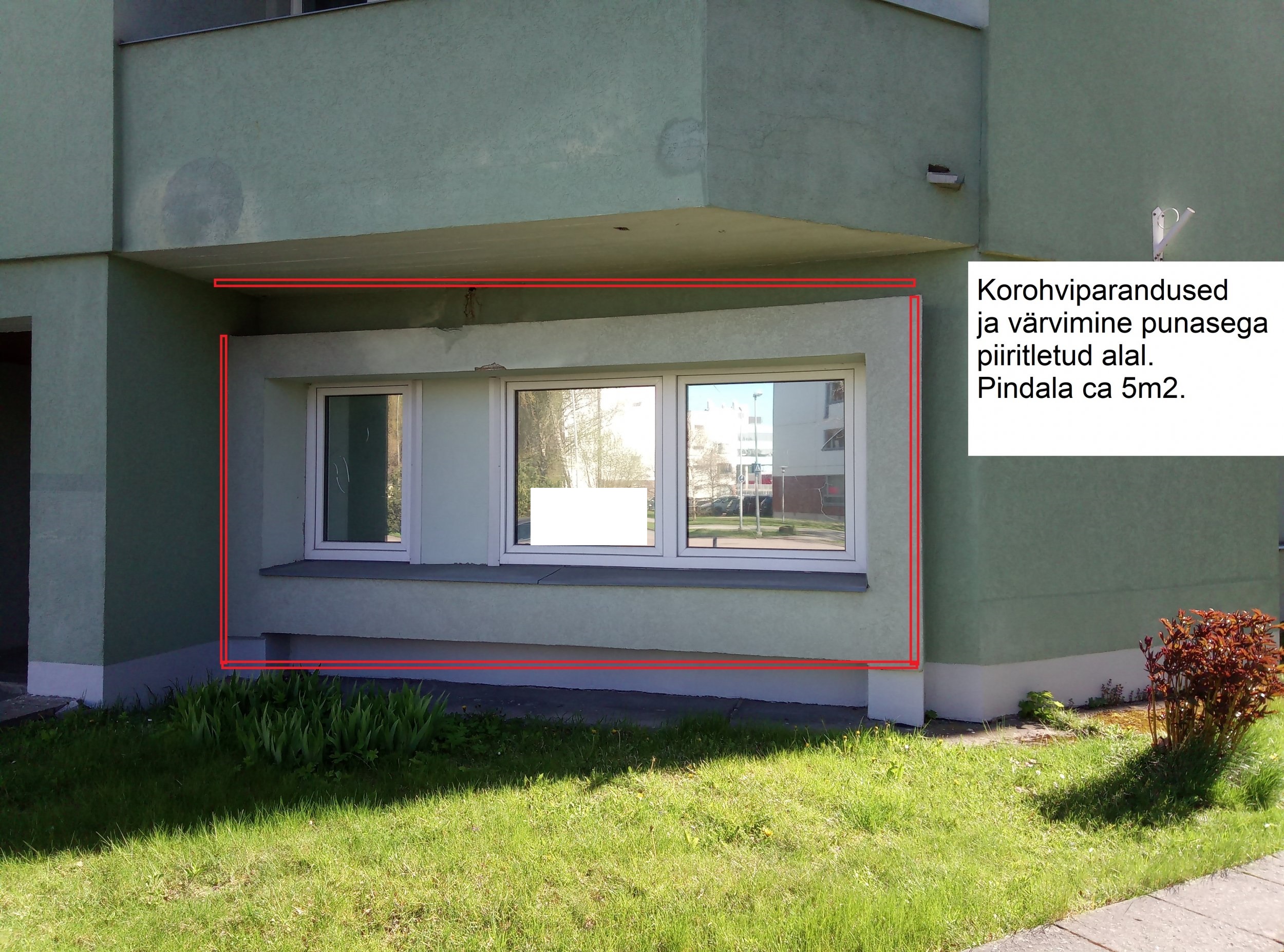 Fassaadiparandused pindalal ca 10m2. Suurematele kahjustatud pindadele tugev armeersegu ja võrk, vajadusel ka armeernurk . Hoone kolmekorruseline, kõrgus 10m.