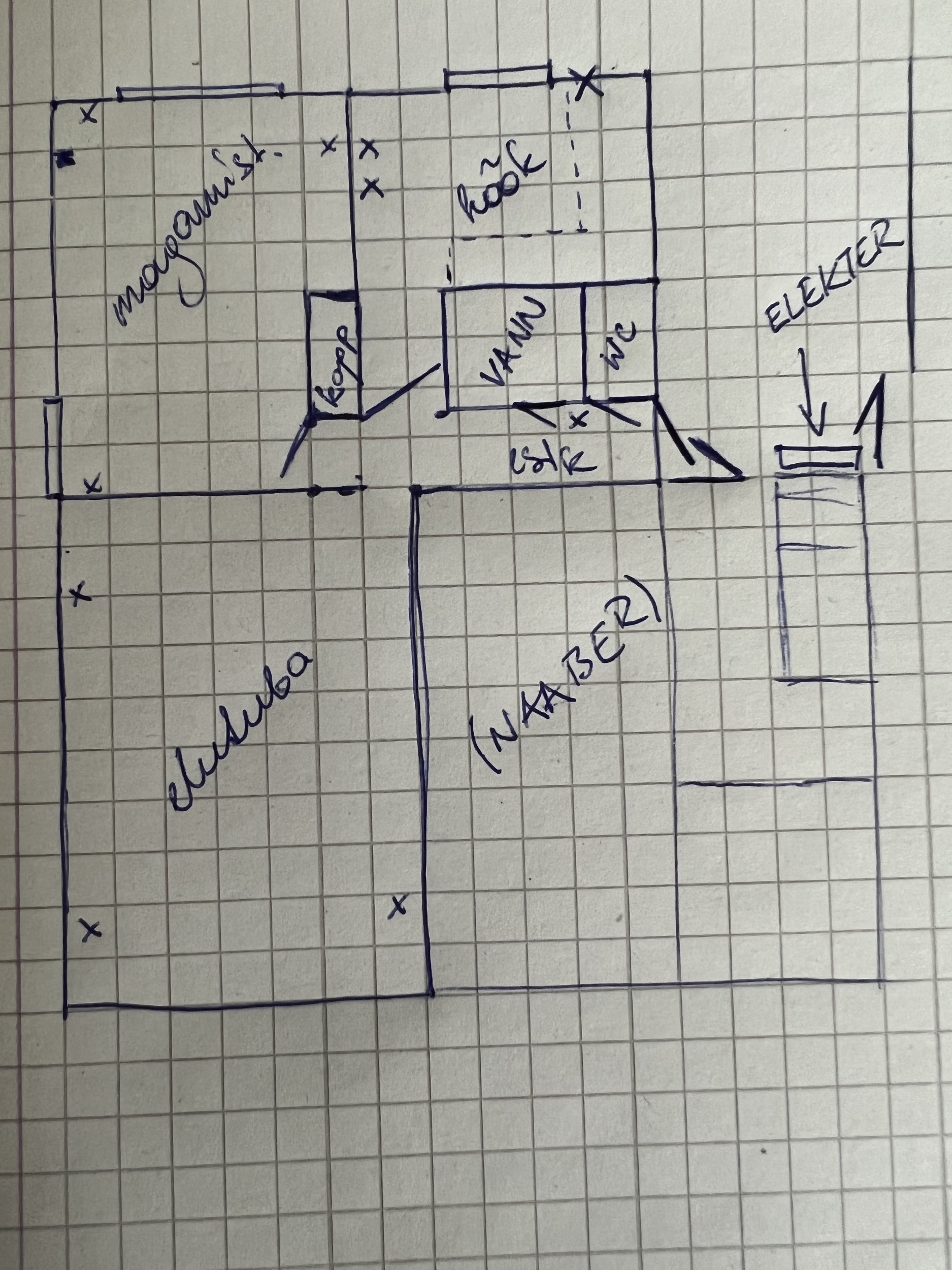 Vaja luua/juhtmed vedada pistikutele kööki saabuva mööbli taha (pliit, ahi, õhupuhastaja, nõudepesumasin, külmkapp) ja vannituppa (pesumasin). Lisatud korteri umbkaudne plaan, x-ga märgitud olemasolevad pistikupesad. Köögimööbli asukoht punktiiriga.