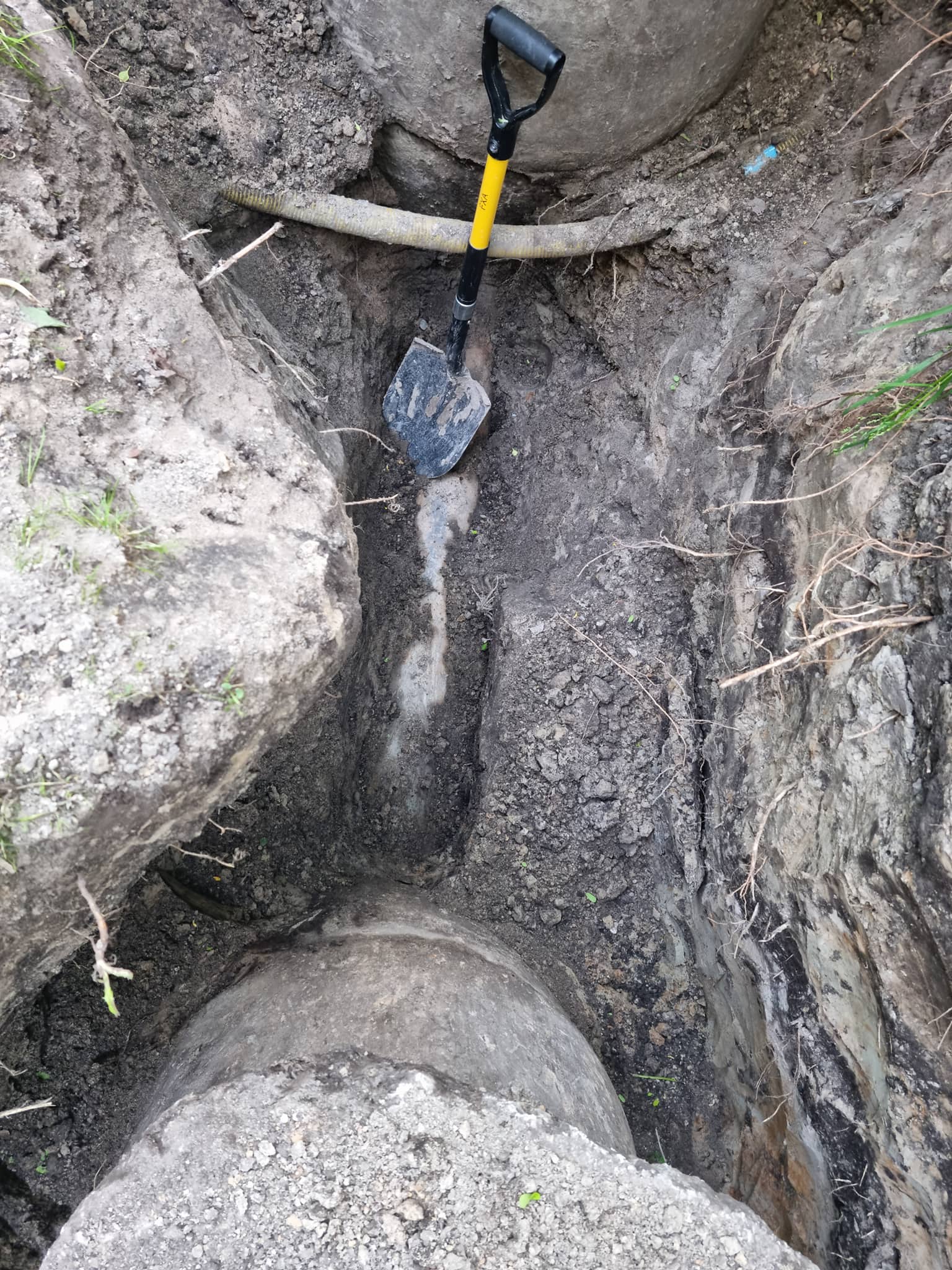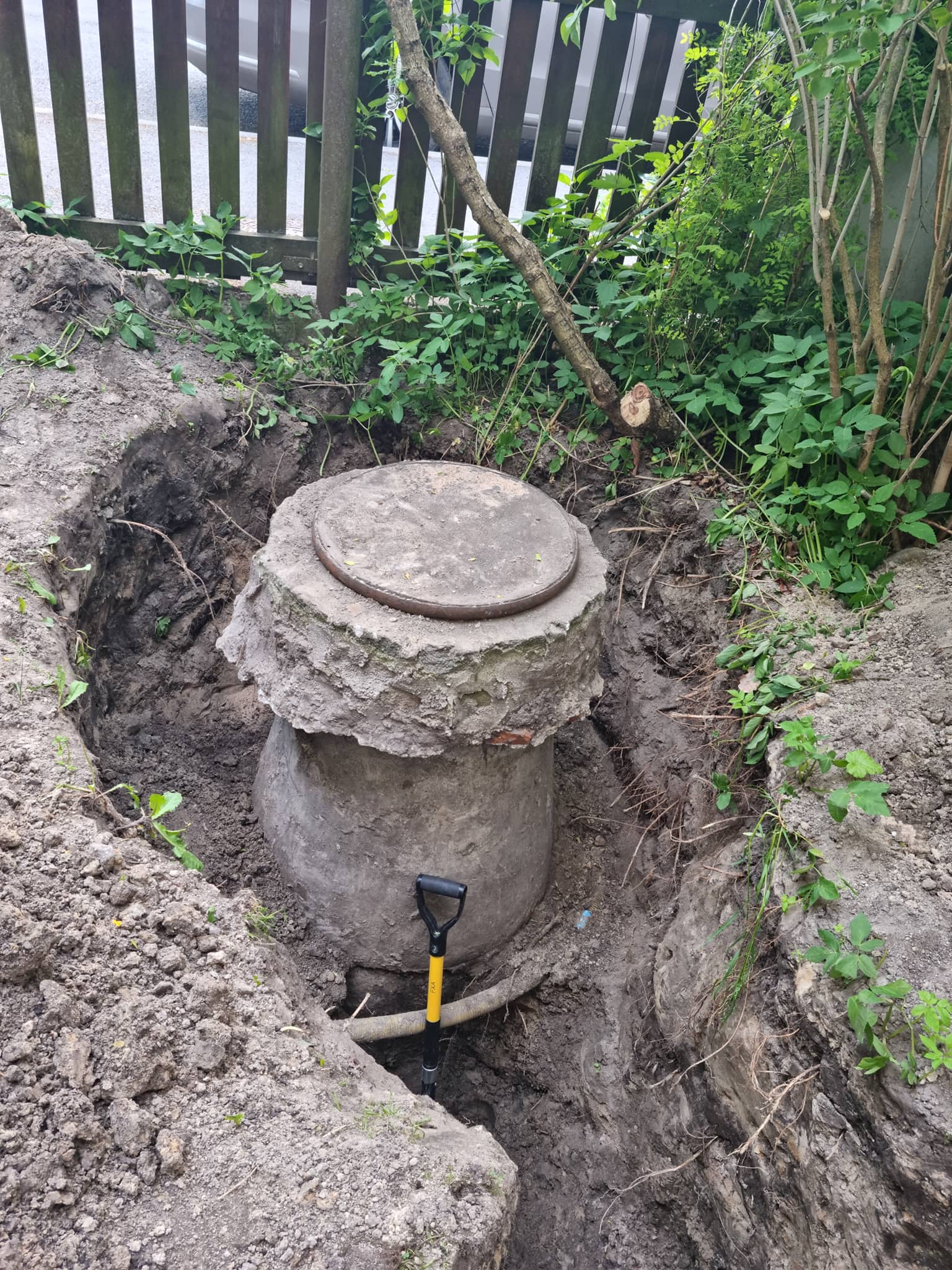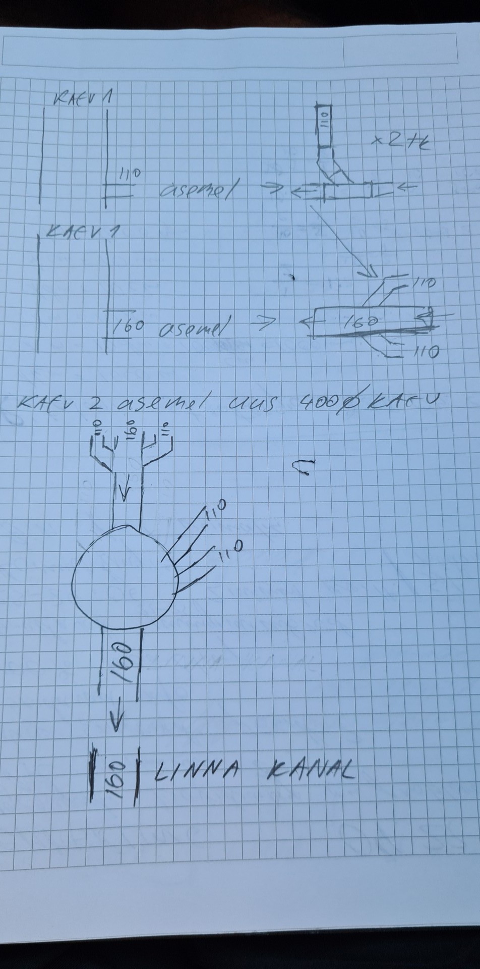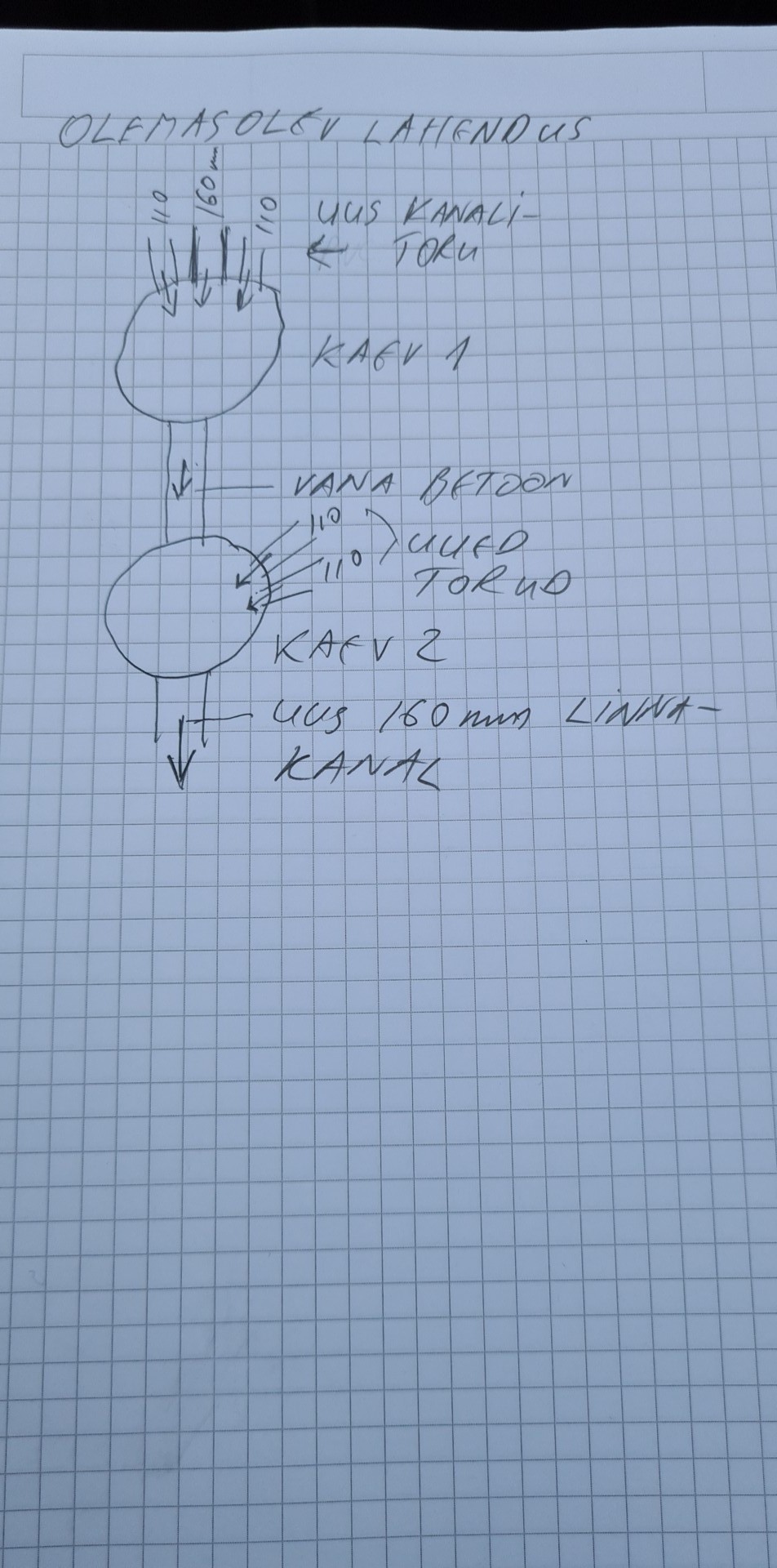 Tuleb demonteerida 2 vana betoonkaevu ja nende vaheline vana betoontoru, et majast tulevad uued torud ühendada linnakanalisatsiooniga, mis on 160mm. Majast tuleb välja esimesse kaevu 3 toru, üks 160mm toru ja kaks 110 mm toru. Esimene kaev kaotatakse. 110mm torudele tuleks teha kolmiku abil puhastusväljavõte maapinnale ja siis liita nad 160mm peatrassiga. 160mm trass viia uude kaevu, mis tuleb olemasoleva 2. kaevu asemele. 2. kaevu tuleb sisse kaks 110mm toru.
