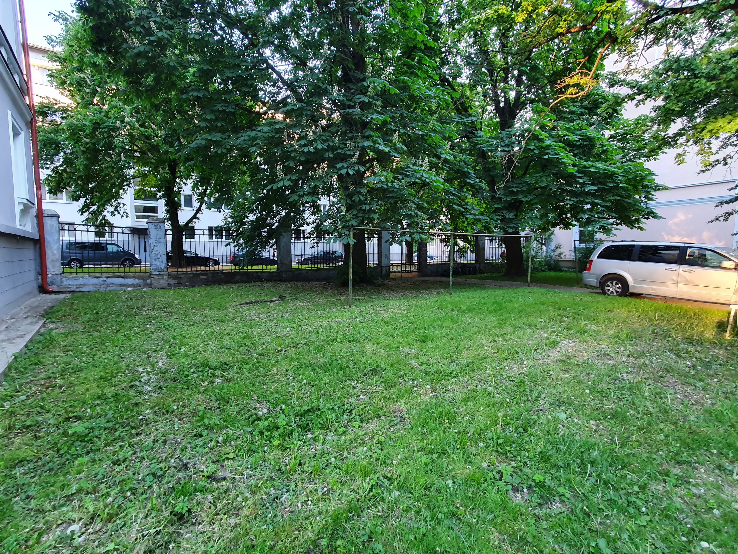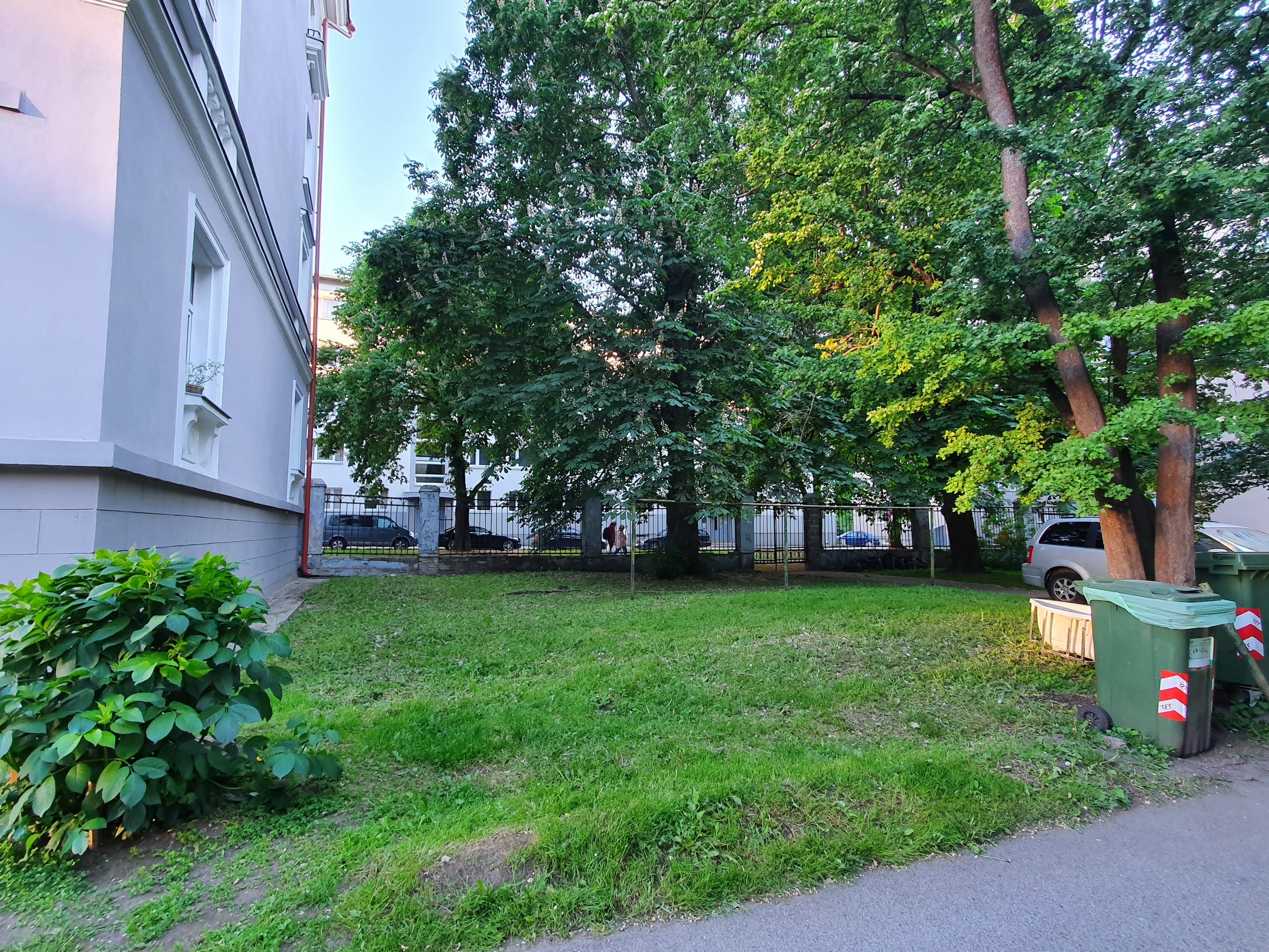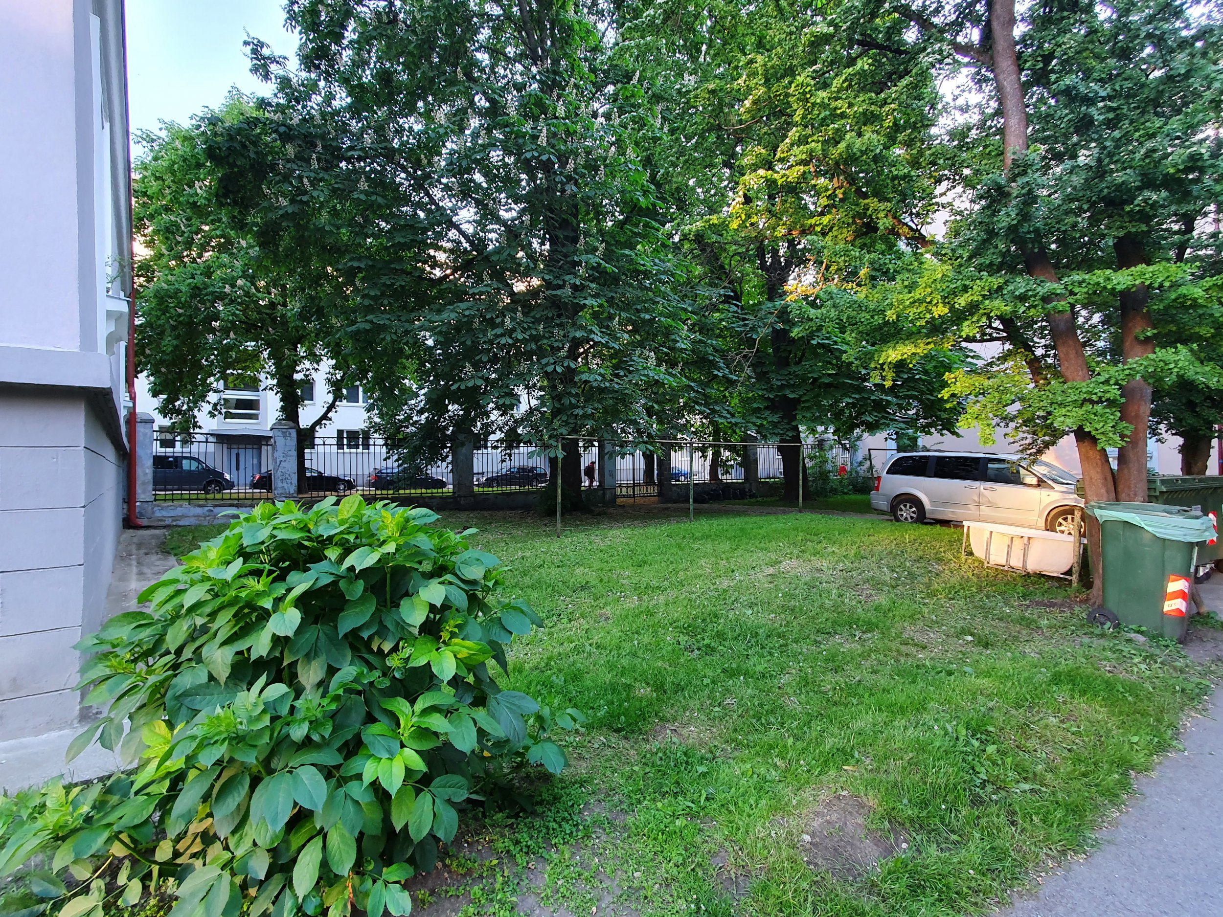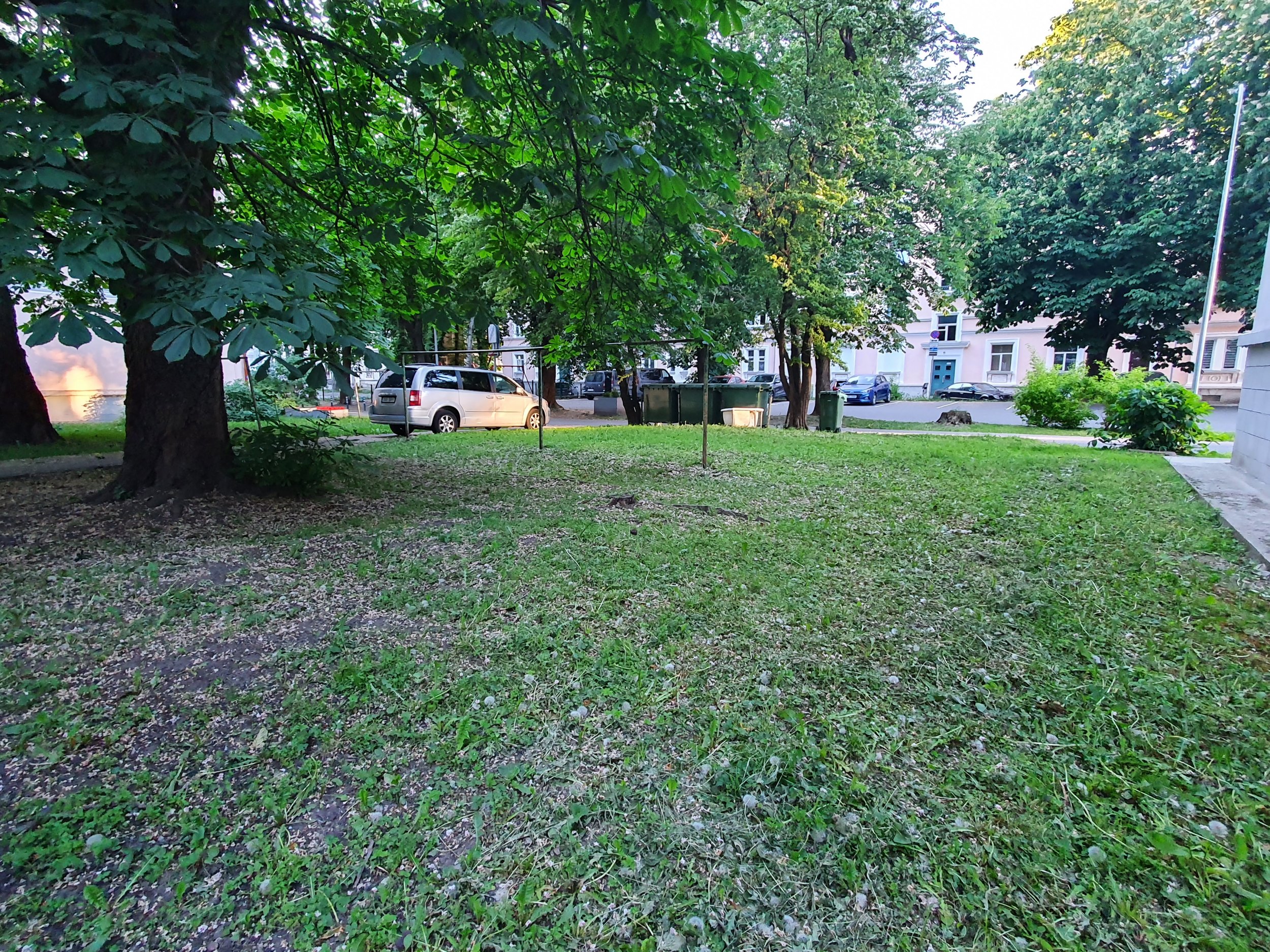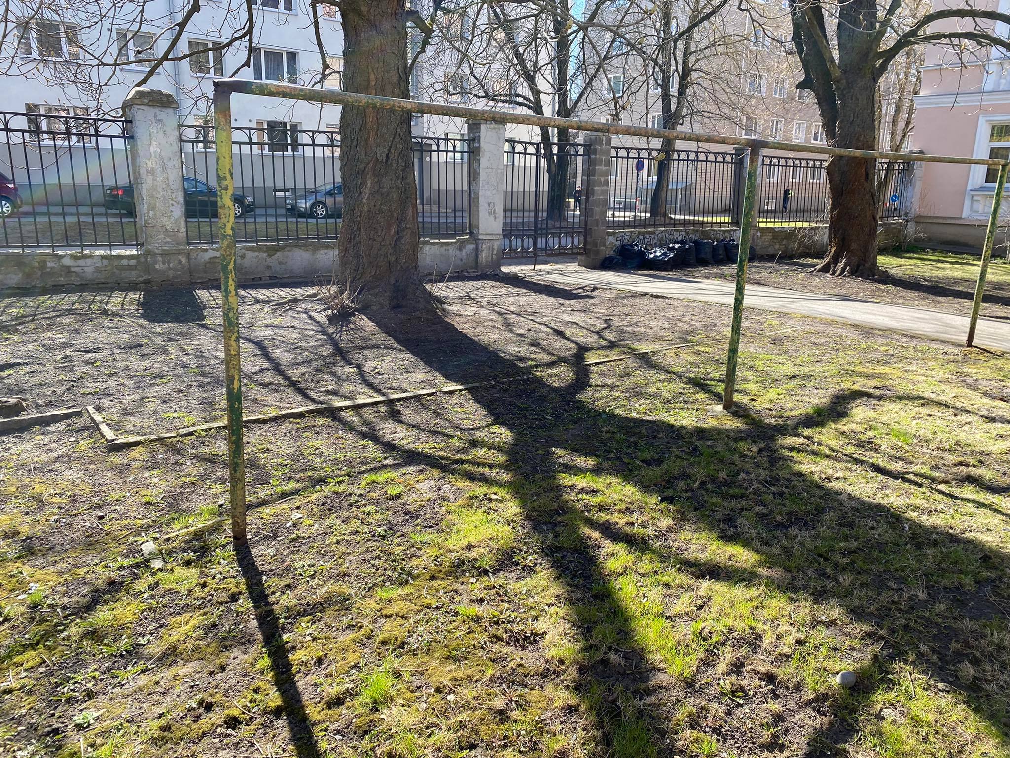 Korterelamu kõrval asuva muruplatsi tasandustööd, metallist pesukuivatuspuu lammutamine, platsi osaline täitmine mullaga, muru külvamine.