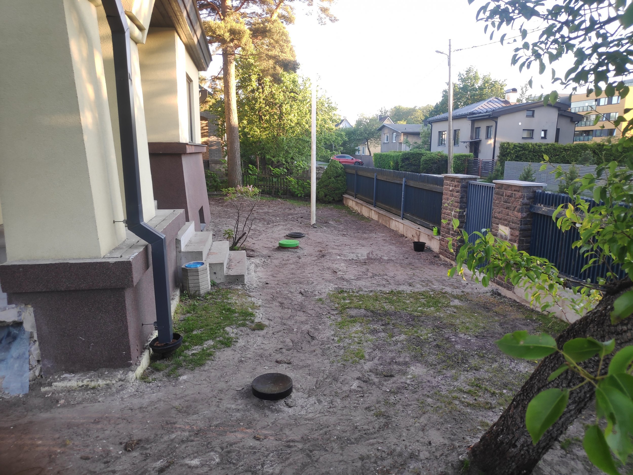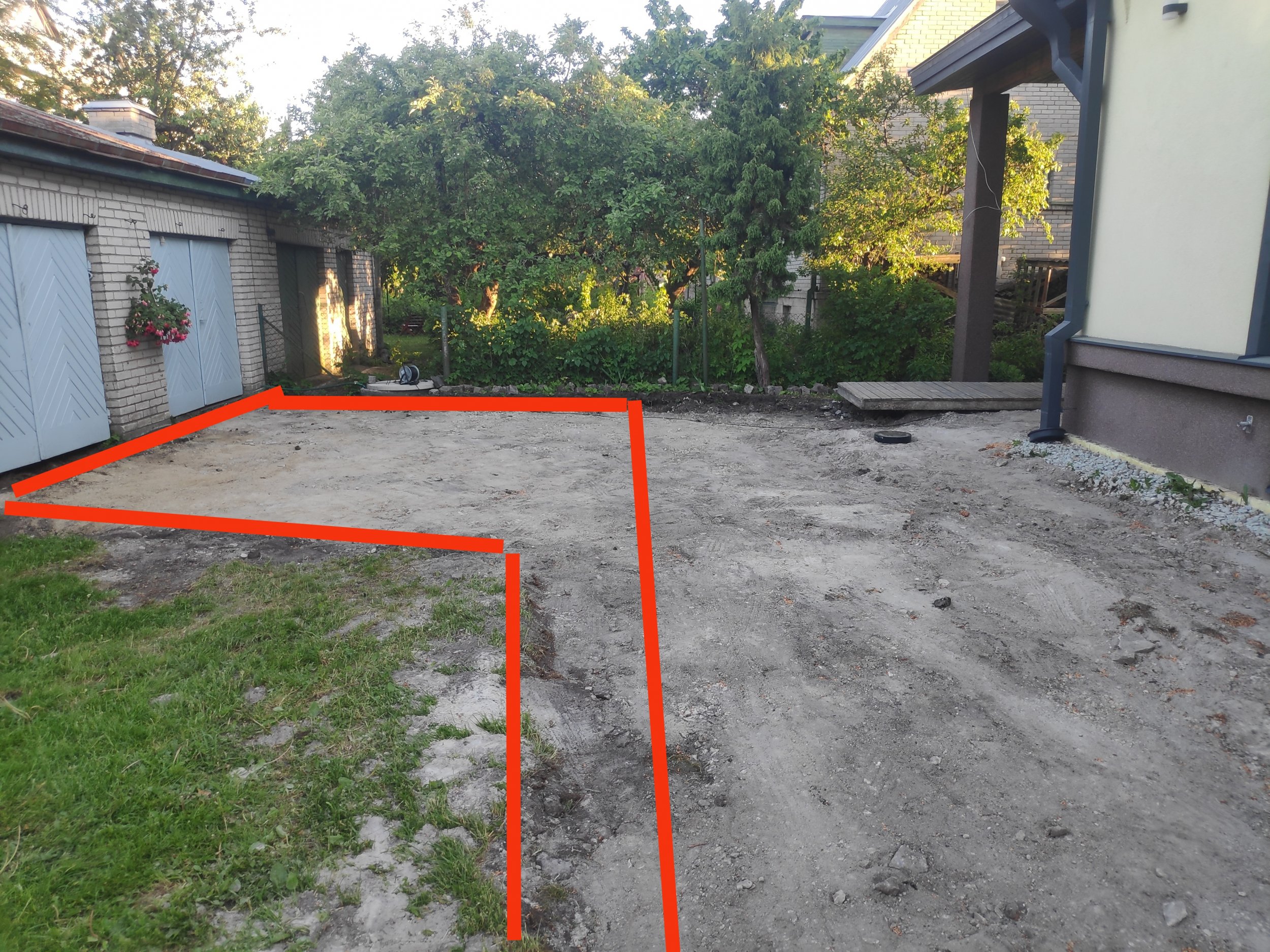 Hoovis toimusid äsja kaevetööd ning maja tagant võeti üles mh. asfalttee. Nüüd oleks vaja uus muru rajada maja ette, külje peale ning ka osaliselt maja taha - garaaži ees olev ala, kus enne oli asfalt. Märkisin punase joonega ära piltidel, kuhu antud töid peaks tegema.