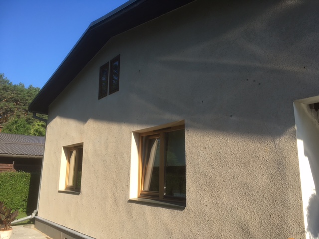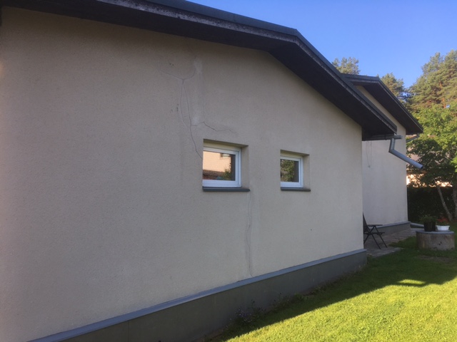 Ühekorruselise elamu välisfassaadi 150 m2 ülekrohvimine. Fassaad on 30a tagasi lubi-tsement pritskrohviga kaetud.