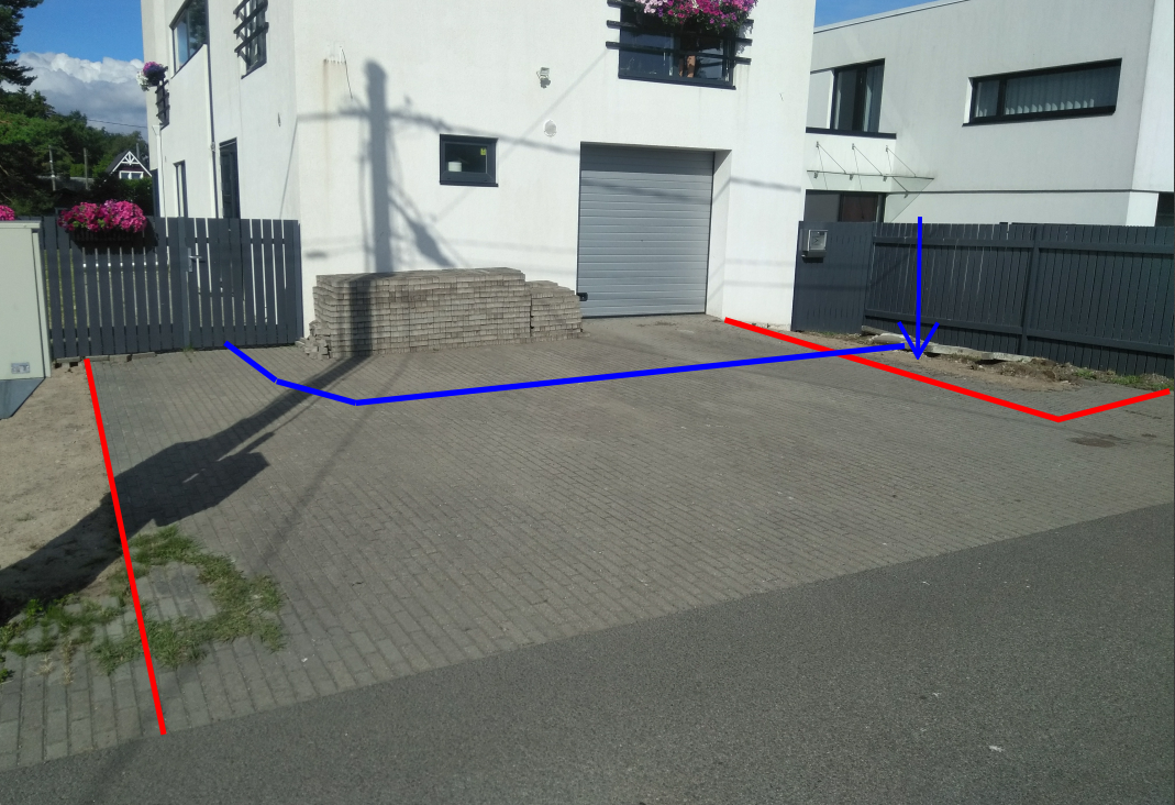 Lisaks tuleks ehitada u. 10 jm sajuveetoru (110 mm ) sinise joonega esitatud paika. Paigaldussügavus u 75 cm. Toru tuleks liita olemasolevasse sajuveetorusse T-liitmikuga. Olemasoleva sajuveetoru asukoht esitatud sinise noolega, toru sügavus on u. 75 cm maapinnast. Sillutiskivid tuleks peale toru ehitust tagasi paigaldada, liiva ja killustiku saab tõenäoliselt kohapealt. Kui vaja, ostan liiva ja killustiku ise juurde.