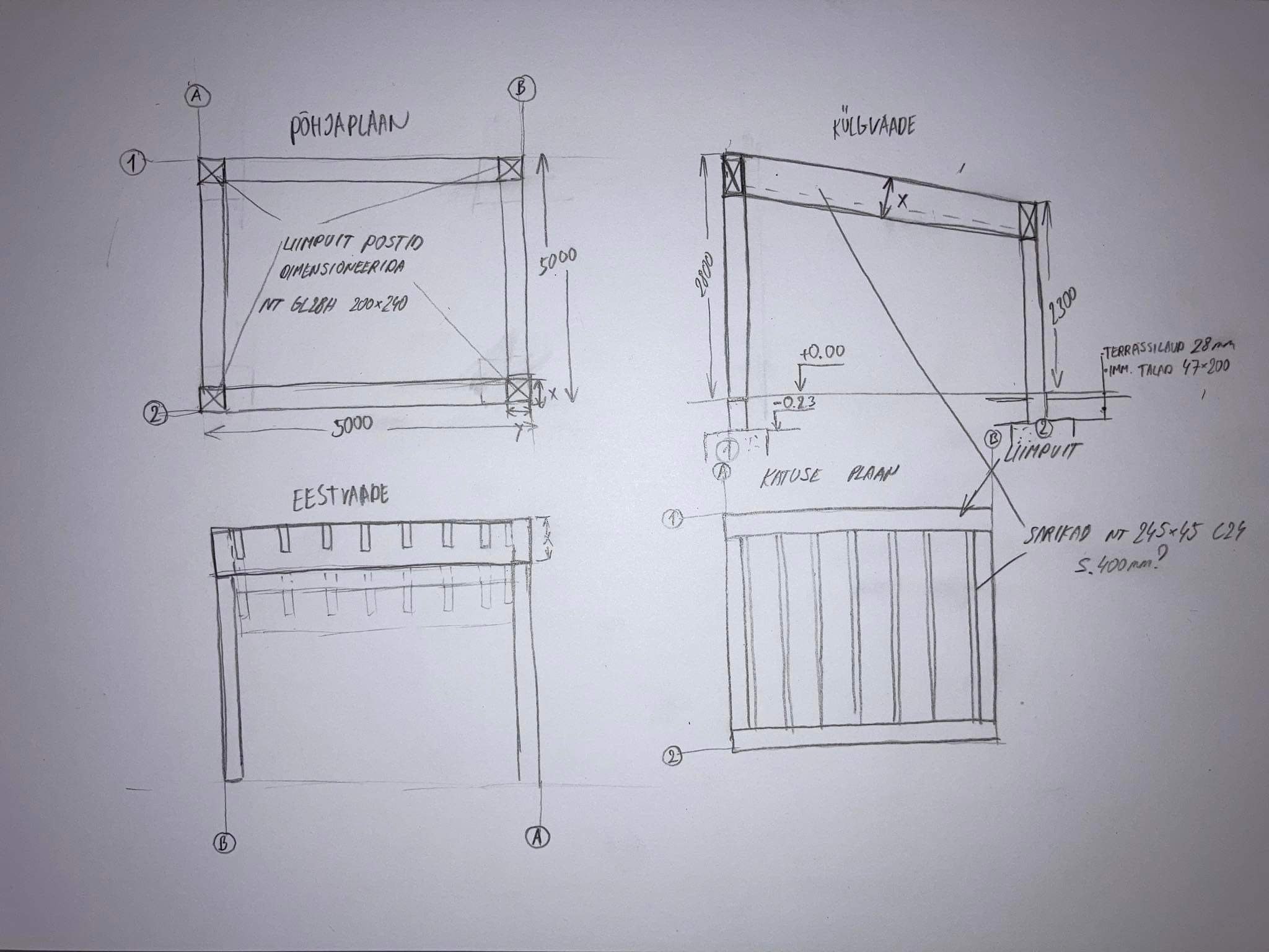 Tere, pakkumise sees on ehitusprojekt koos vajaliku talade ja postide dimensioonerimist (tugevusarvutustega) liimpuidust. Projekt sisaldab ainult katusealune väliköögi projekt, elektriprojekt või vundamendi või vesi-kanal tööprojekt ei ole pakkumise sees.