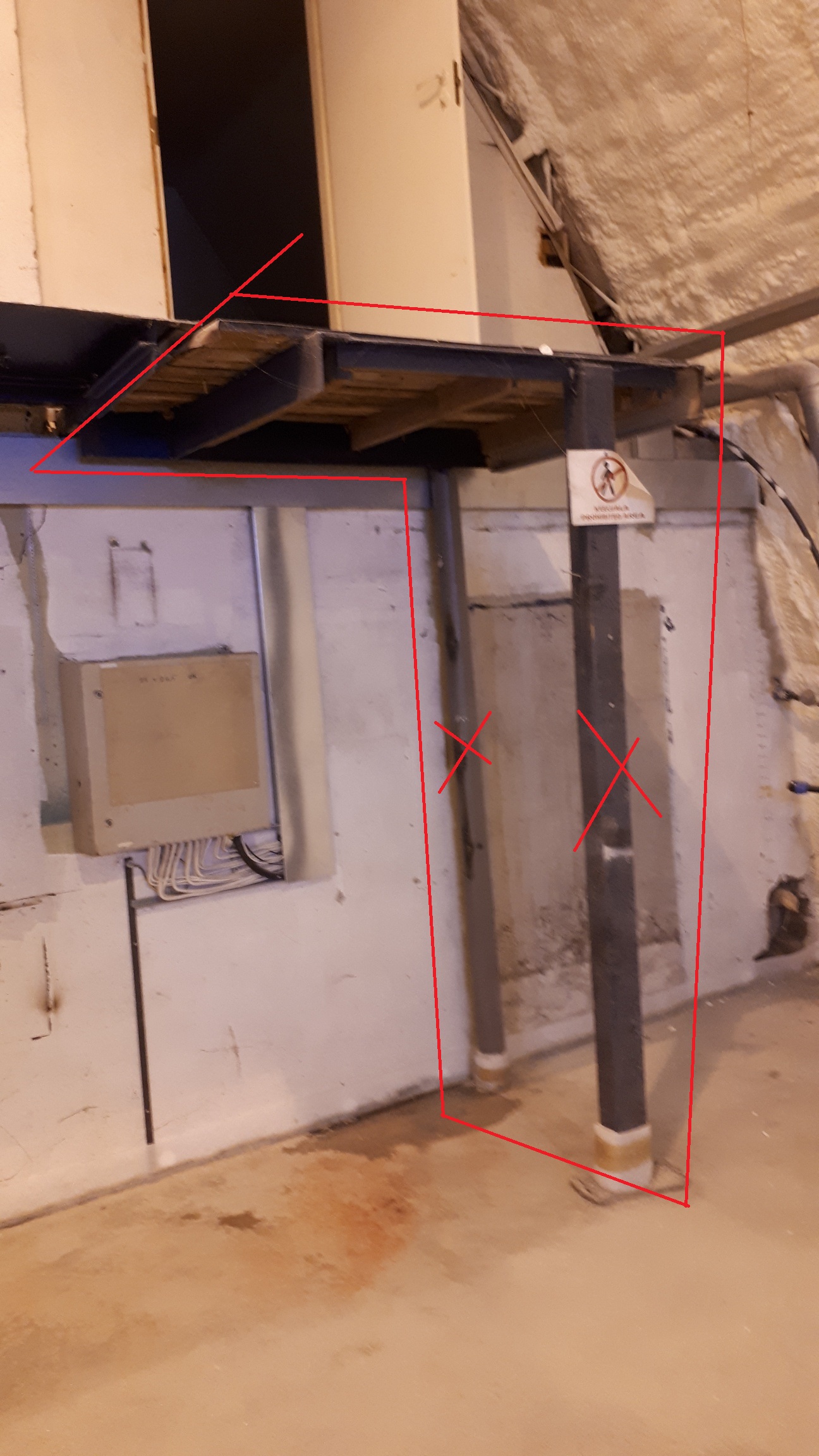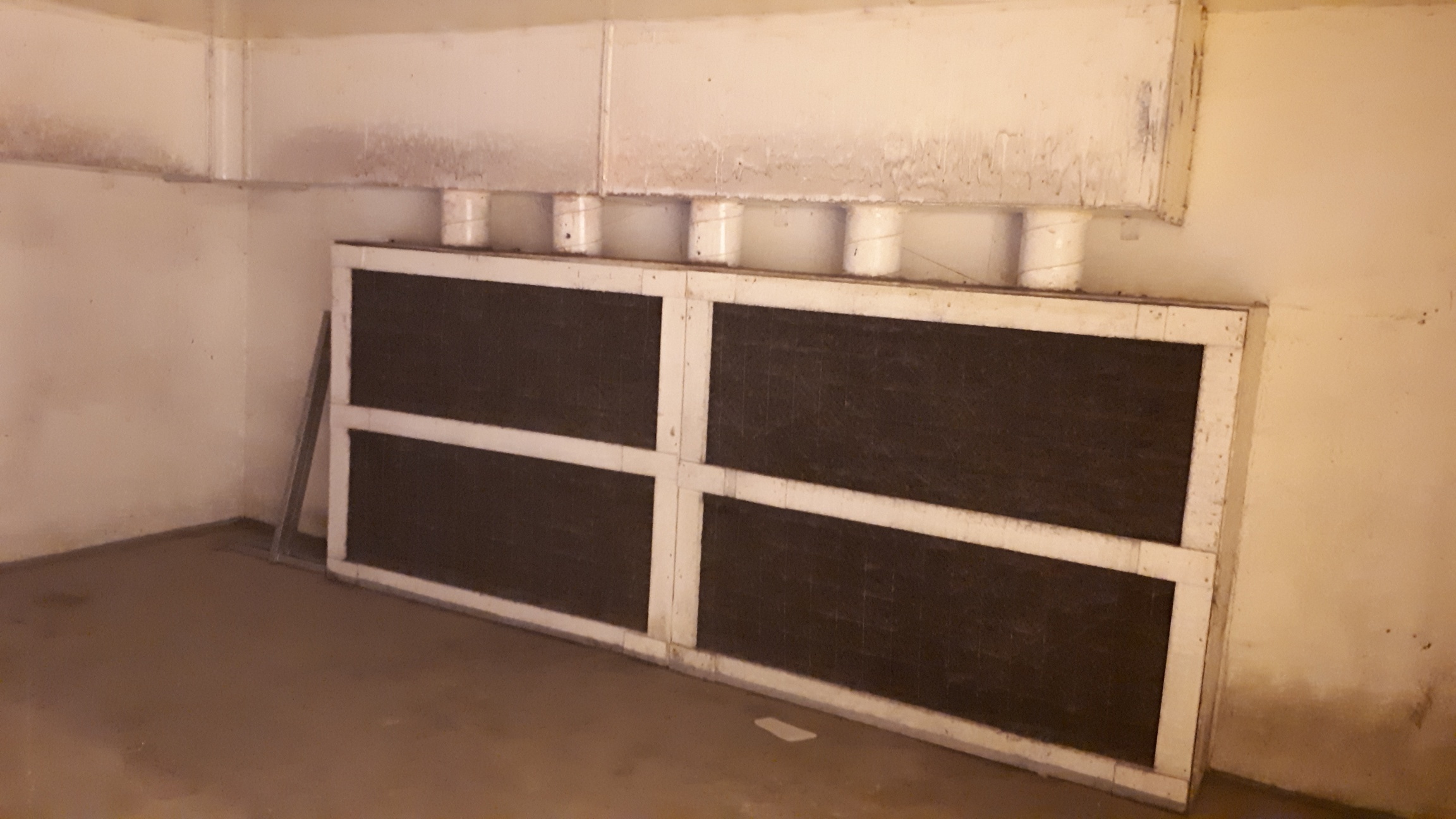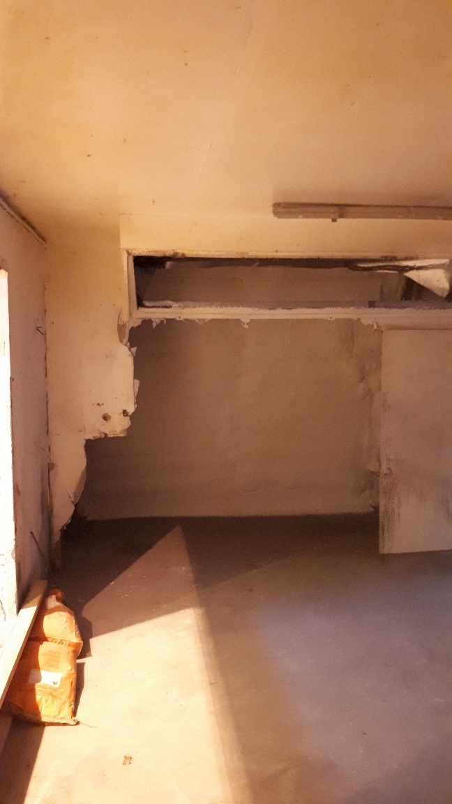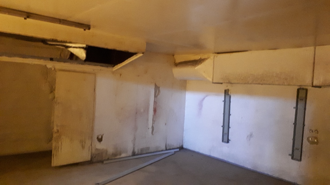 6x6 meetrit ruum, kõrgus 2m, lagi ja mõned seina osad on kaetud plekiga, kinnitatud kruvidega. Osa kruvisid on näha, suurem osa on kaetud pahtli ja värviga. Lisaks mingi ventilatsioonikarp ja toru, kõik plekist. Plekk vaja eemaldada.