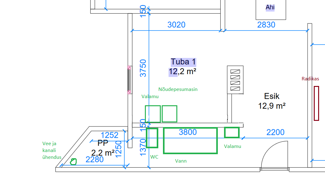 Vaja on luua joonisel märgitud seadmetele vee ja äravoolu ühendused (rohelised) ja ka umbes 7m küttetrassi radikani (katel saab olema samas nurgas kuhu vesi jookseb, joonisel PP)