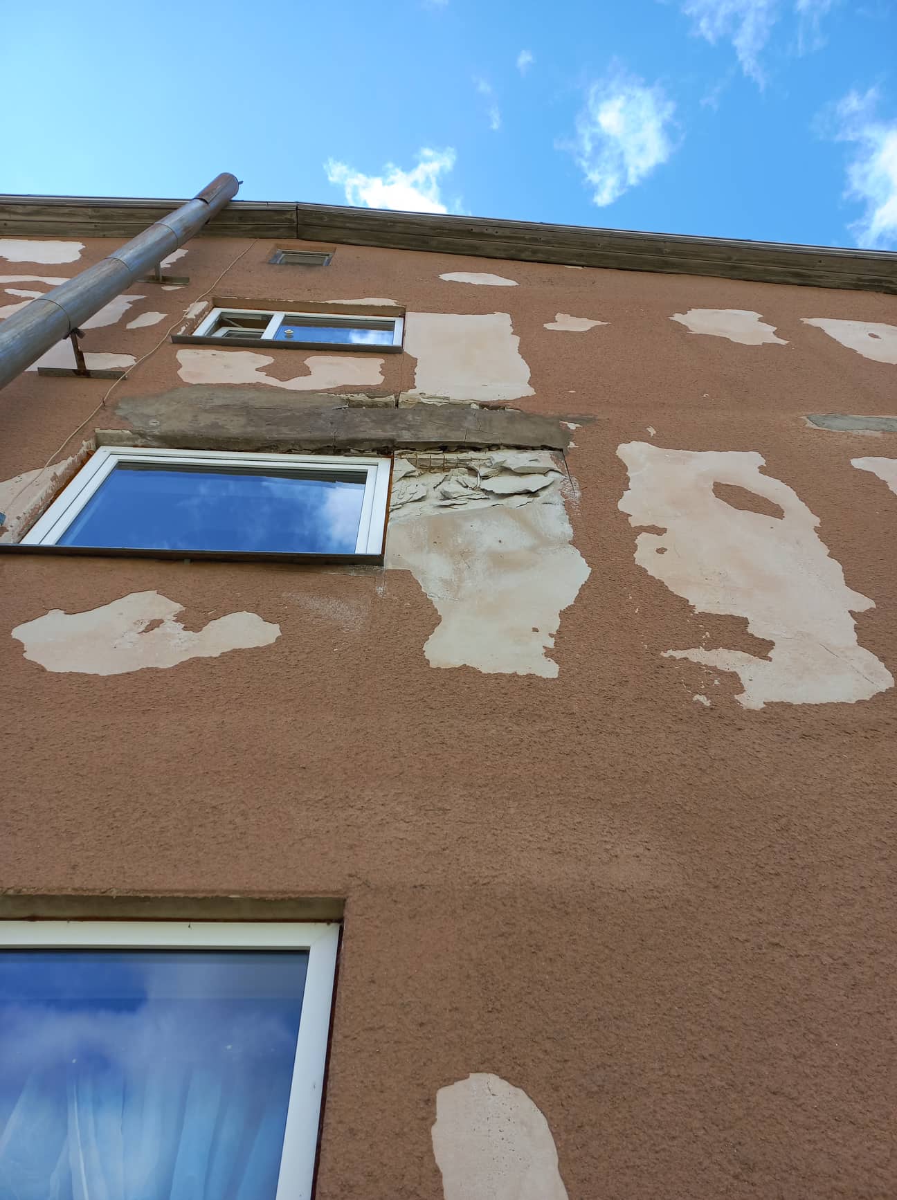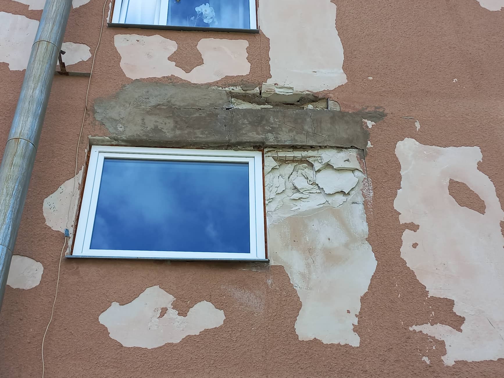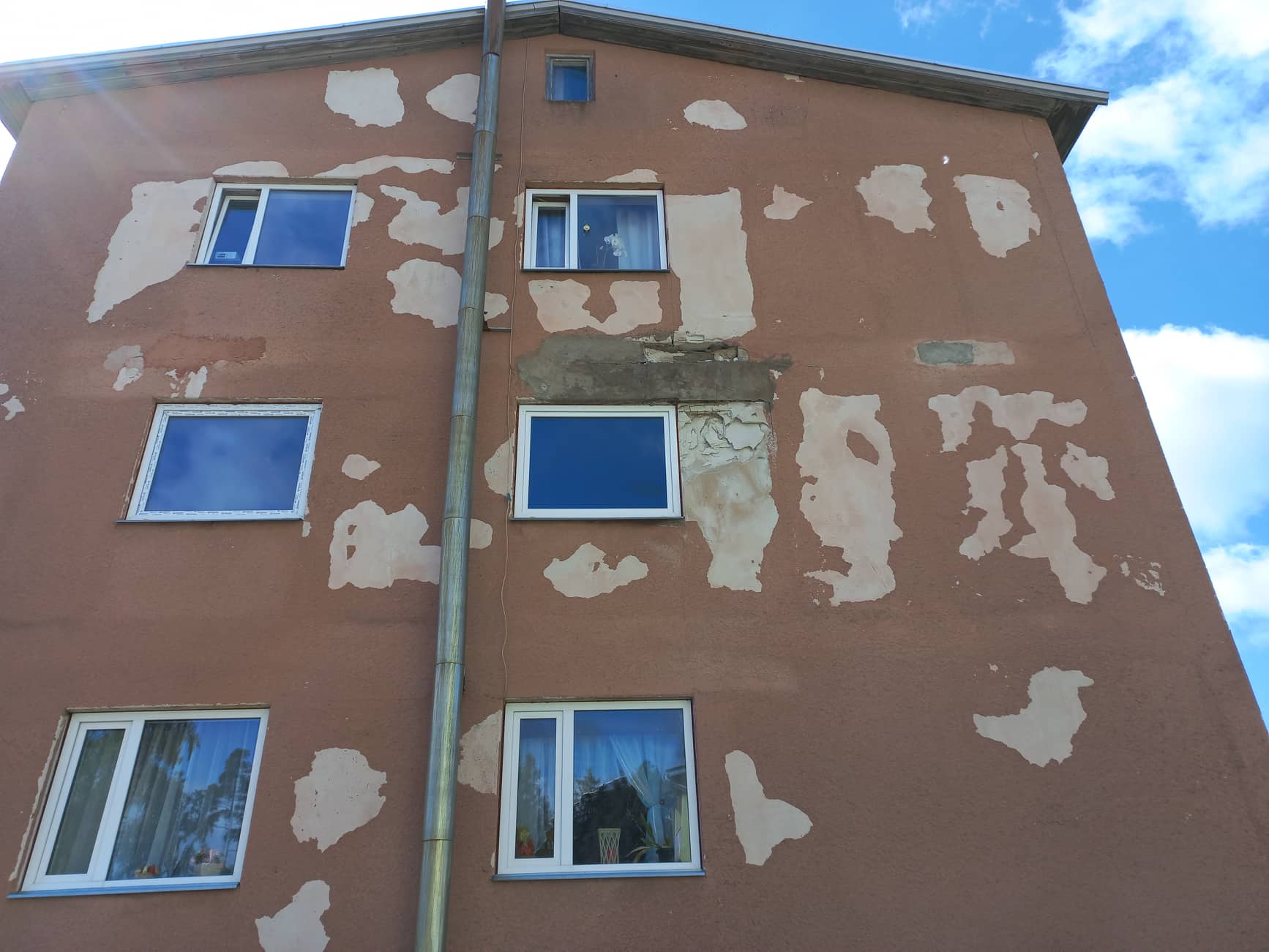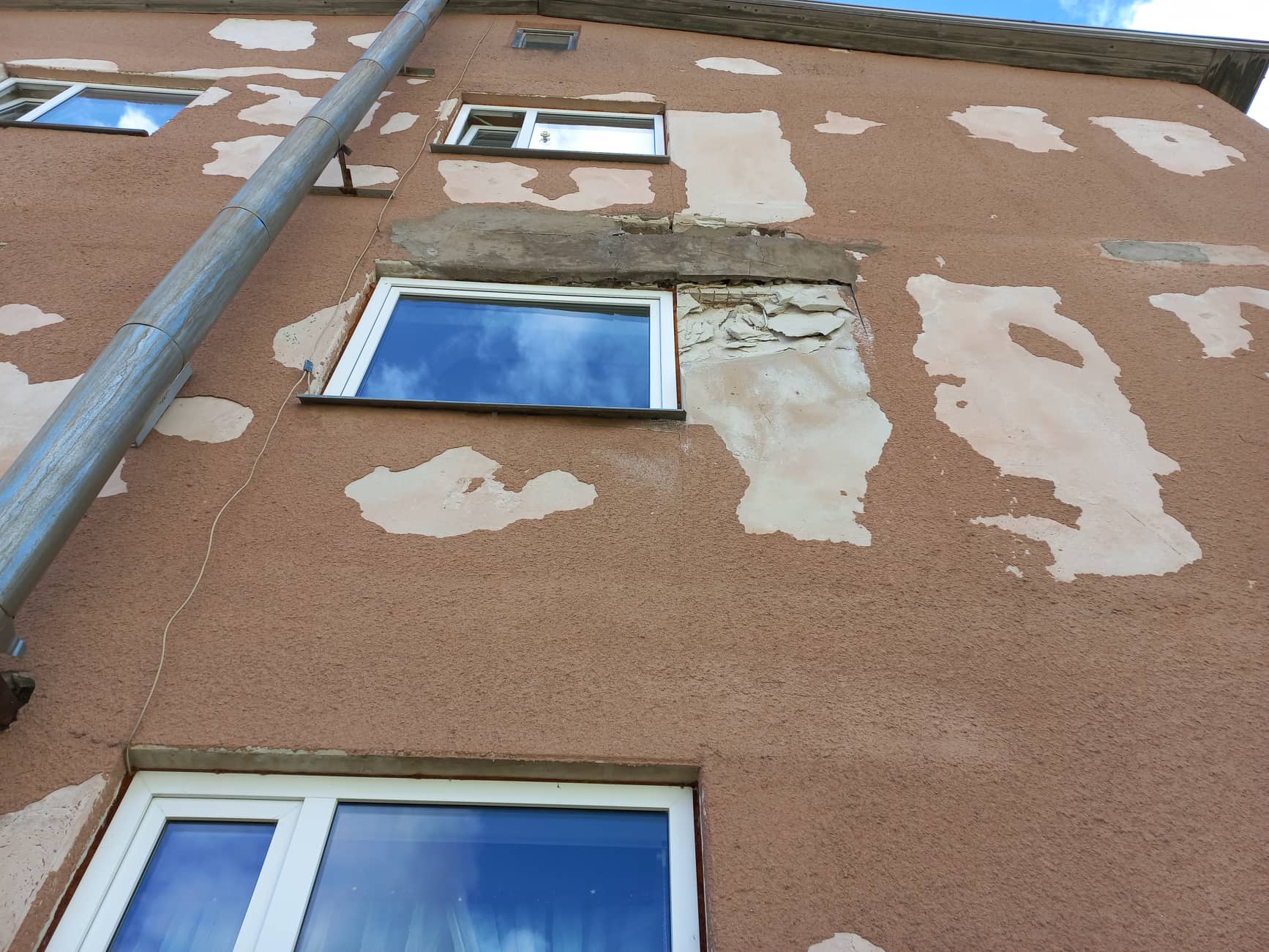Aastaid tagasi veekahjustuse saanud ja parandatud fassaadi uuesti parandamine. Parandust vajab otsasein teise korruse akna kõrvalt/ülevalt.