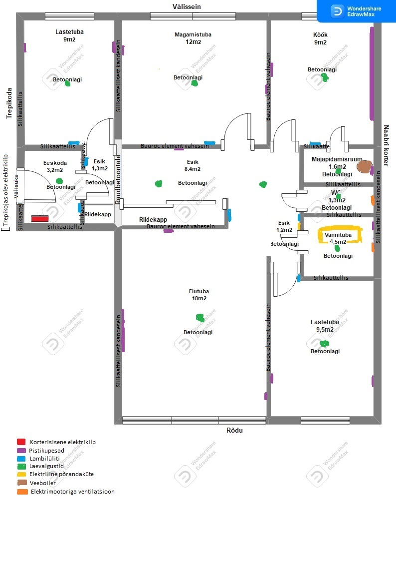 Korteril pole elektriprojekti. Valmistasin oma käel korteriplaani, kus on märgitud värvitoonidega( pistikud, lülitid, laevalgustid, jne) umbkaudsed asukohad.