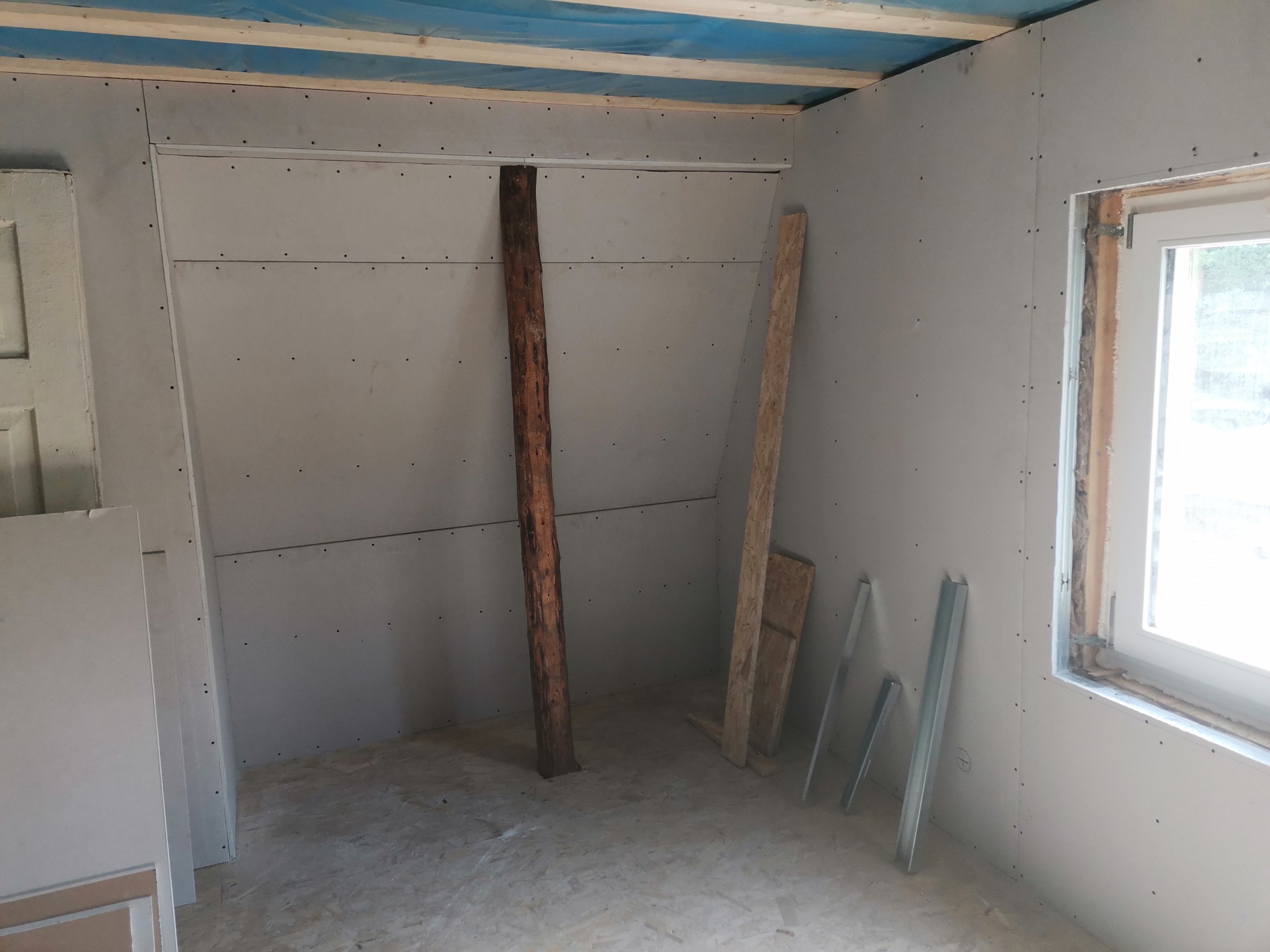 Ühe ruumi seinte (+ühe akna ja ukse paled) pahteldamine, lihivimine ja kruntimine. Värskelt renoveeritud tuba vanas majas. Ühes seinas orvand (vaata pilte).