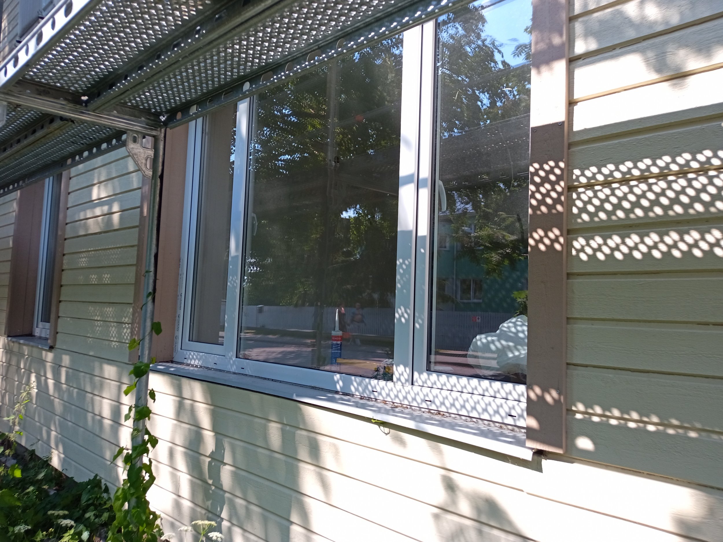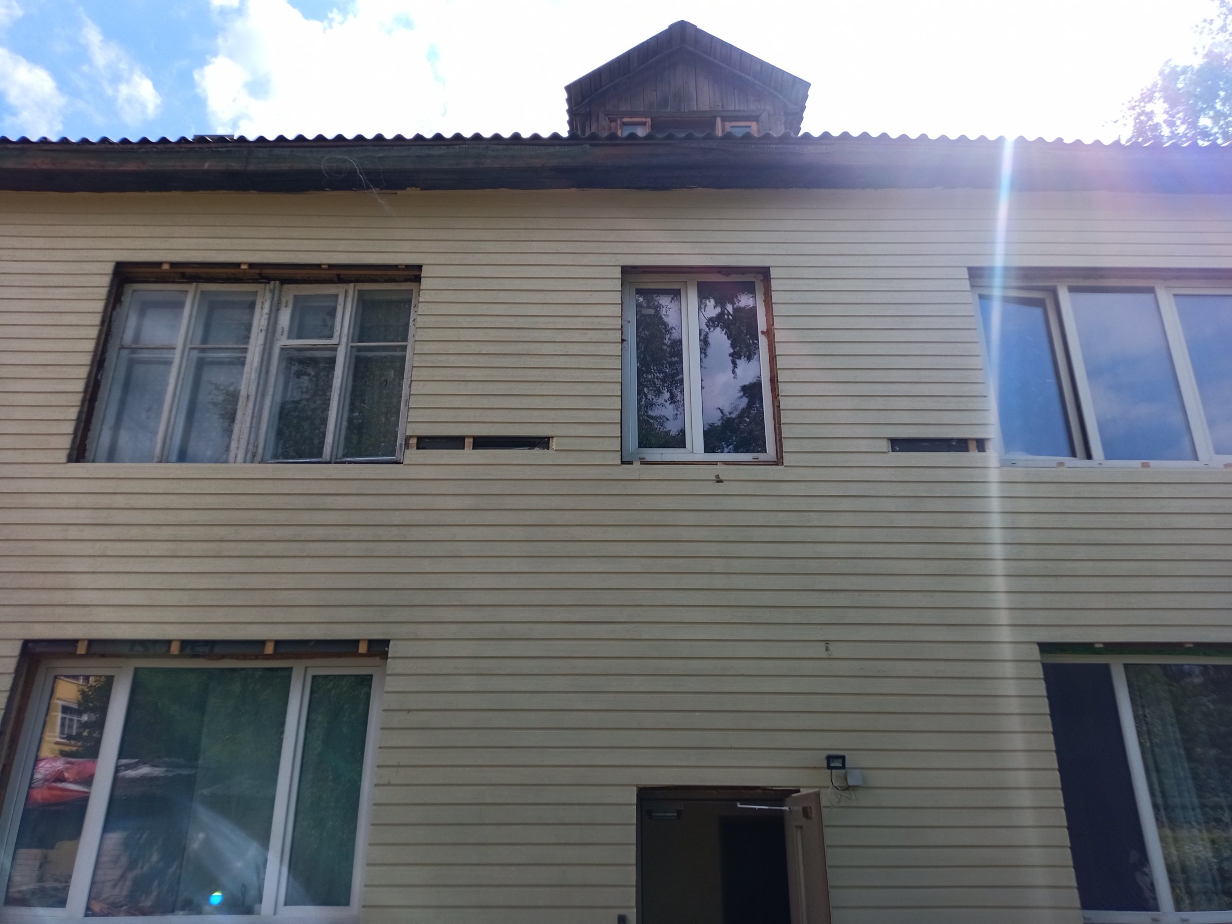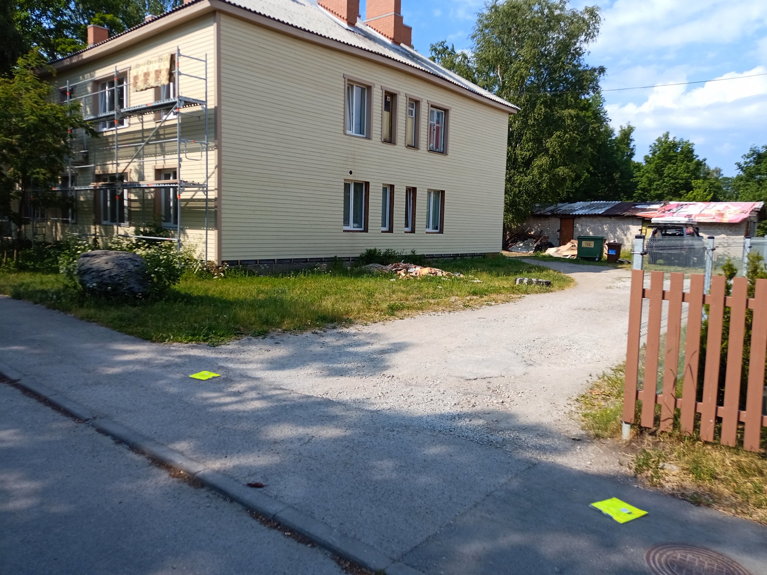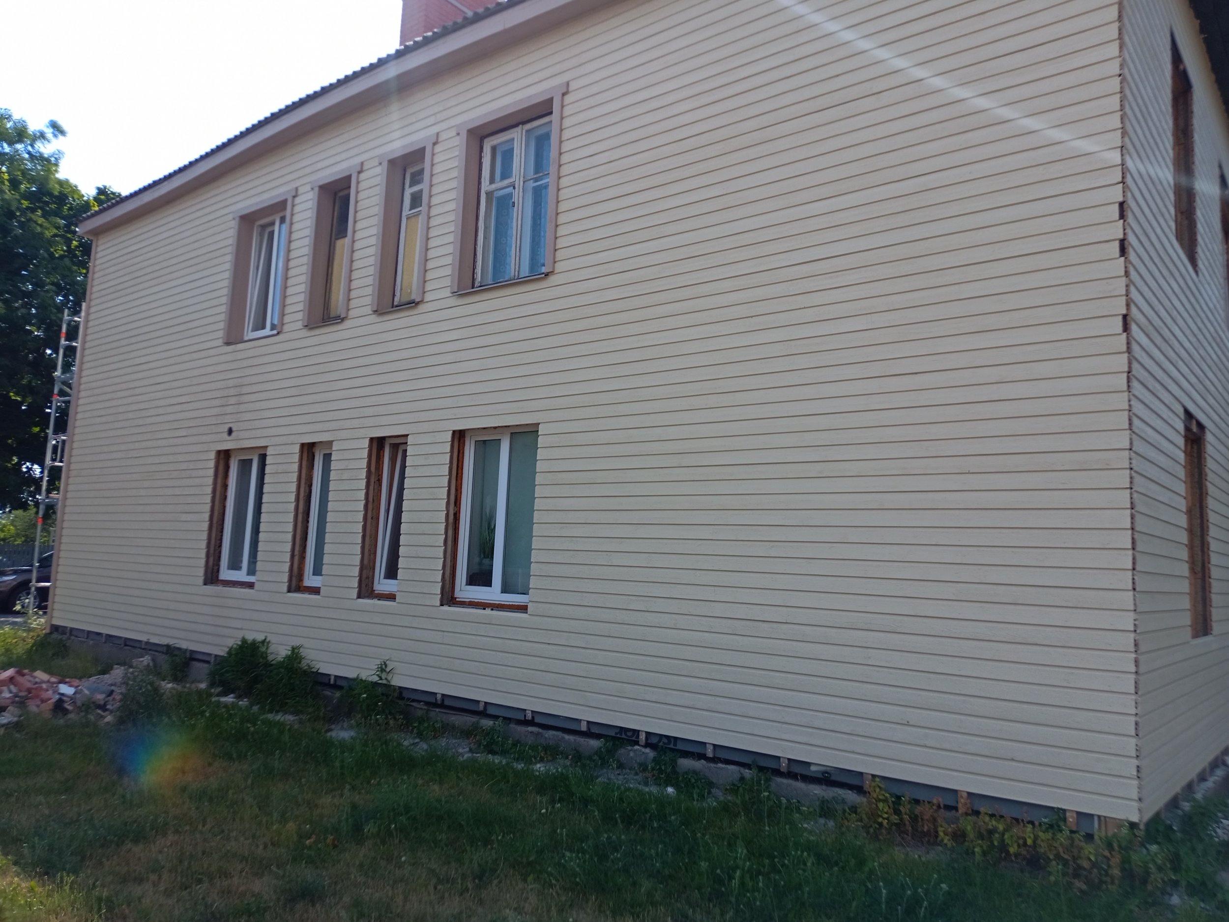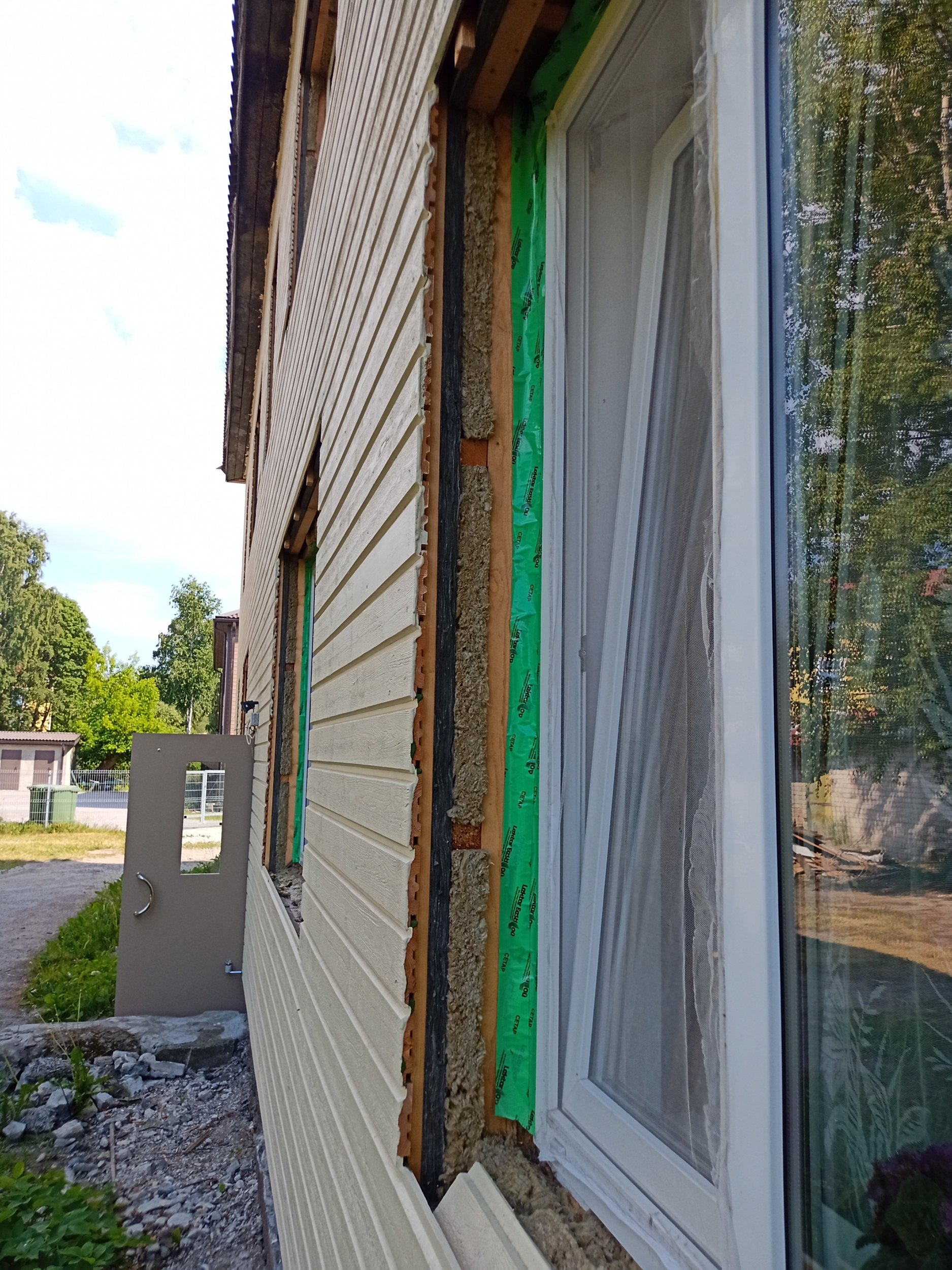 7. 16 aknaava lõpetamine (tuuletõke, tuuletõkkelint, laudis, aknaplekk). Aknapale värvitoon Tikkurila Facade 619X A/1. Aknaplekk RR42 või võimalikult sarnane võrreldes olemasolevate aknaplekkidega. Tänavapoolse alumise parema akna ava parandamine ja aknapleki nurga alla sättimine;