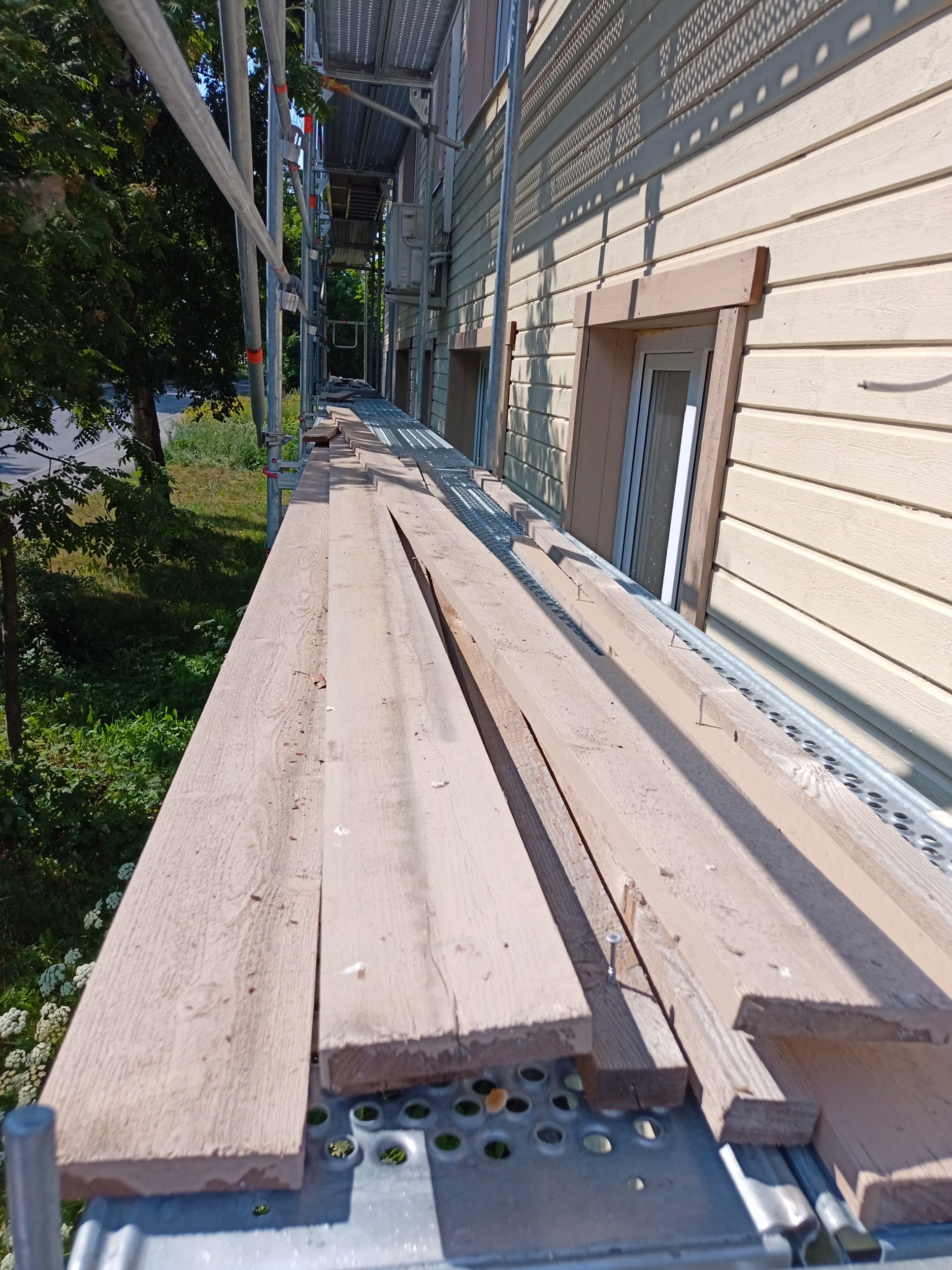 Hoovi poolt kogu 17,8 meetri ulatuses uus laud vanale paigaldada Hööveldatud, SH 18*120, värvitoon Tikkurila Feelings 4595/A2;