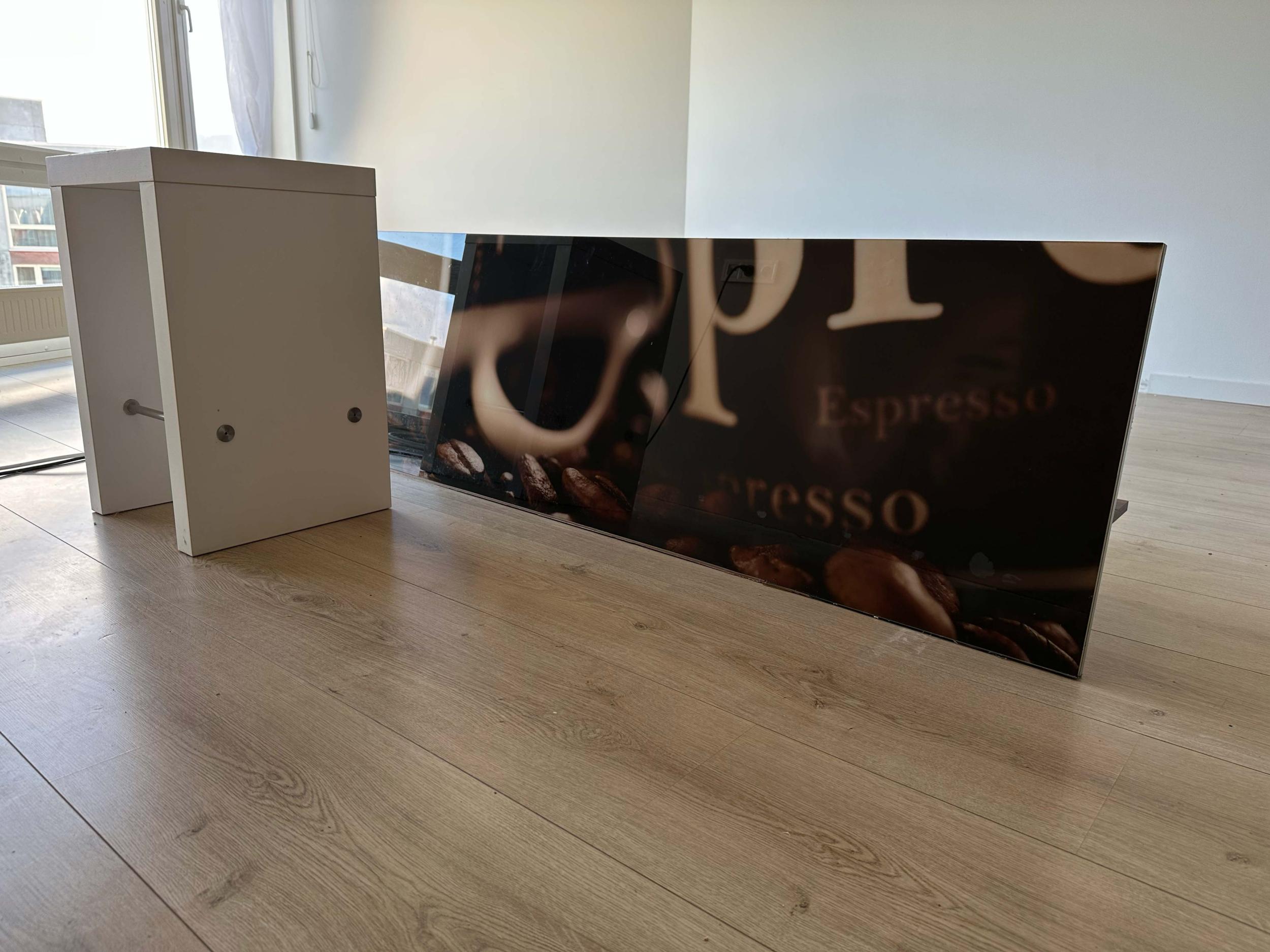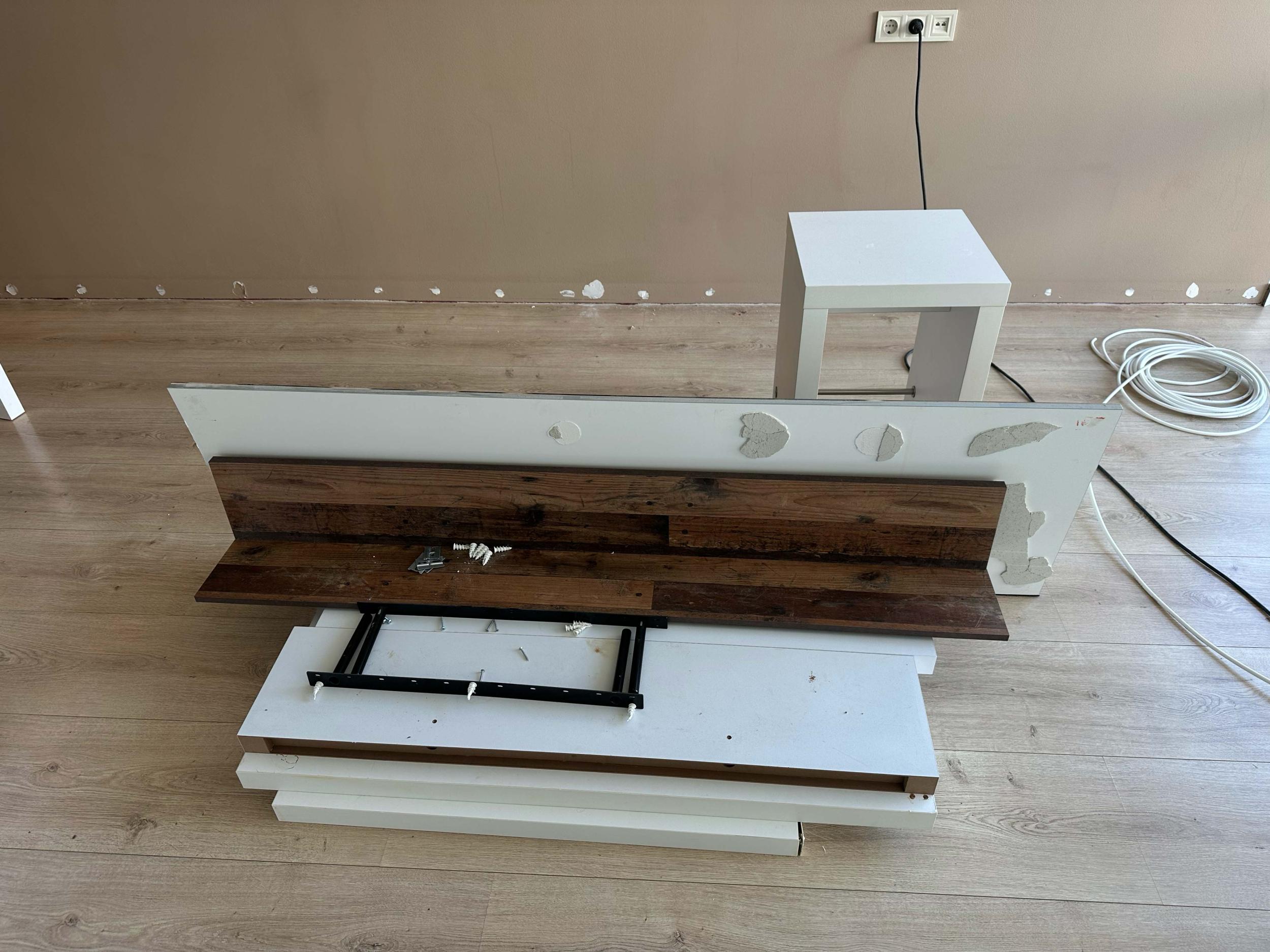 3. Seina riiulid (valged ja puidust tumepruun) ning köögi klaasist tagasein. Kõik on tegelikult korras, võib kasutusele võtta. Aga ise soovin nendest vabaneda.