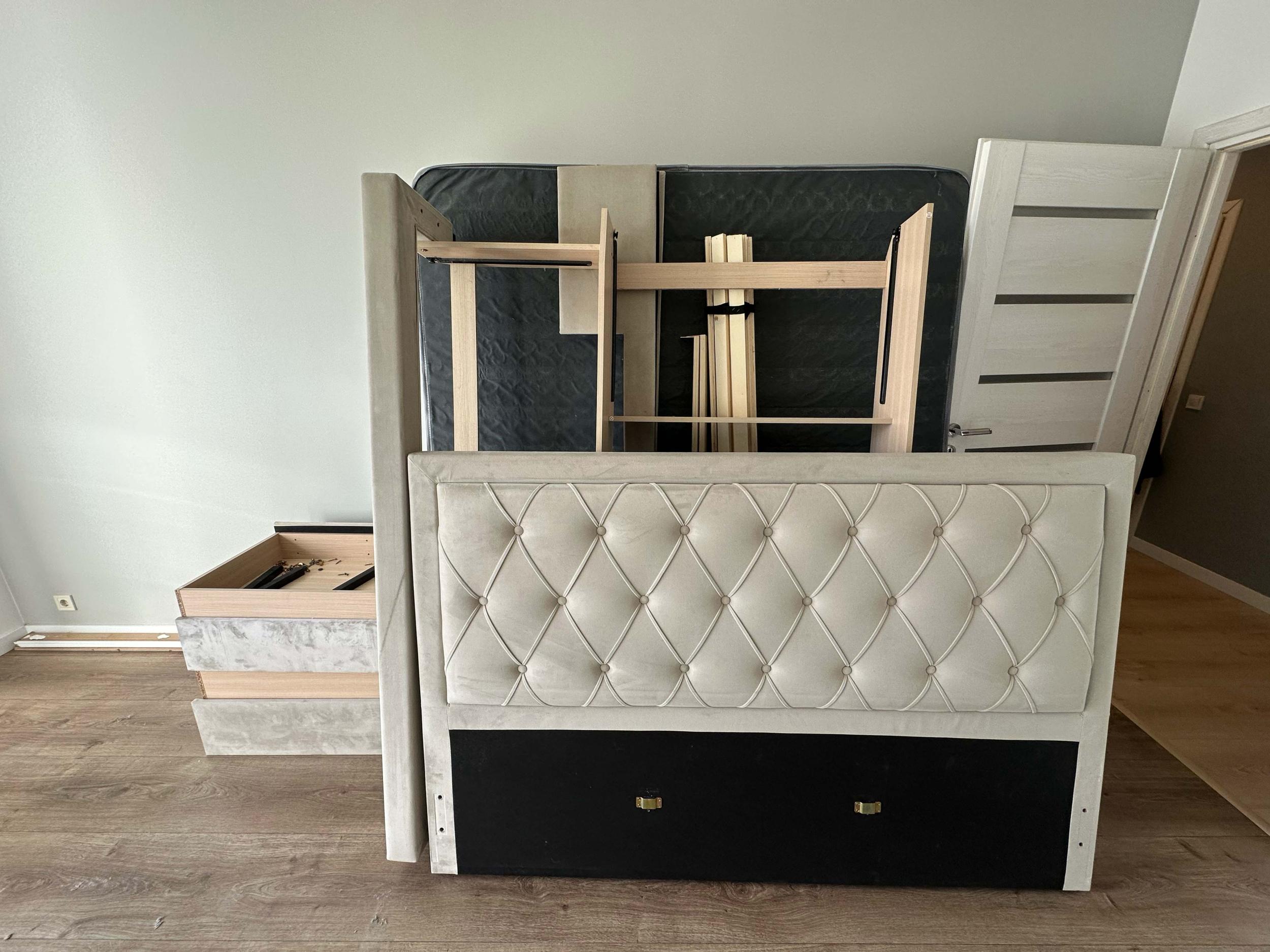 1. 180x200 sametkattega ja sahtlitega voodi. Mis on korralik ja soovi korral võib selle ka kasutusele võtta. Kokkupanekuks on kõik kruvid sahtlis olemas.