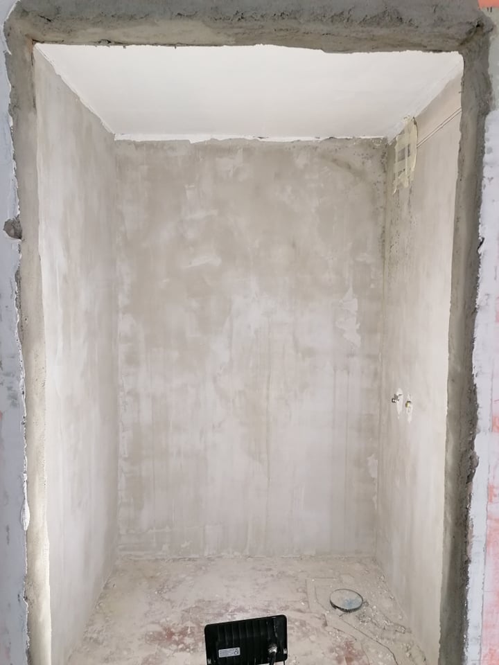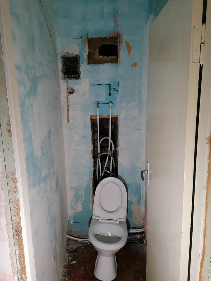 Kaablite ja ventilatsiooni paigaldus. Seinte, põranda ja lae tasandamine. Tagumise seina korrastus. Plaaatimine (ca 1,25m2) ja värvimine. WC-poti ja boileri paigaldus. Ukseava korrastamine ja ukse paigaldus.