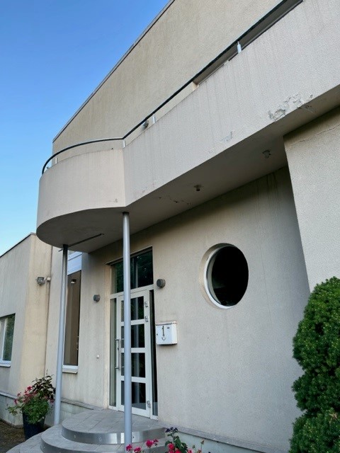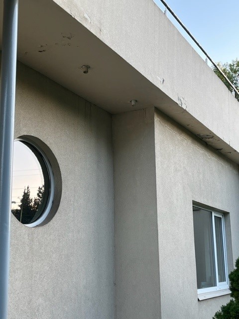 penoplastile kantud fassaadil on vee kahjustsed ja värv/krohv kohati koorub