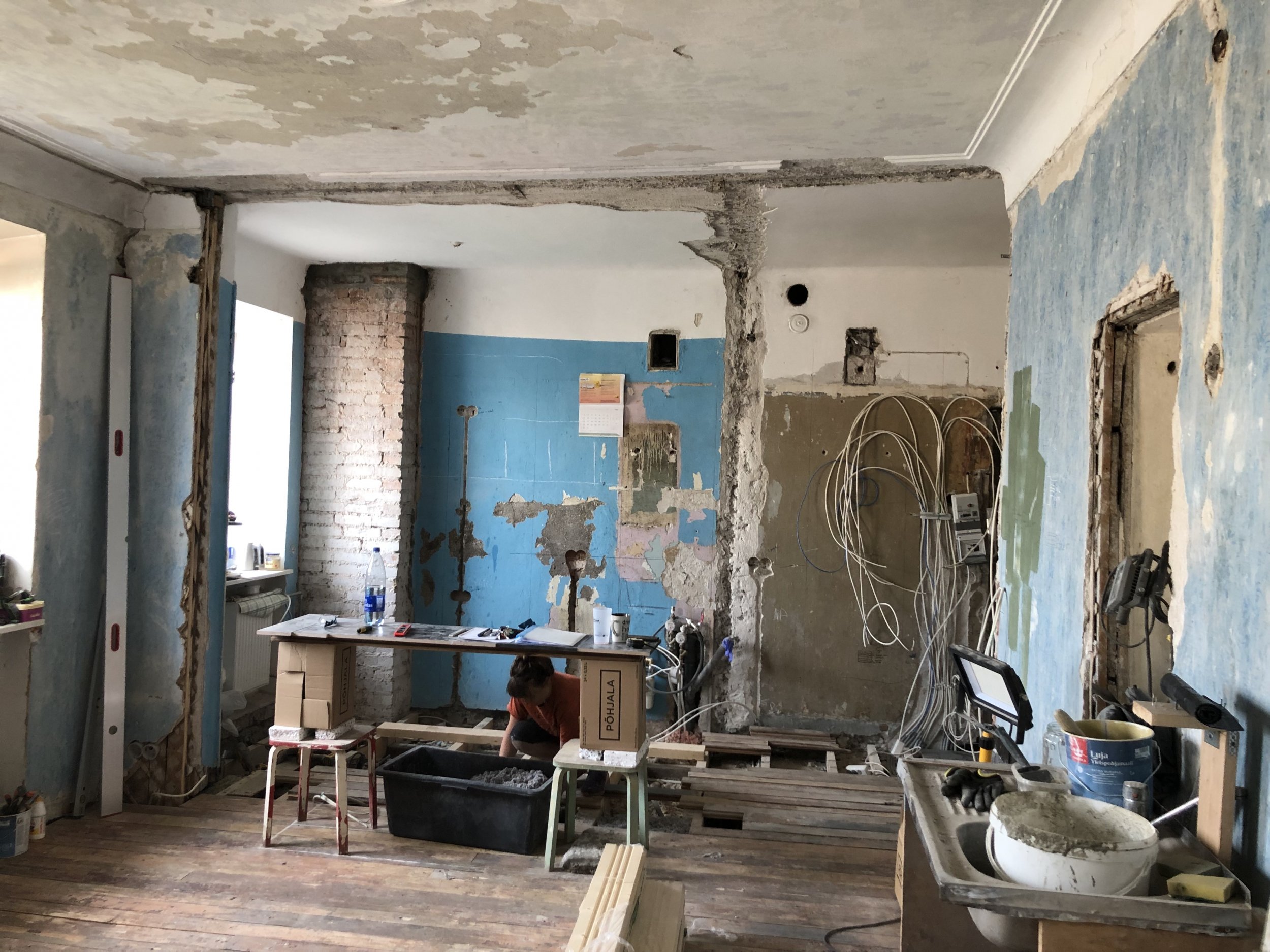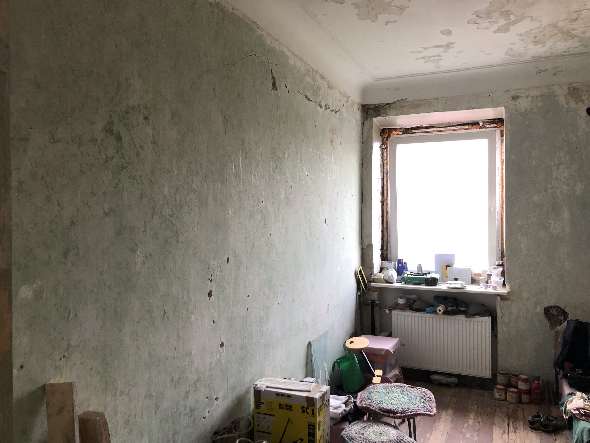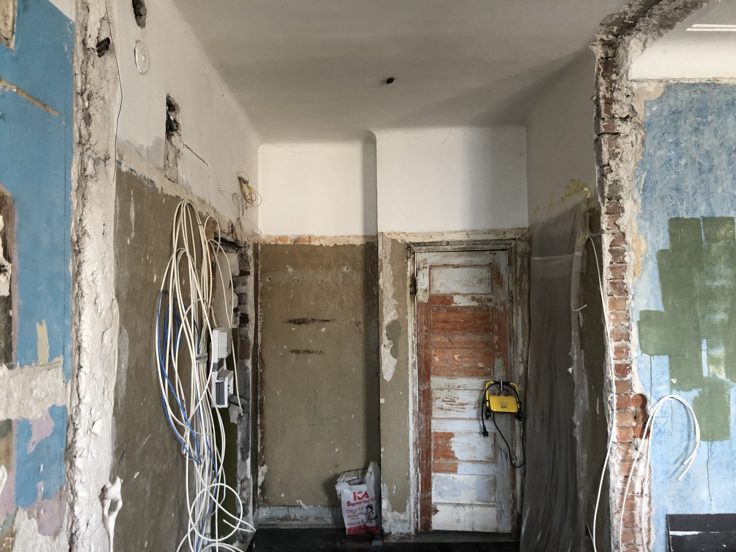 Seintes on olemas hetkel lubikrohv, mis on üldjoontes heas korras. Võimaluse korral sooviks võimalikult palju esialgset lubikrohvi säilitada. Arvame, et vana krohvi otseselt üleni maha võtta ei tule. Loodetavasti tuleb teha ainult parandused, armeerimiskiht ja seejärel kanda peale viimistluskiht. Vana tapeet on ära võetud.