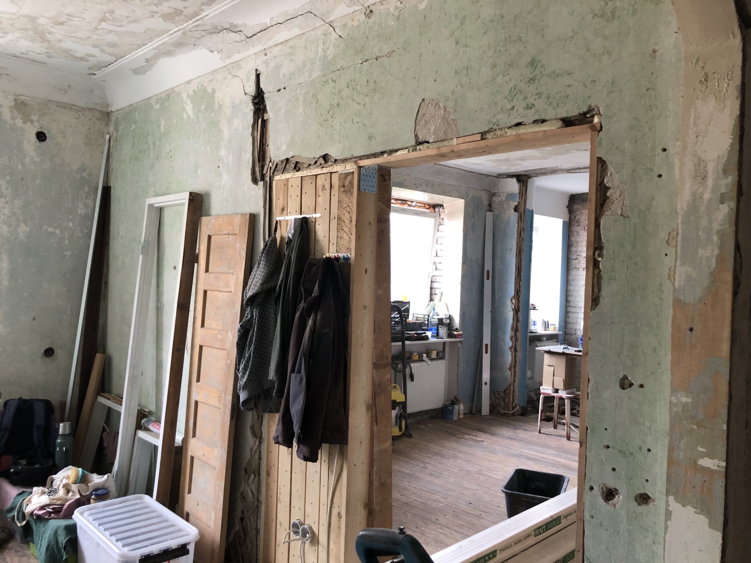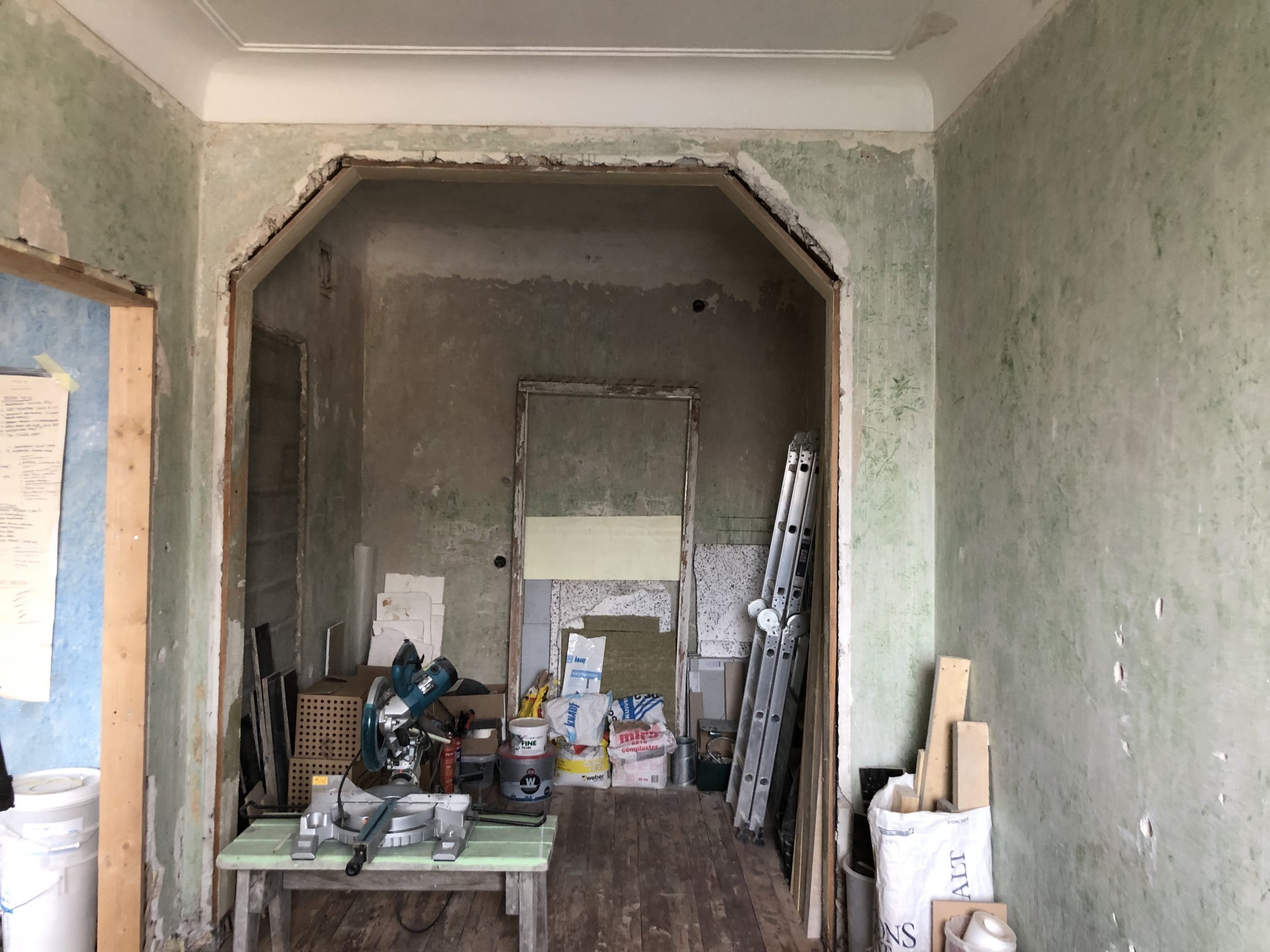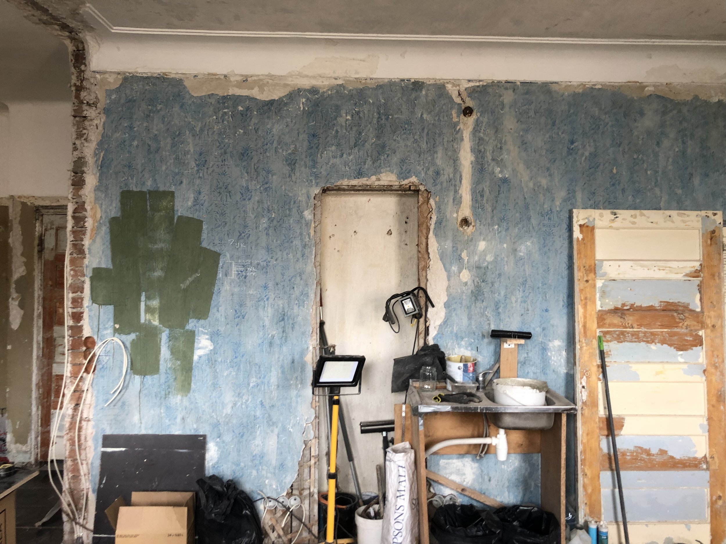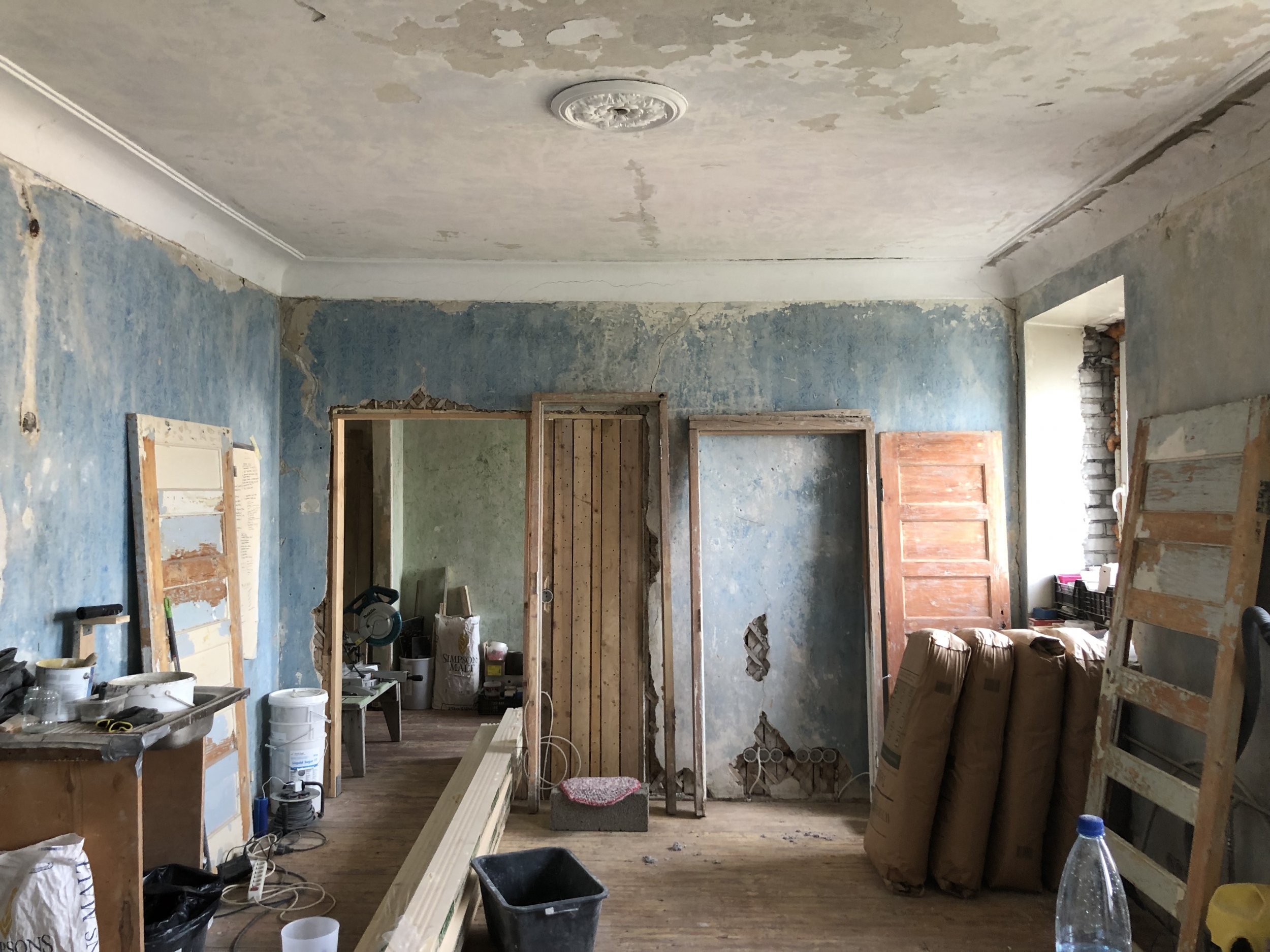 Seintes on olemas hetkel lubikrohv, mis on üldjoontes heas korras. Võimaluse korral sooviks võimalikult palju esialgset lubikrohvi säilitada. Arvame, et vana krohvi otseselt üleni maha võtta ei tule. Loodetavasti tuleb teha ainult parandused, armeerimiskiht ja seejärel kanda peale viimistluskiht. Vana tapeet on ära võetud.