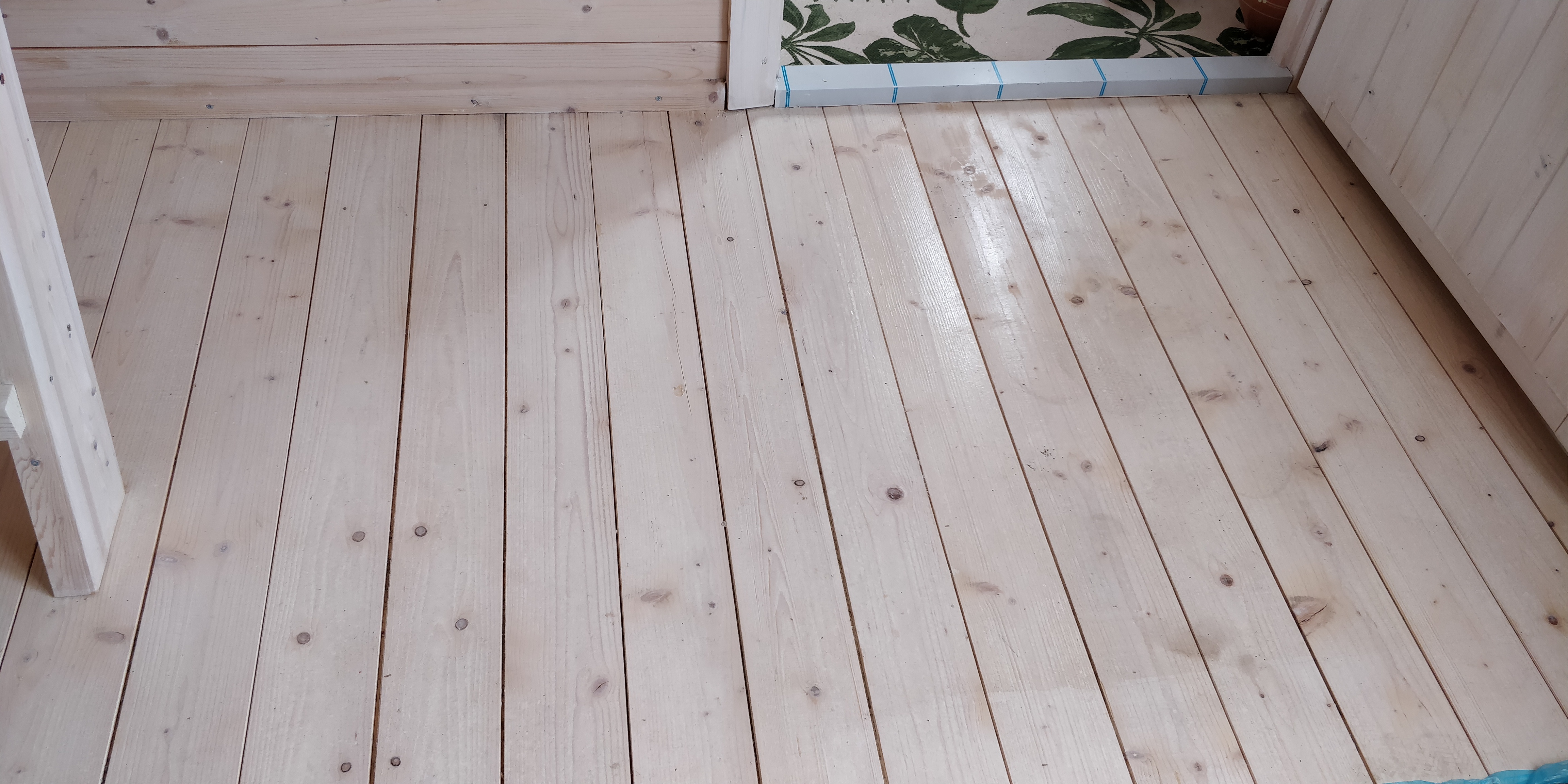 Aiamaja puidust põrand 22 m2 on mõned aastad tagasi õlitatud (Amello valge põranda ōliga) liiga paksu kihina. Tulemuseks on nakkuv liimjas kiht, mida on keeruline eemaldada. Lisaks on õli ka põranda laudade vahel, mis tekitab põrandal käies nagisevat heli.
