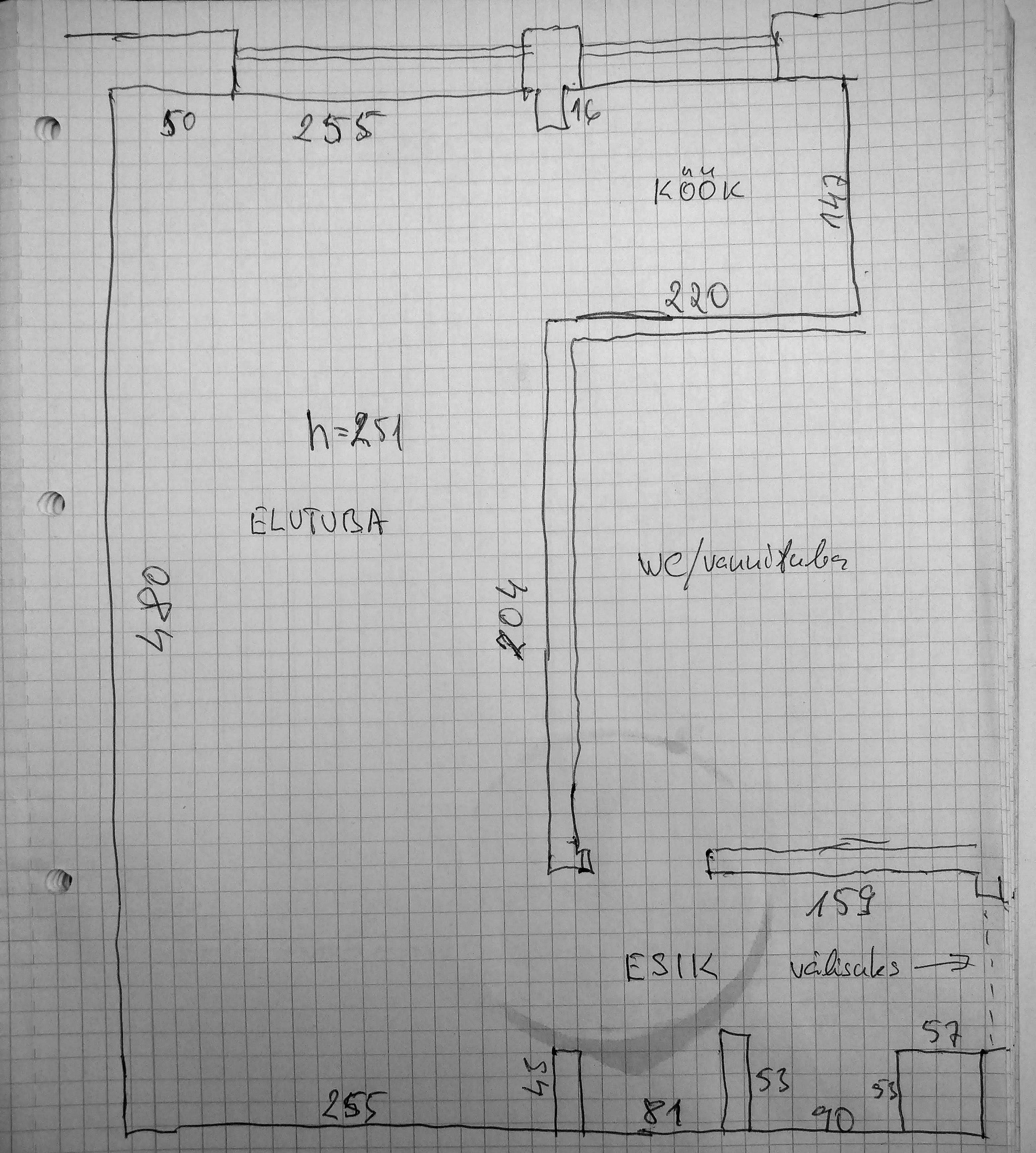 Põranda pindalad: Köök: 3,23 m² elutuba: 12,24 m² esik: 2,62 m² (st kokku: 18,09 m2)