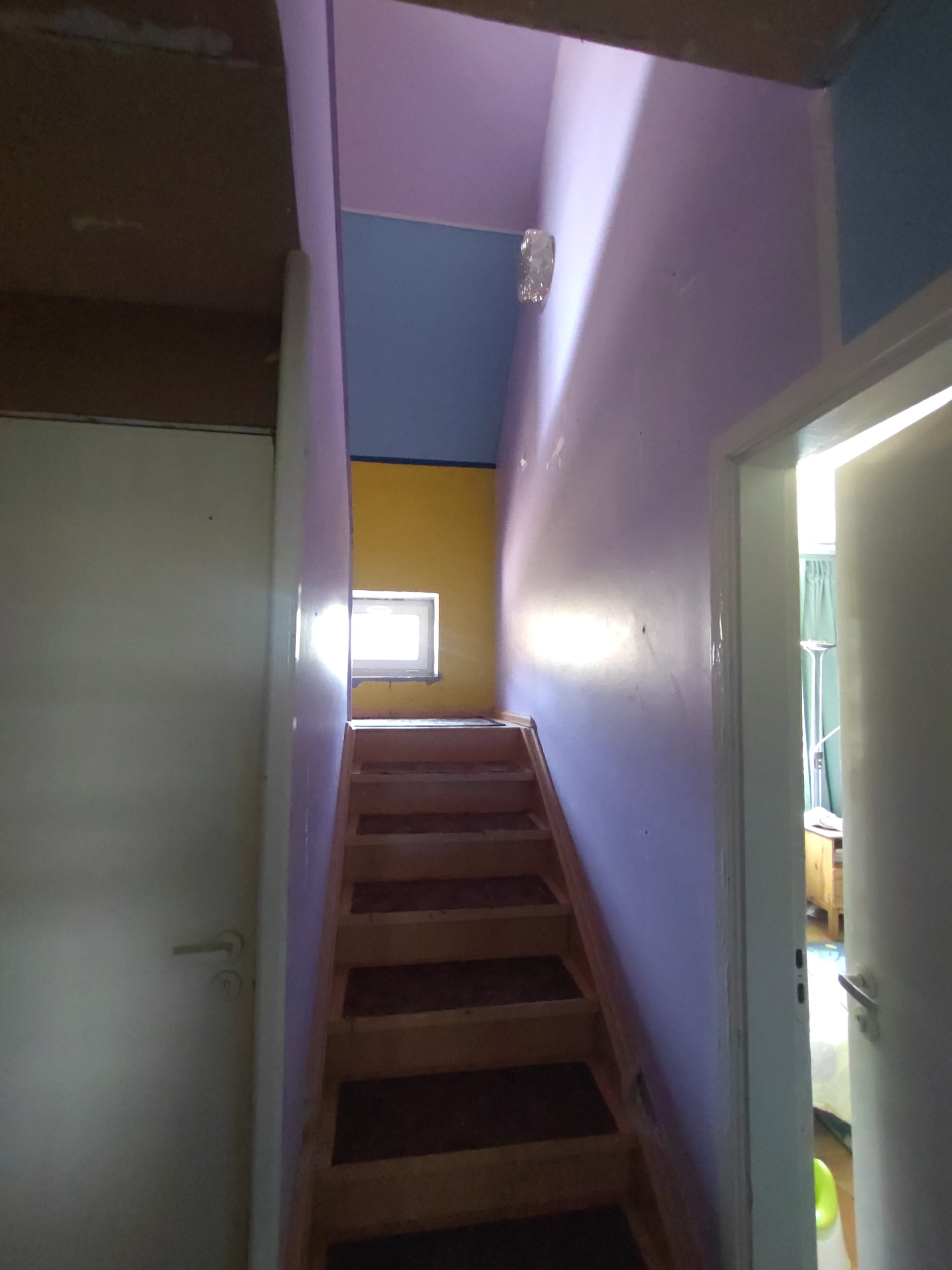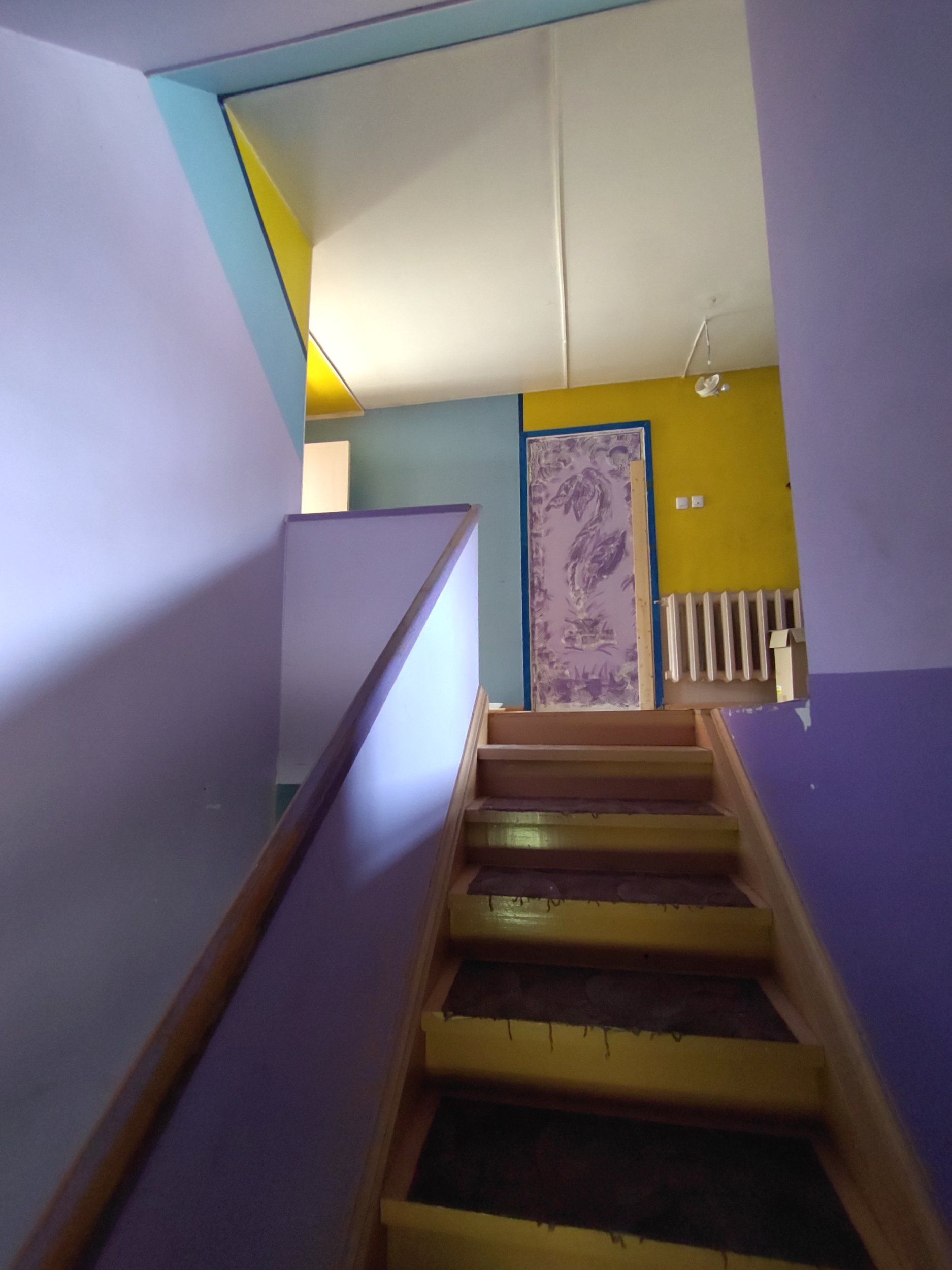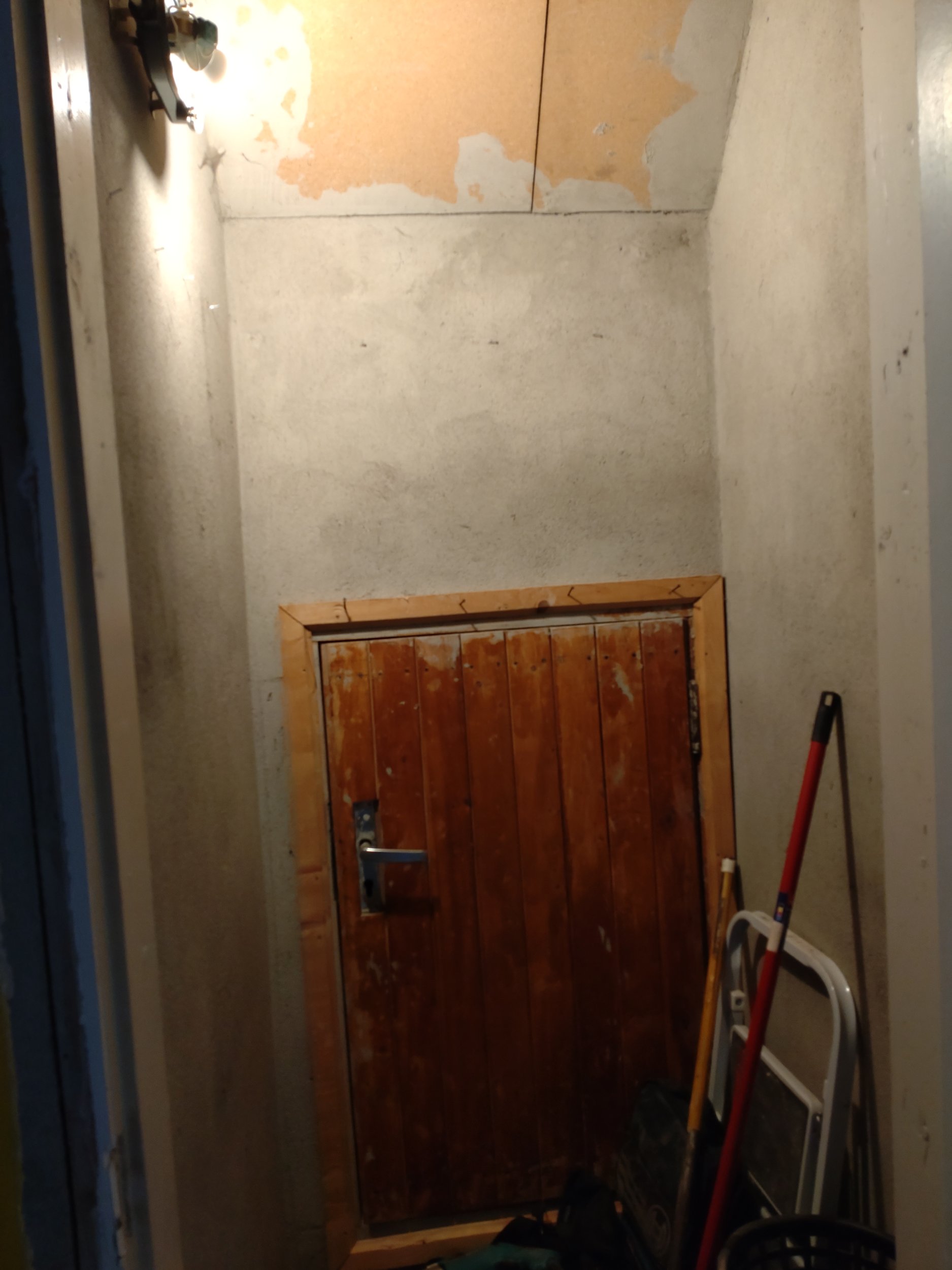 Koridori ja trepi lagi siledaks pahteldada, vanad liistud on eemaldatud ja osades kohtades suuremad vahed laeplaatidel. Trepi kohal on kaldlagi esimese korruse põrandalt mõõtes u. 5 m kõrge.