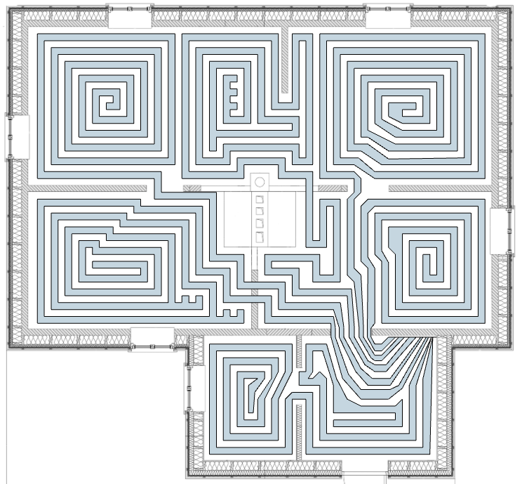 - Põrandaküttetorustik(20mm) koos 8-se kollektori ja survetestiga. Lisatud pilt enam-vähem plaaniga kuidas kontuurid peaksid jooksma. Täpsemalt saab vaadata kohapeal