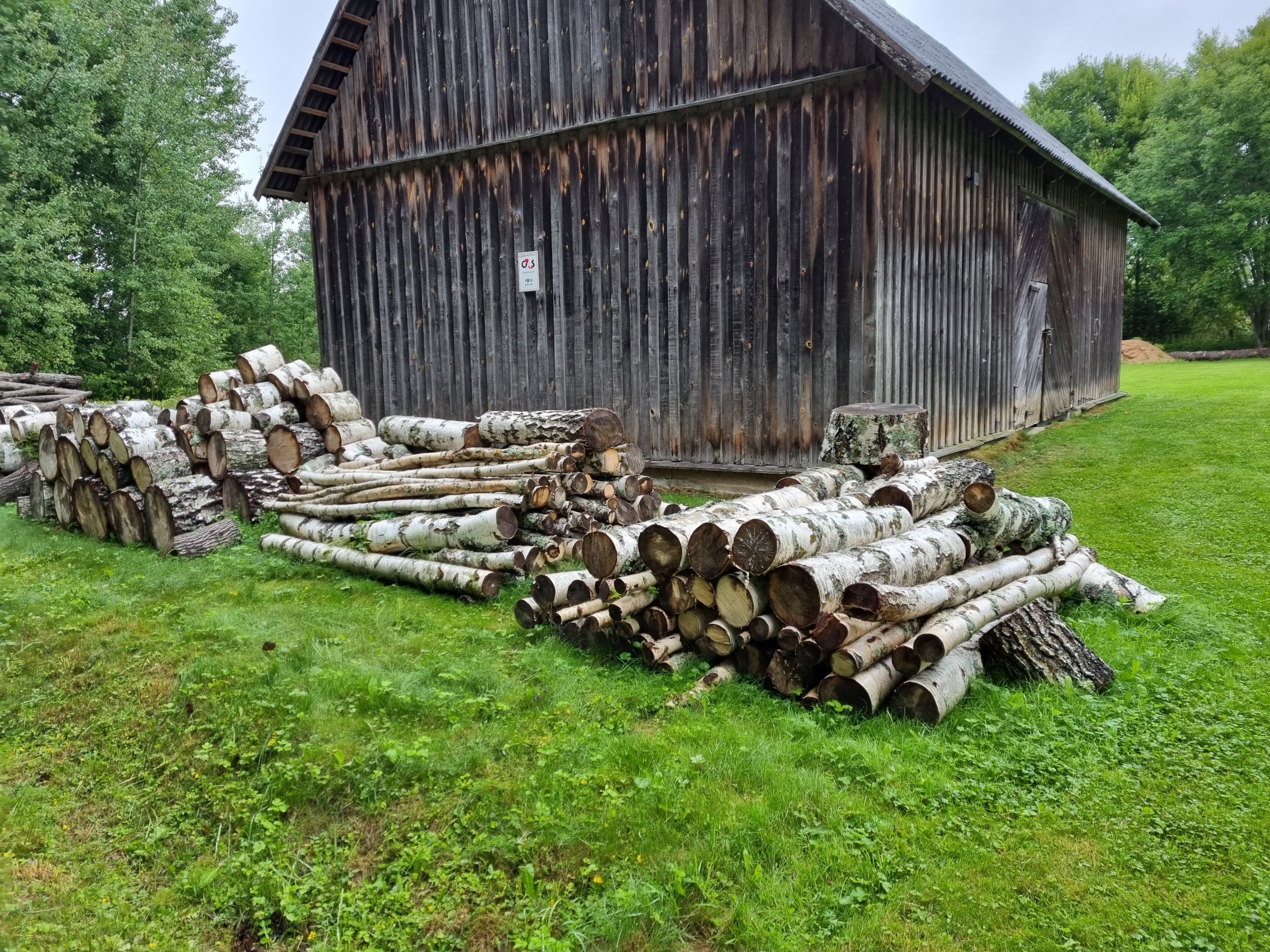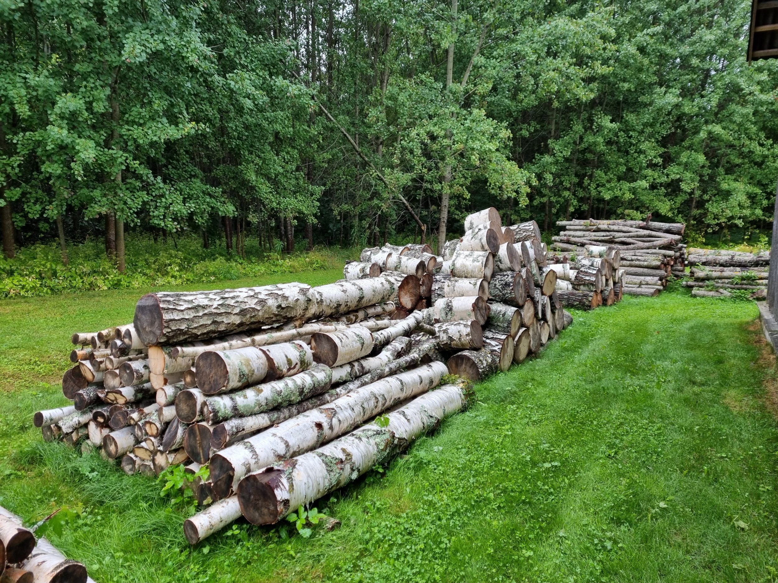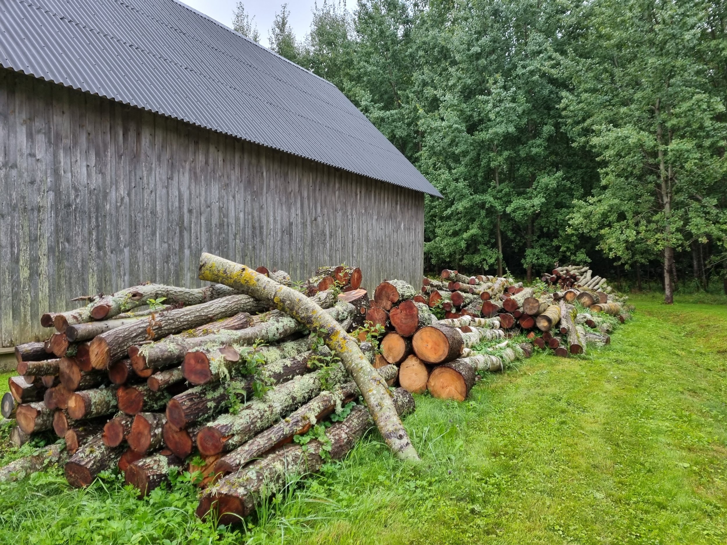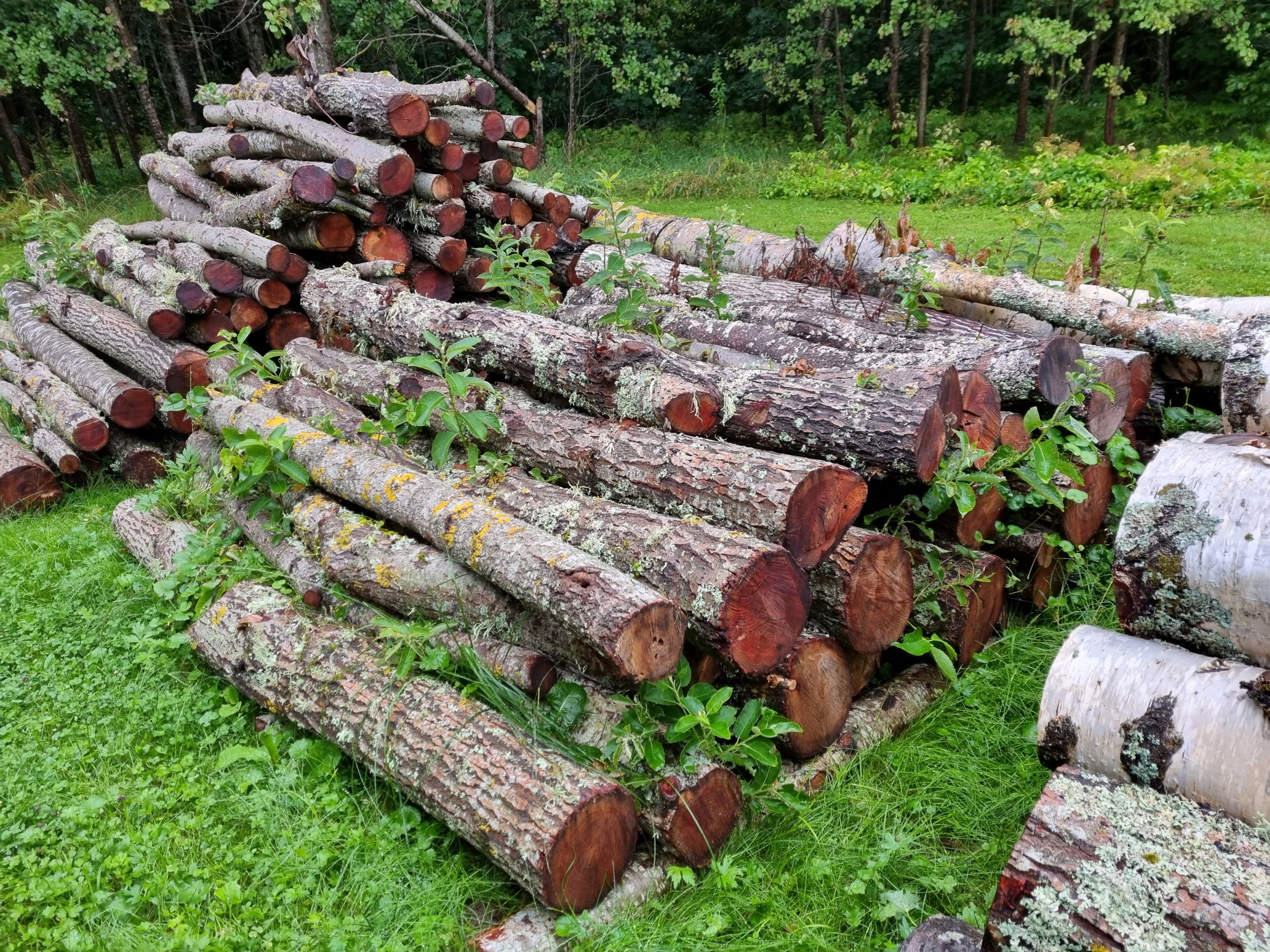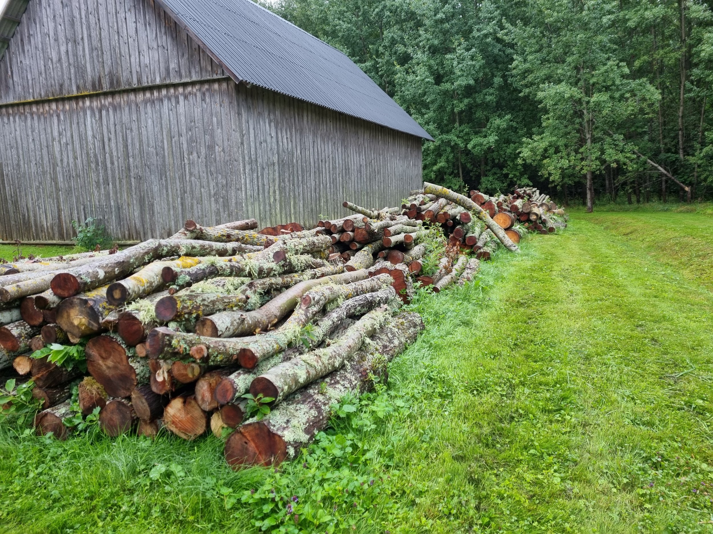 Pildil olevate puude saagimine, peamiselt 25 cm pikkusteks (kamina tarvis) ja lõhkumine.