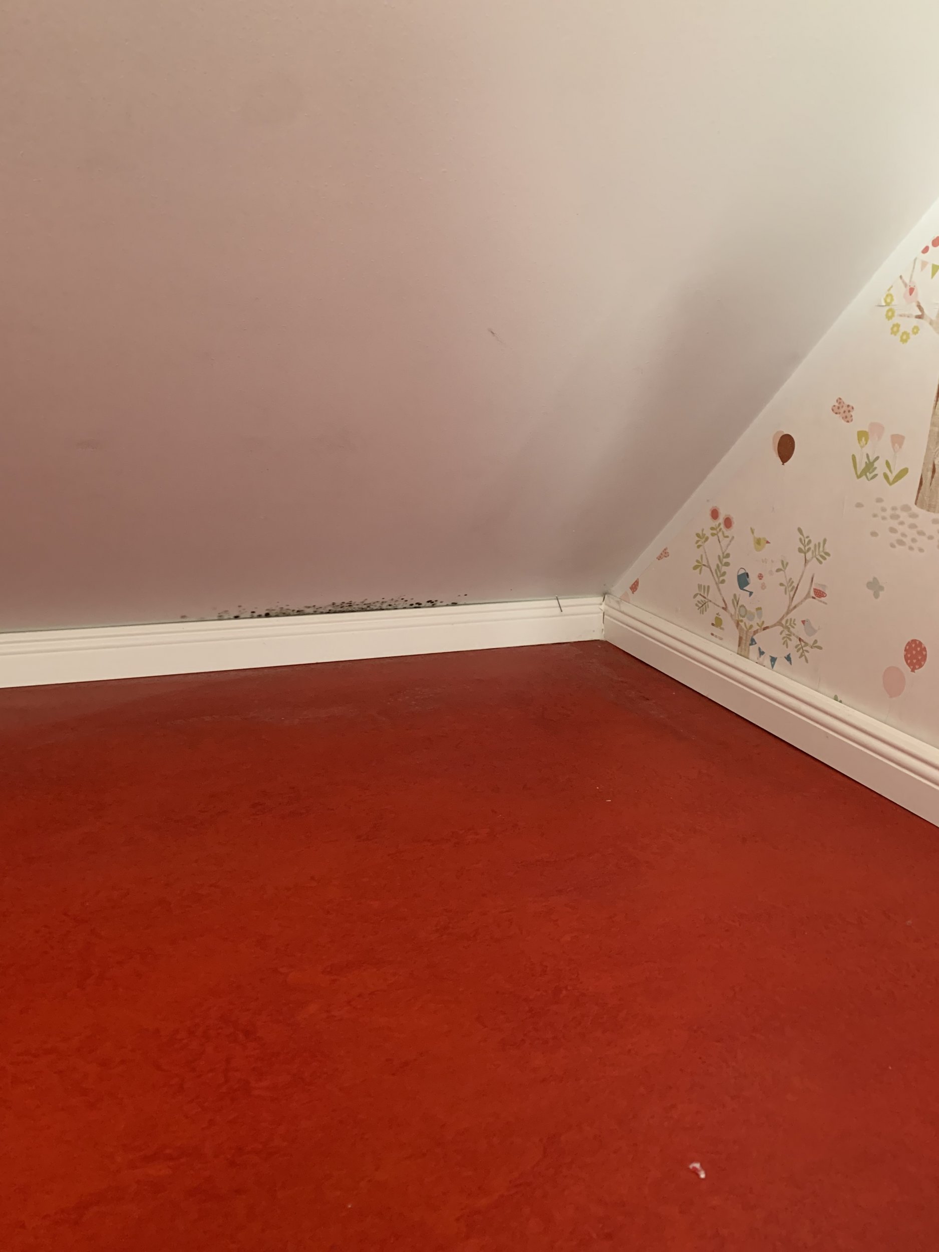 Katusealuses toas on paari aastaga tekkinud ca 0.5m niiskuskahjustus ( kas katusest, kondents või toa kõrvalt vannitoast). Vajalik küprokseina vastav ala lahti võtta, tuvastada niiskuslekke põhjus, see parandada ning sein viimistelda.