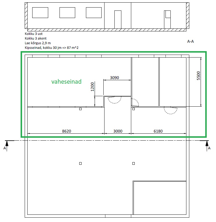 Ülemine vöö paigas, selle järgi panna alumine vöö. Lisaks karkassipostid, kipsplaadid, vill, uksed (3 tk), aknad (4 tk), värvimine (pahteldamata).