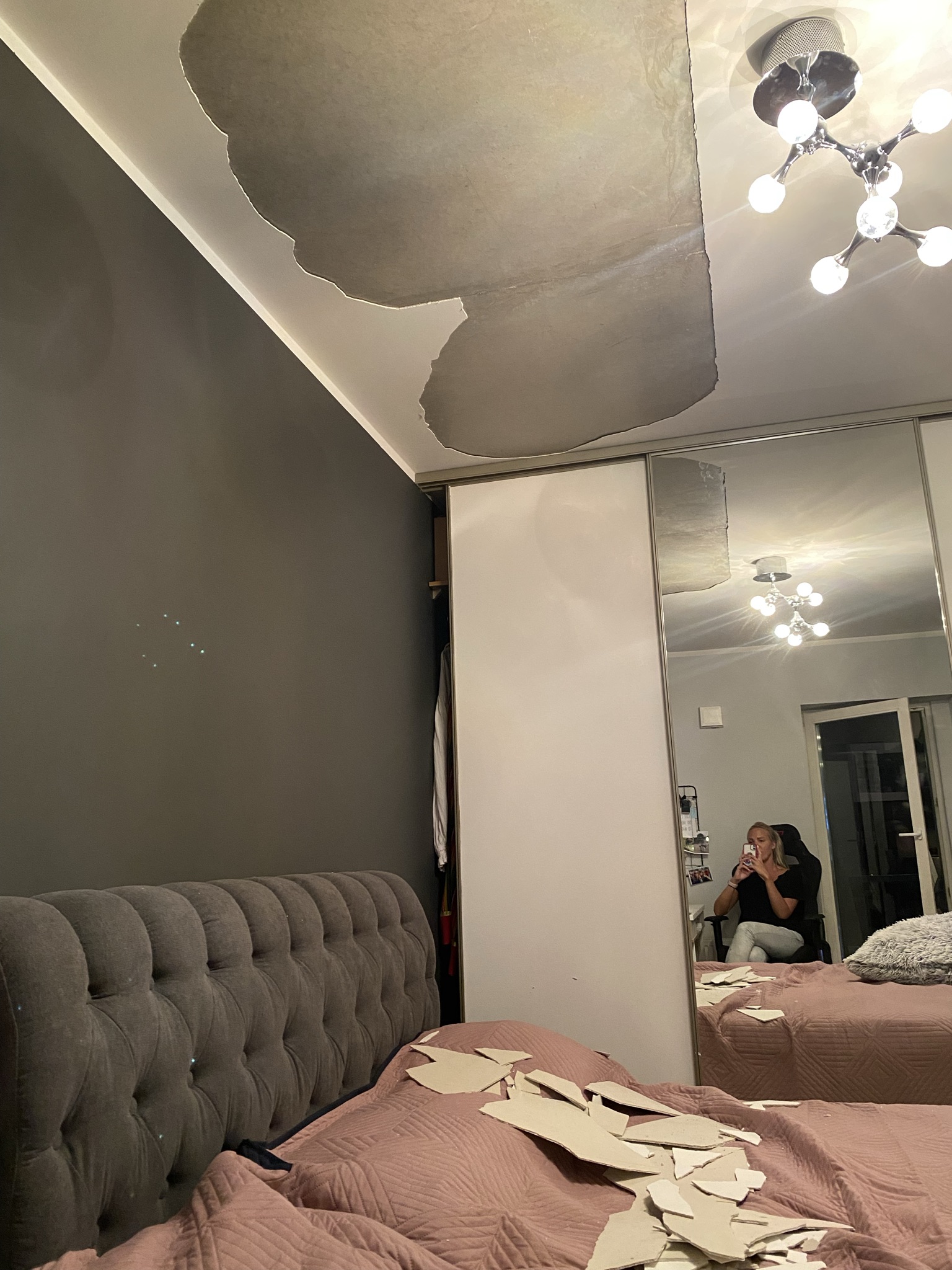 Korteri laele ei ole juba ehitusjärgus lisatud vedelikku, mis paneks lae nakkuma, mistõttu vajus lae keskmine osa ära ja lõpuks kukkus sealt ca 1x2m tükk ära. Lagi tuleks korda teha.