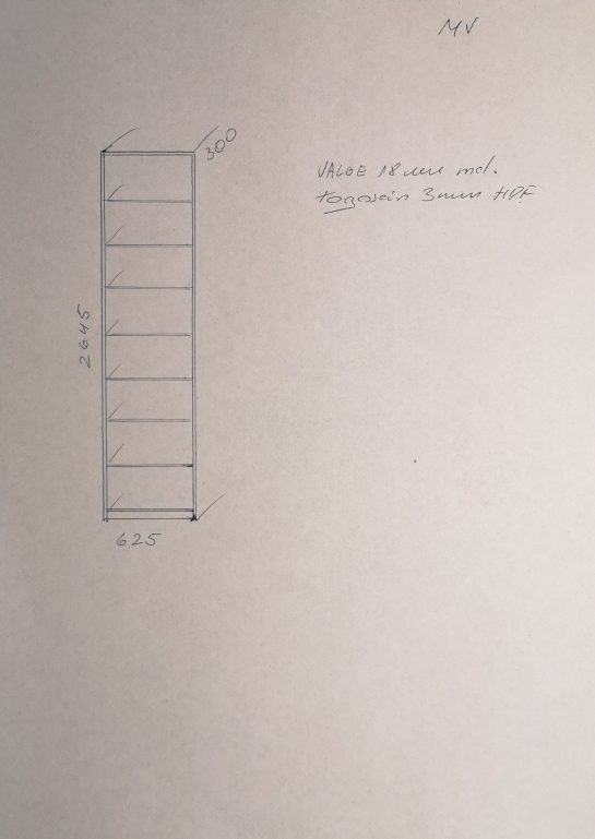 Kõrgus 26450mm, laius 6250mm, sügavus 300mm. Küljed ja riiulid 18mm valgest melamiinkattega puitlaastplaadist, küljed ja riiulid ristkülikukujulised ilma sisselõigeteta. Servakant külgede esimestel ja ülemistel servadel ning riiulite esiservadel. Üheksa riiulit, nagu joonisel, millest ülemine, alumine ja keskmine statsionaarselt kinni, ülejäänud lahtiselt. Tagasein valgest HDF plaadist. Tagasein on paigaldatud karkassi peale, eraldi süvendit servadel selle jaoks ei ole. Alla kapitallad või vildid. Käibemaksu ei lisandu. Lisaküsimused oodatud vestlusaknas. |