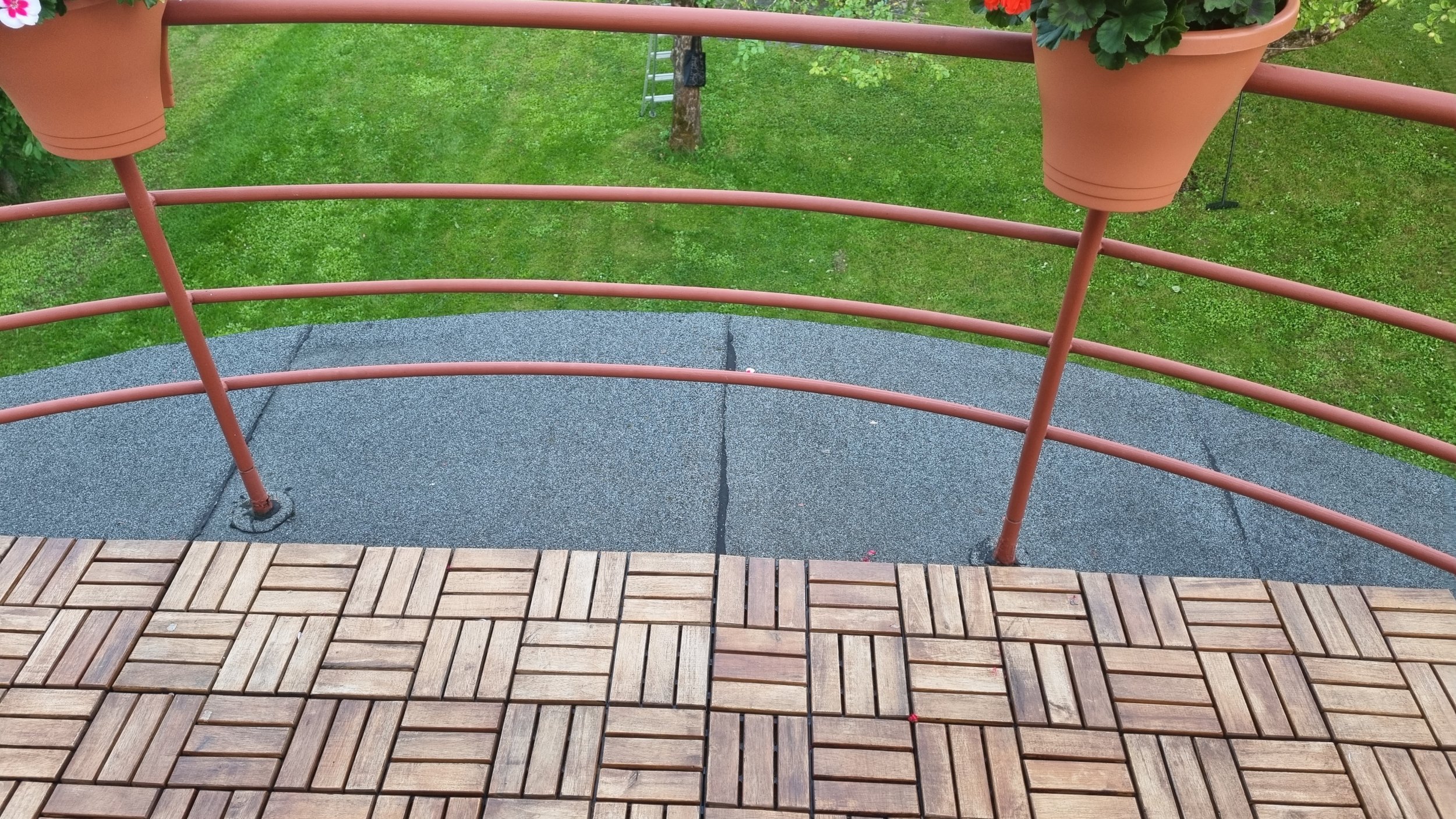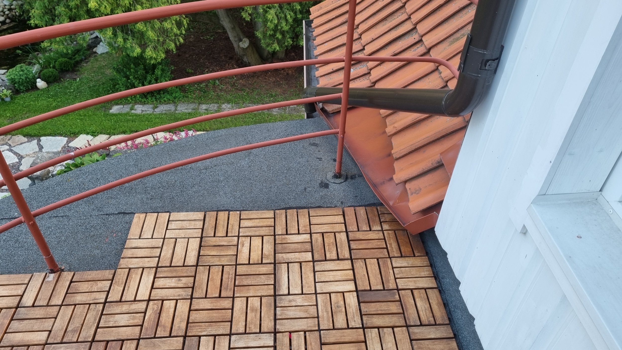 Vt. olemasolev olukord: Fotod: https://www.dropbox.com/sh/9eh3dj2tchnkke4/AAAm_lOACknrUFXHyEebMZDTa?dl=0. Umbes 15-aastat tagasi sai katusetöödele spetsialiseerunud ehitusfirma poolt ehitatud lamekatus maja 2. korruse rõdule. Vt. tehtud lahendus fotodel. Tundub, et tänaseks on lahendus ammendumas või ei olnud valitud ehitustehnoloogiline lahendus õiges, sest rõdul oleva SBS-katusekatte all olev vineer, tegemist oli nagu aru sain, niiskuskindla vineeriga, on osadest kohtadest rõdul lohkus, st rõdukattele on tekkinud nn. vajumiskohad ehk lohud, vineer kohati õõtsub peale astudes ja on alt mustaks tõmbunud, järeldatuna kui eemaldasin vanad tuulekastilauad rõdu alt. Kui eemaldasin vanad tuulekastilauad, sain mina aru, et vineer on paigaldatud otse puitprussidele. Prusside vahele nagu aru sain, on pandud soojustus, vill.