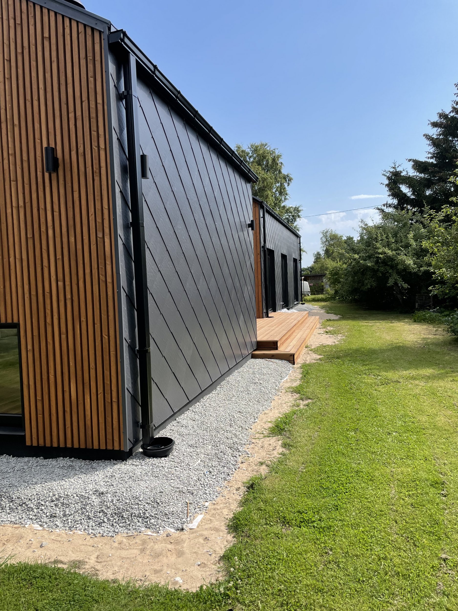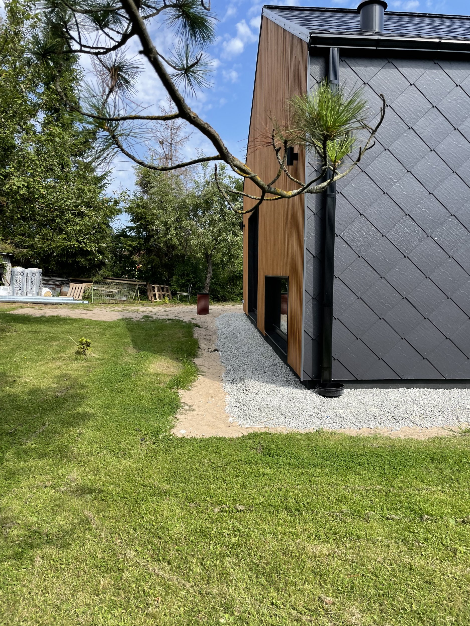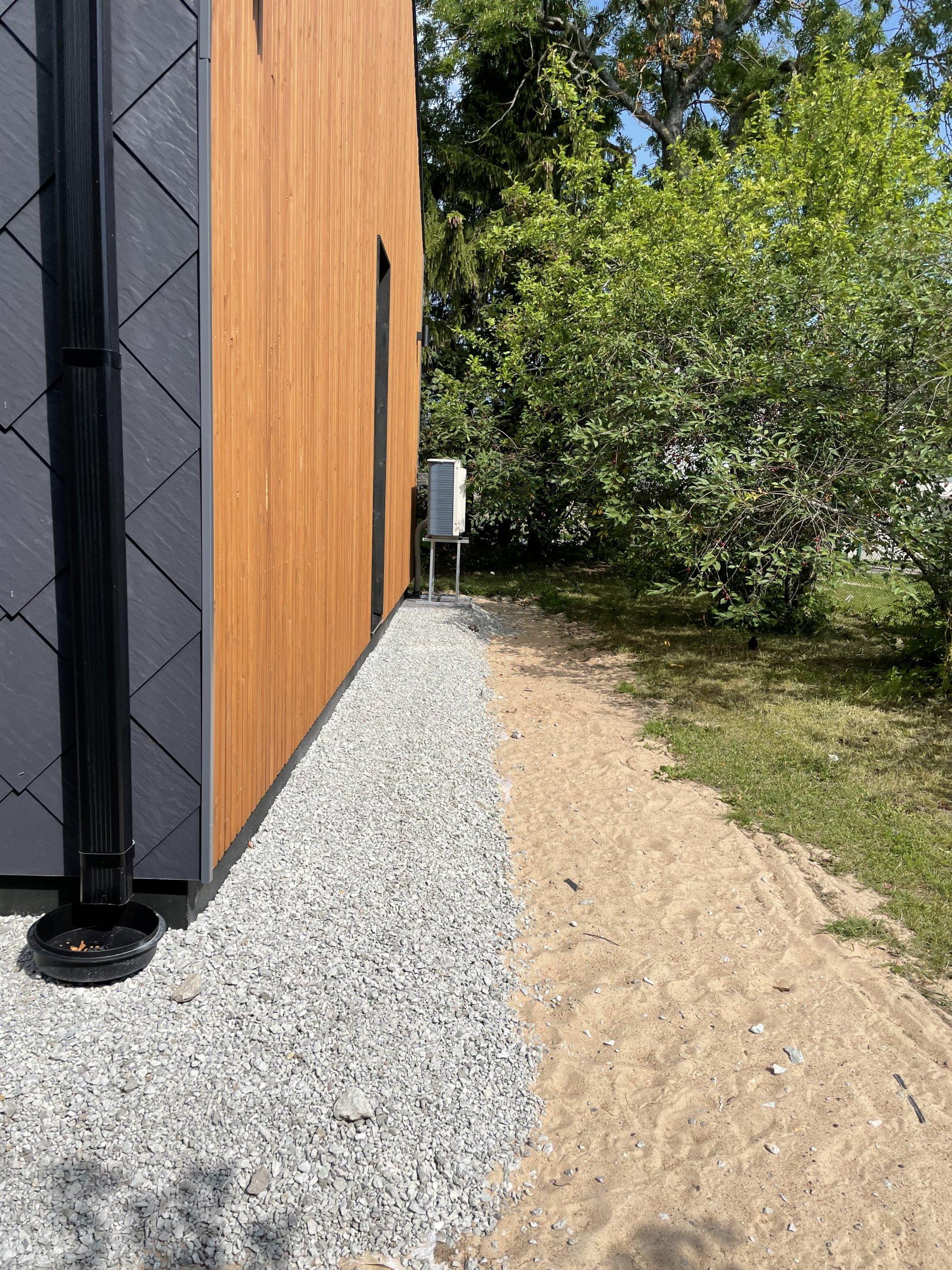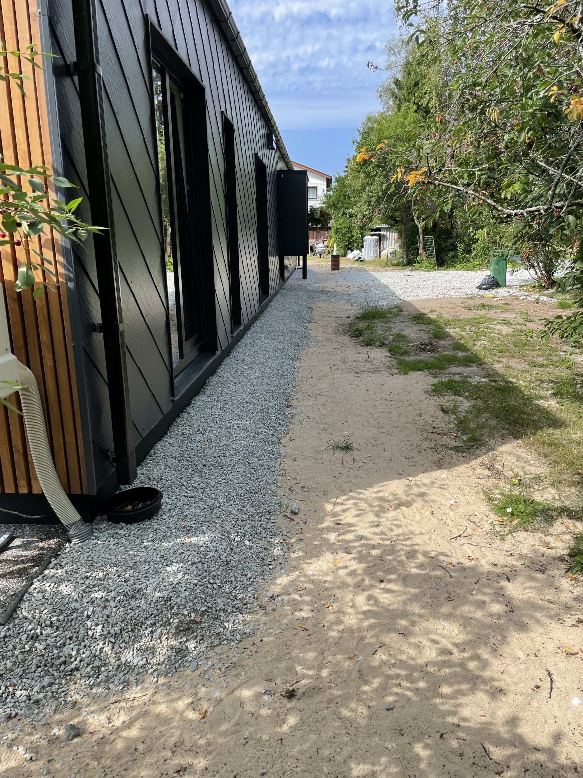 Maja mõõtmed on 23.5m x 8.5m. Piltidel on näha vundamendiäärse tühimiku suurus.
