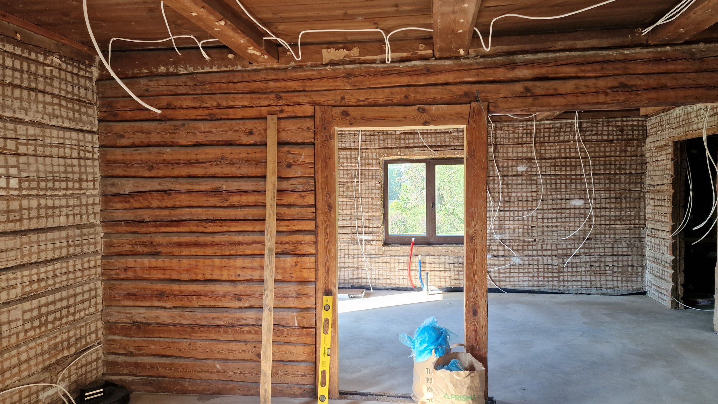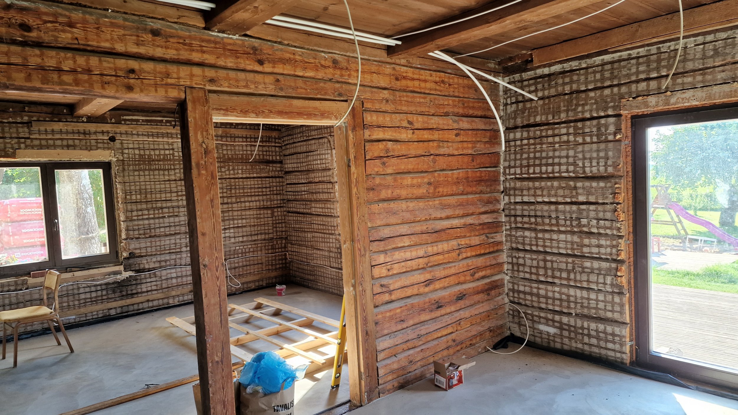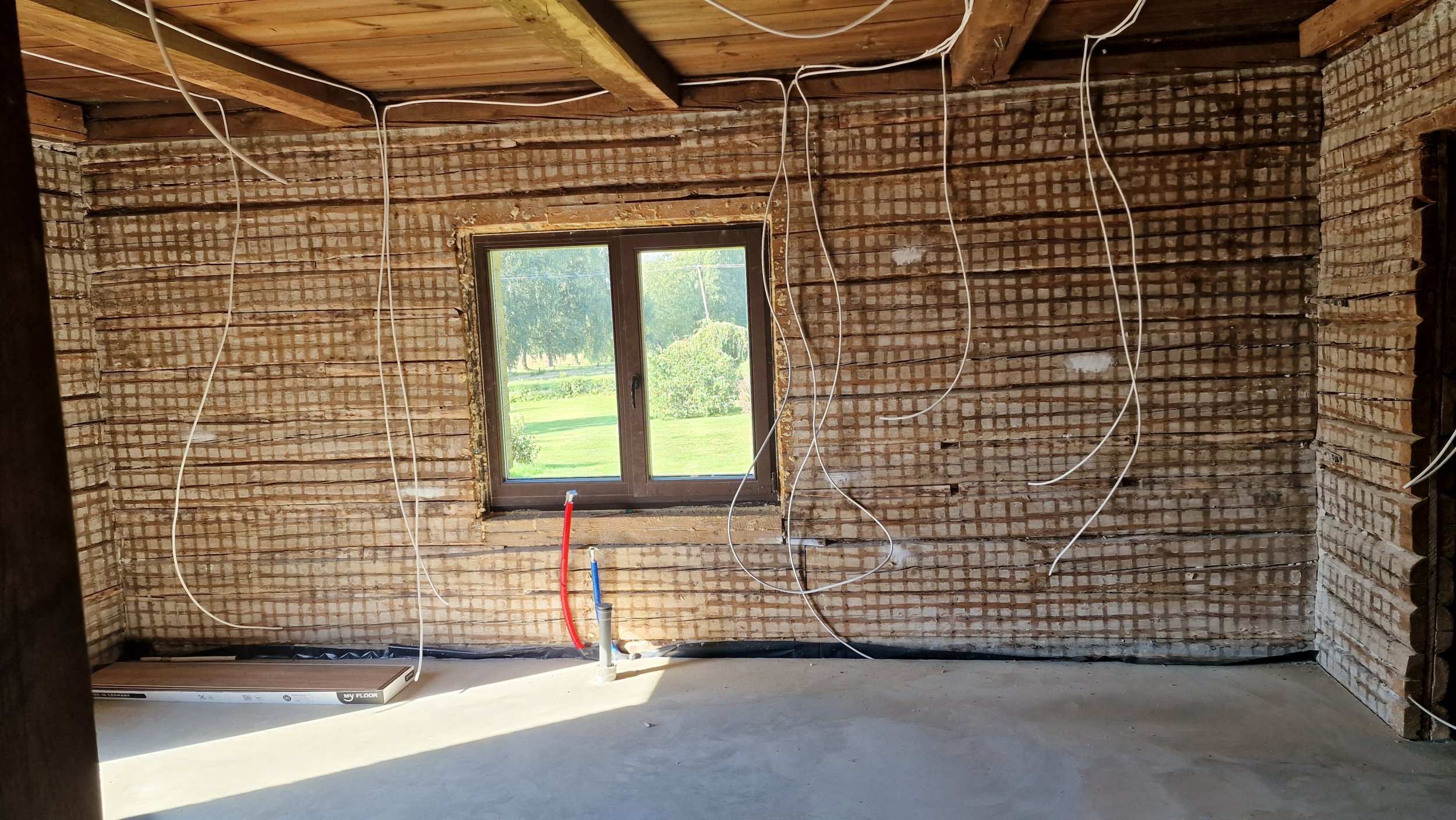 Palkmaja seintele on tarvis paigaldada osb ja kips võimalikult palgi lähedale (ehk siis ilmselt ca 20mm paksusele puit roovitusele). Seinad tuleb ajada loodi ja köögiseinas olevad nurgad täisnurka. Seinte kõrgus 2,5m ja pinda kokku 135m2