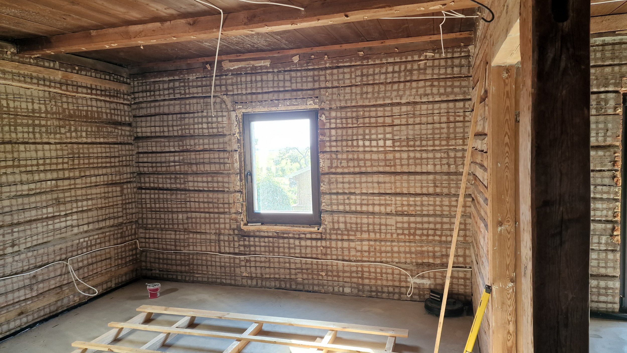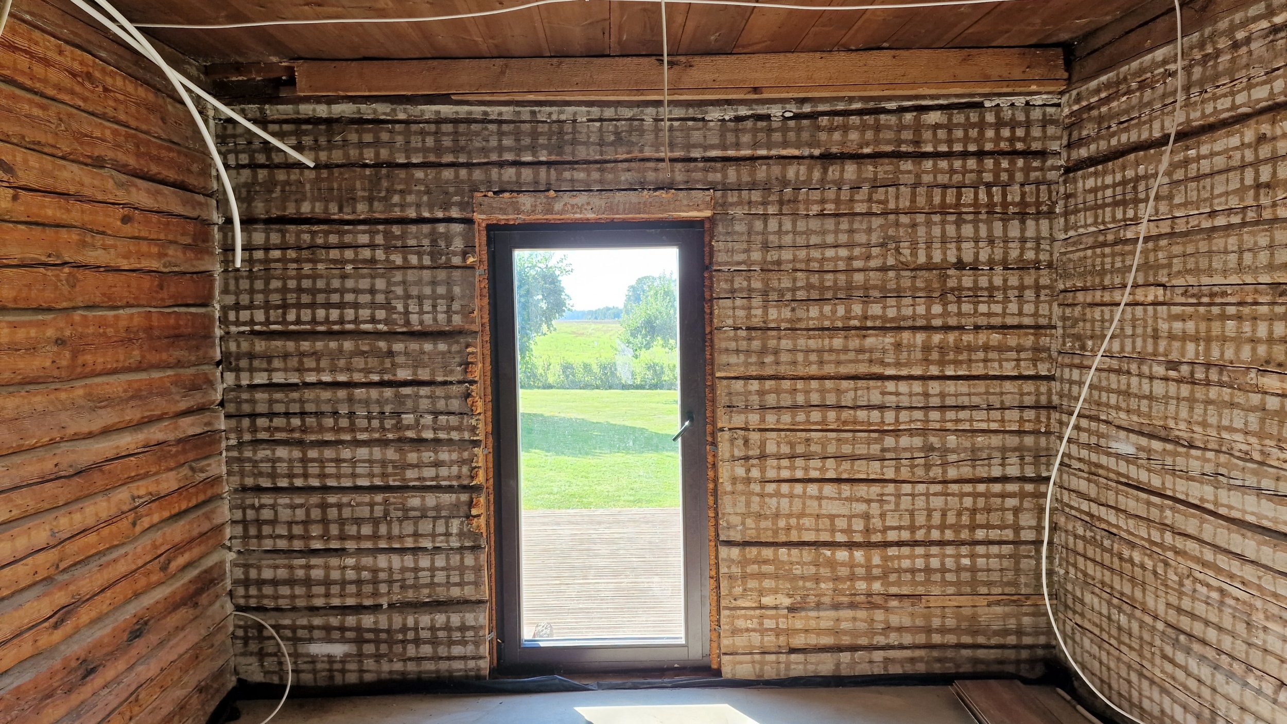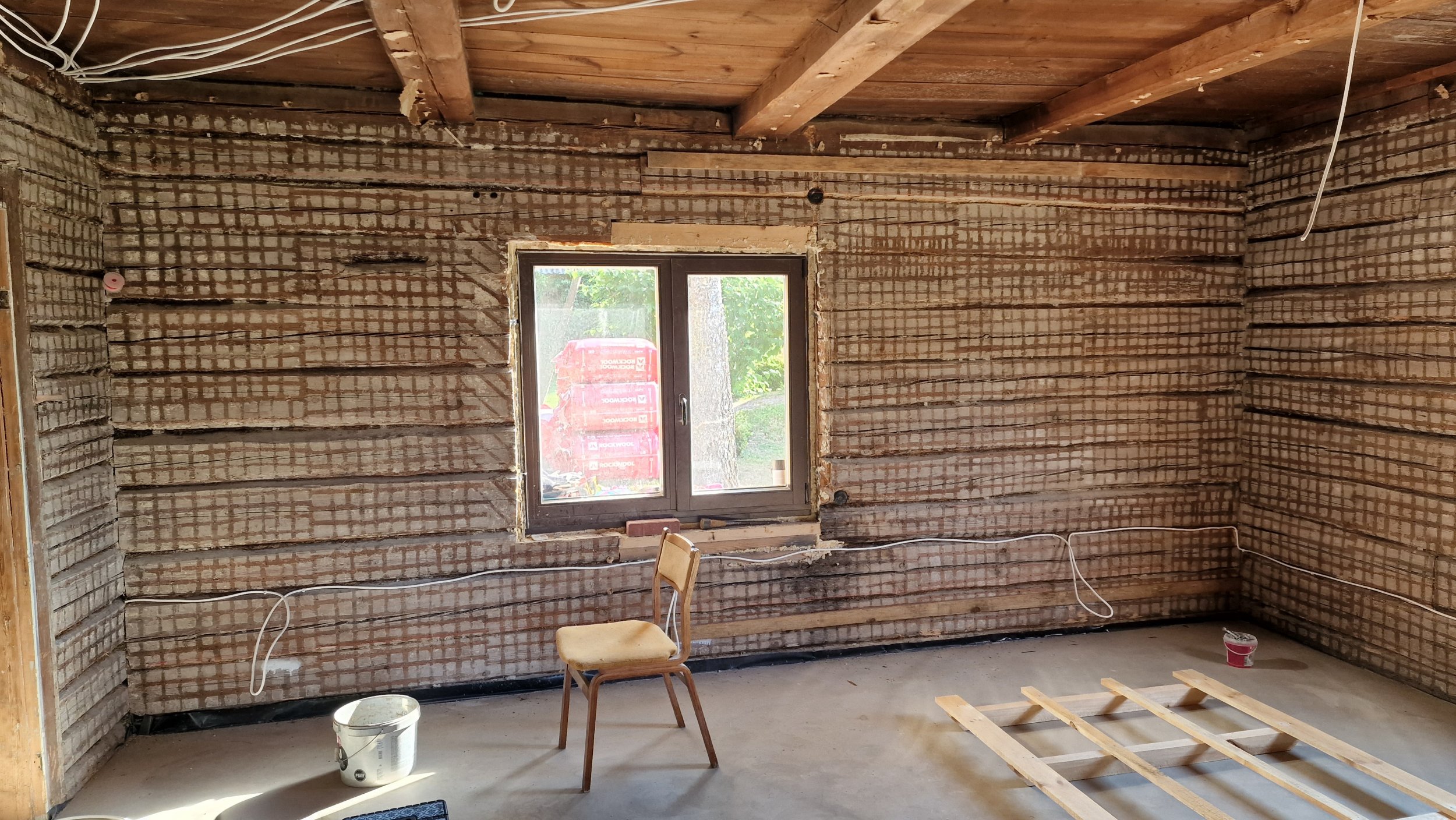Palkmaja seintele on tarvis paigaldada osb ja kips võimalikult palgi lähedale (ehk siis ilmselt ca 20mm paksusele puit roovitusele). Seinad tuleb ajada loodi ja köögiseinas olevad nurgad täisnurka. Seinte kõrgus 2,5m ja pinda kokku 135m2