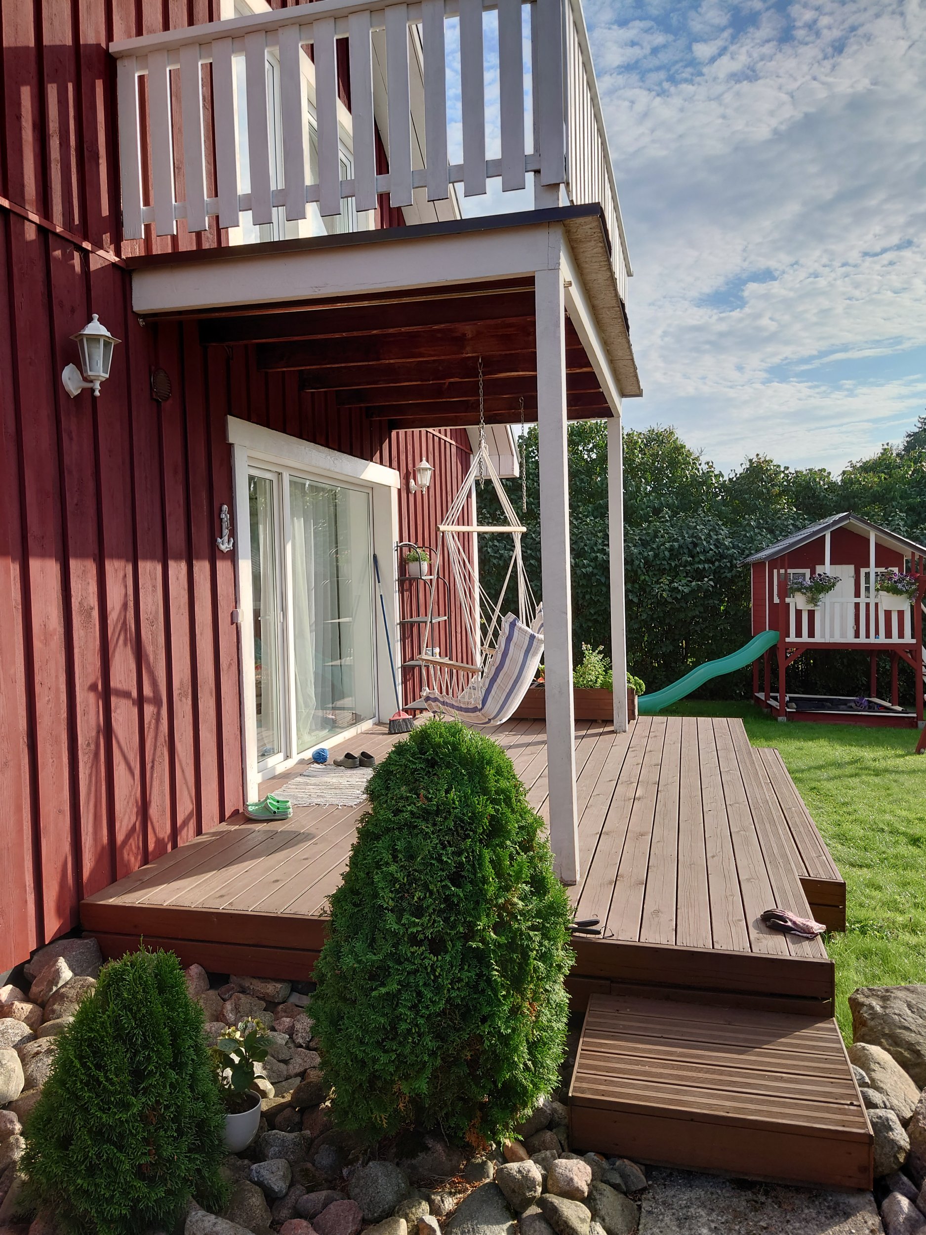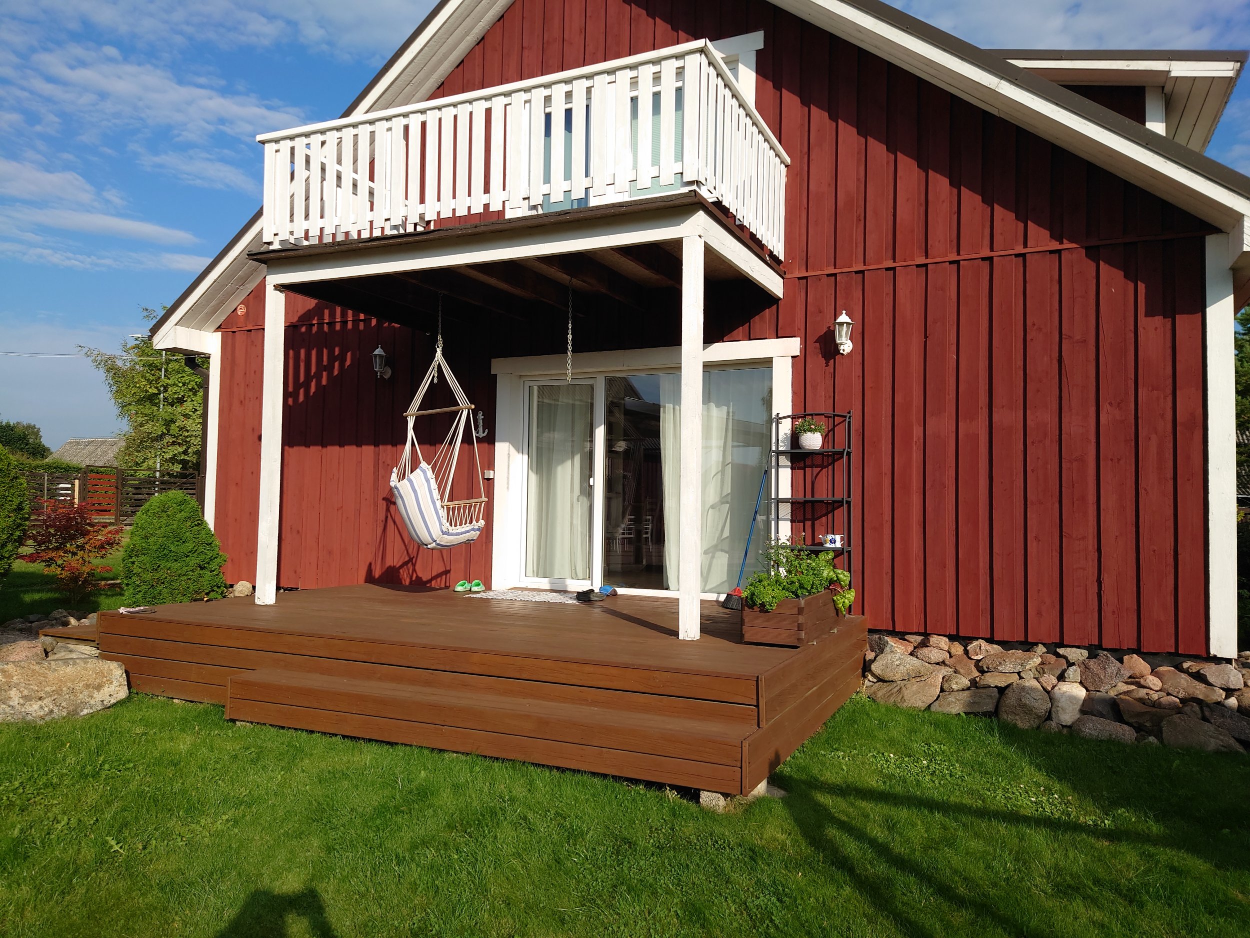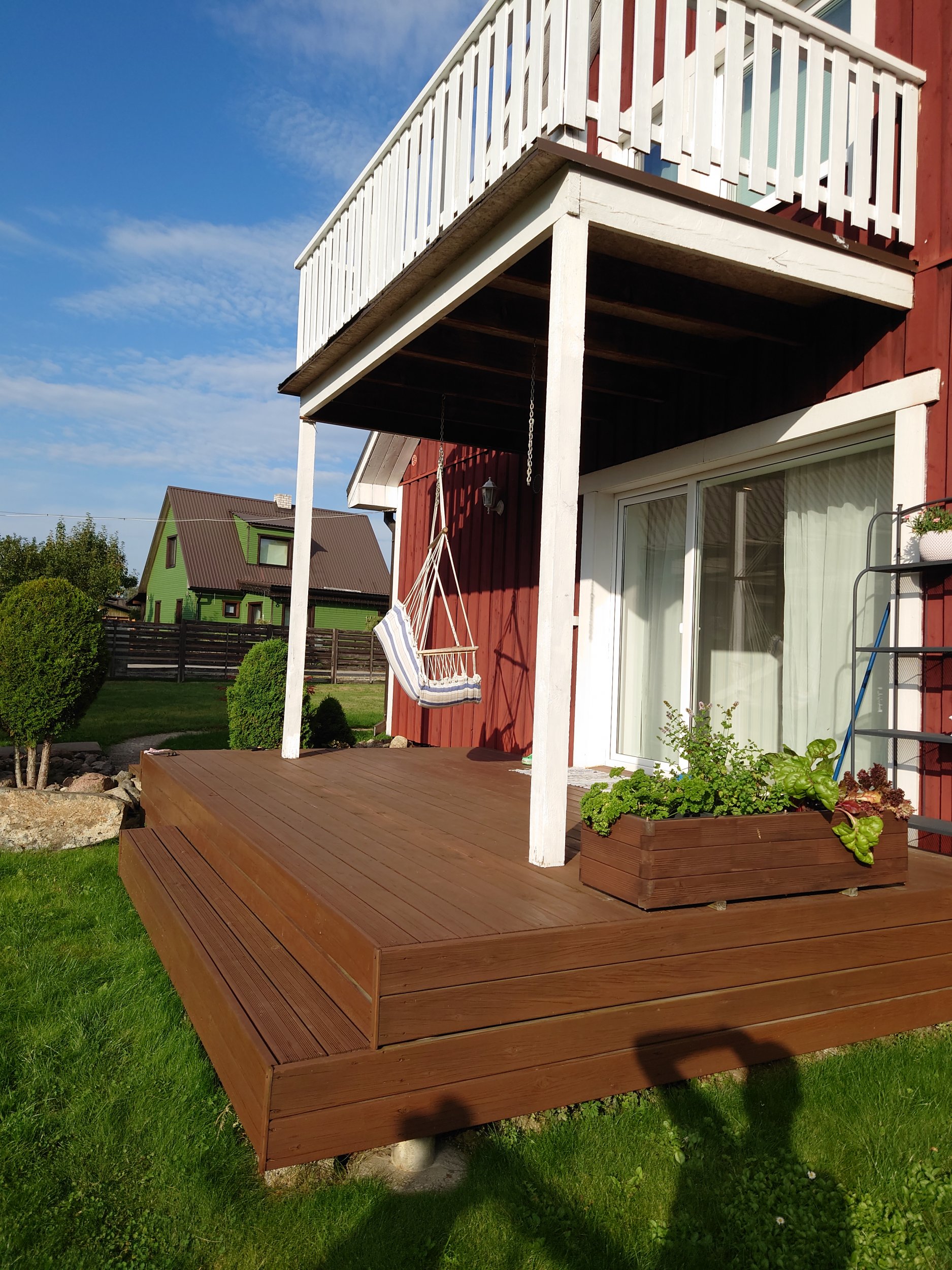 Vaja on terassi nii aluskarkassi kui ka lauad väljavahetada, terassi mõõdud on 3x5m, kõrgus maapinnast on 60cm. Terassi all on betoonist vundamentpostid, mis tunduvad veel korras olevat. Terassi peale on ka ehitatud rõdu mis tahaks ka turgutamist. Rõdu mõõdud on 210cmx370cm, rõdupõrand on 270cm terassi pinnast. Terassi ehitamisajal on rõdu vaja toetada. Rõdul on kindlasti vaja põranda vahetada, reelingu vahetada ja maja seina ääres tihendada, hetkel tilgub tugeva vihma puhul vesi rõdu ja seina vahel terassile.