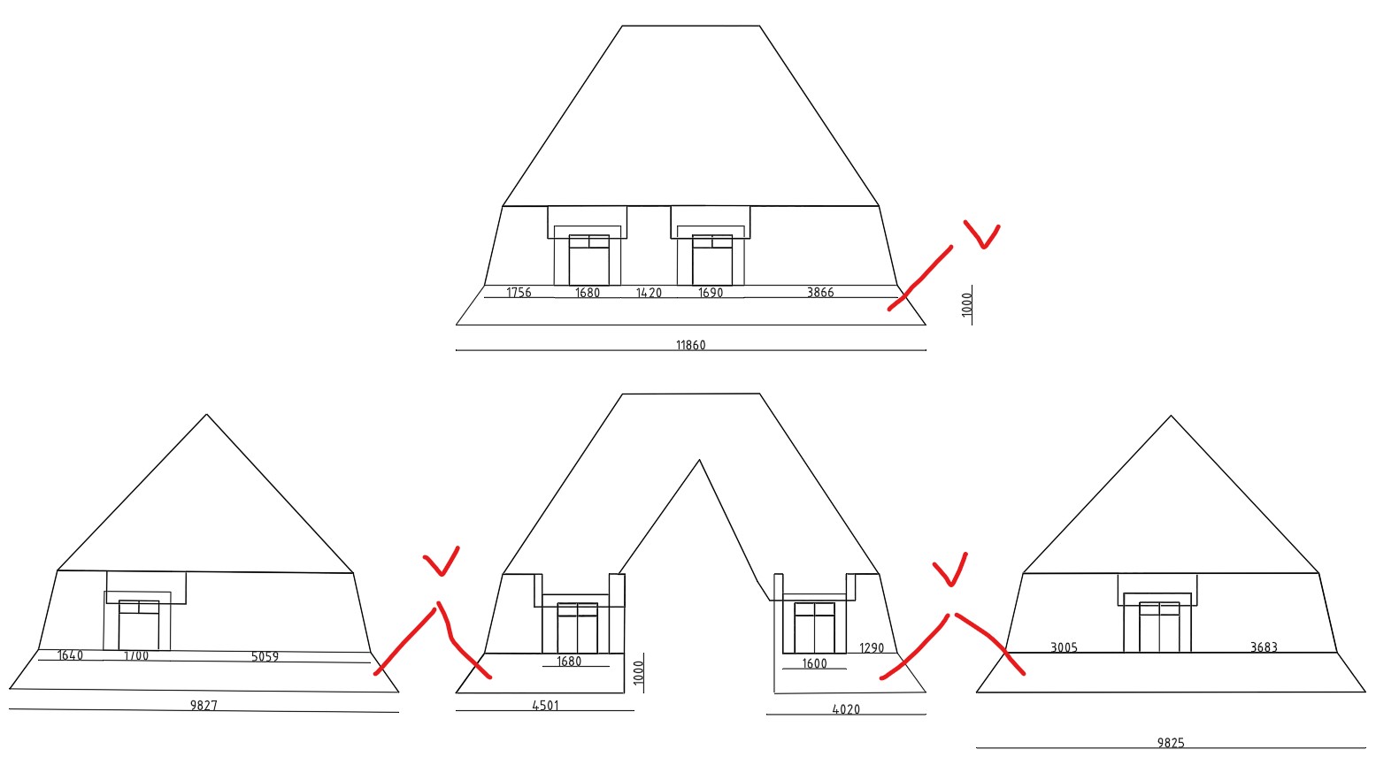 Katuse serva pikkused on: ca 9,8 m; 11,9 m; 9,8 m ; 4 m ja 4,5 m, laius on 1,0 m