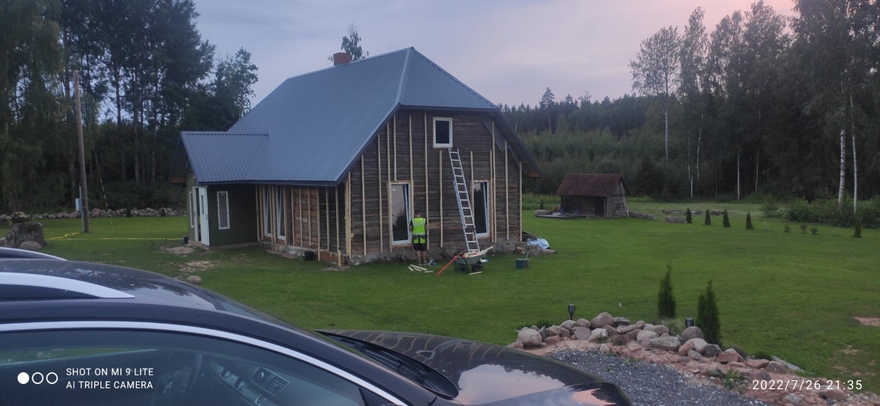 Maja fassaaditöö . Maja seina loodimine (osaliselt tehtud) , tuuletõkke ja välisvoodrilaua paigaldamine. Akende välisliistude paigaldus, räästakastide ehitus. Tuuletõke ja voodrilaud olemas (150mm),
