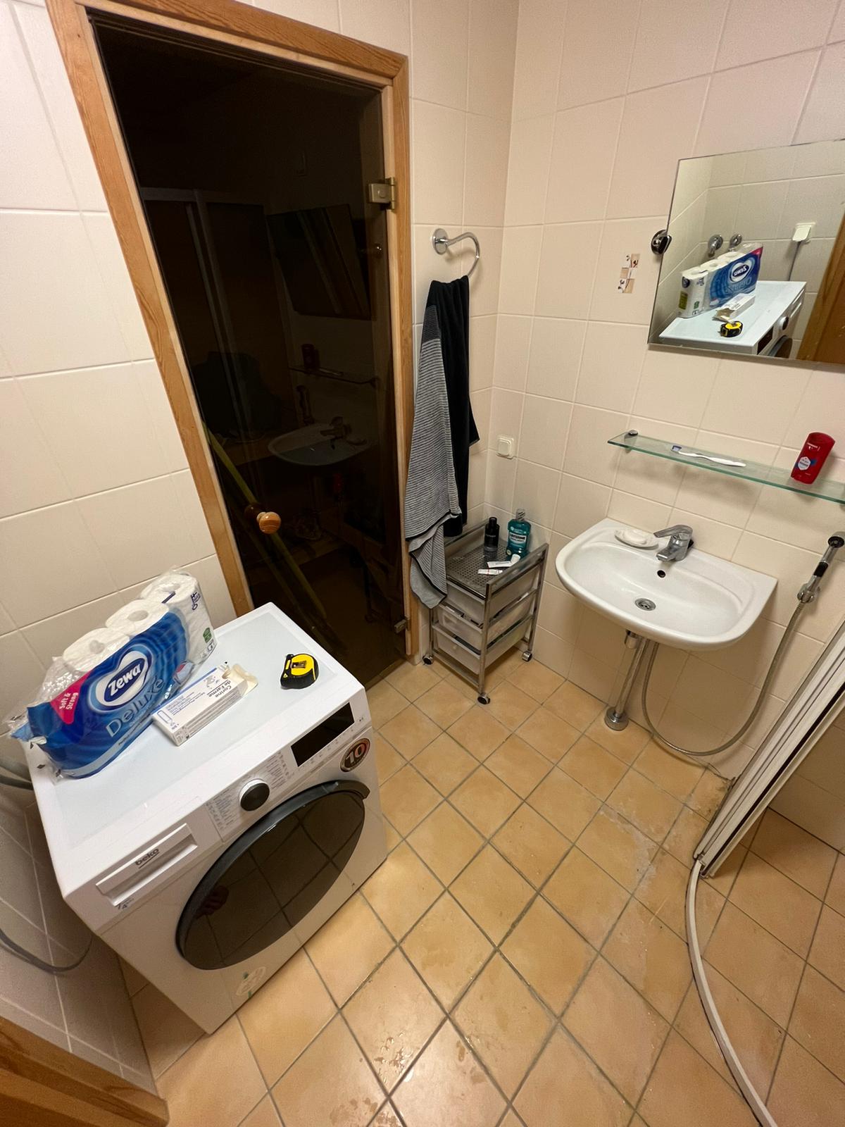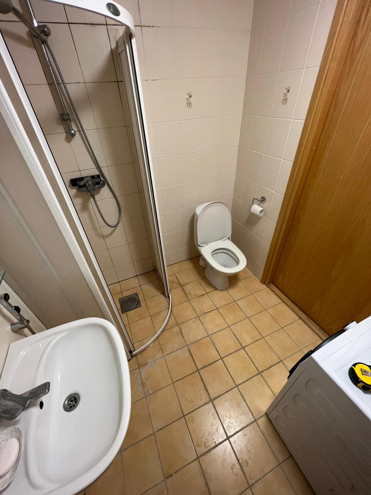 Vannituba: põrand 1.8x2.1m, kõrgus 2.3m. Vaja eemaldada vanad plaadid ja panna uued (ilmselt vaja teha ka tasandus ja uus hüdro). Vaja eemaldada vana ripplagi ja ehitada uus kipslagi kipsiluugiga. Plaatide mõõt 30x60cm. Põrandale ja seina samad plaadid. Samuti vaja utiliseerida vana wc pott, kraanikauss, dushiseinad ja paigaldada uus kraanikauss koos valamukapiga, dushiseinad ja wc pott.