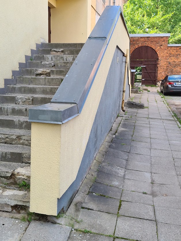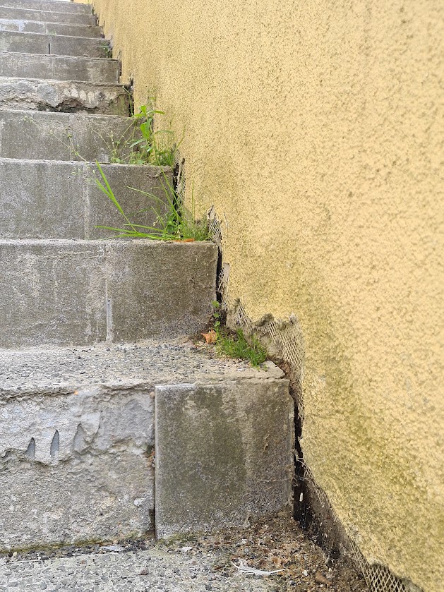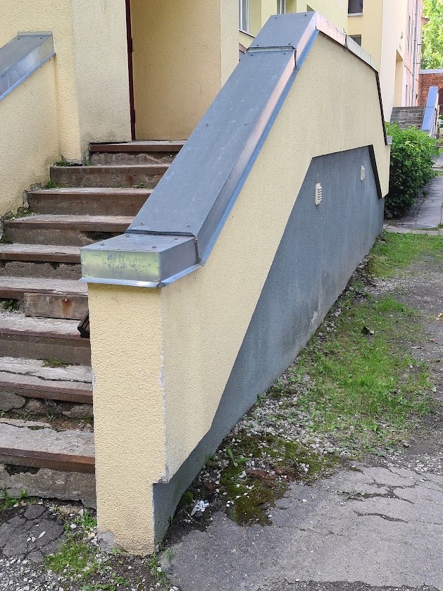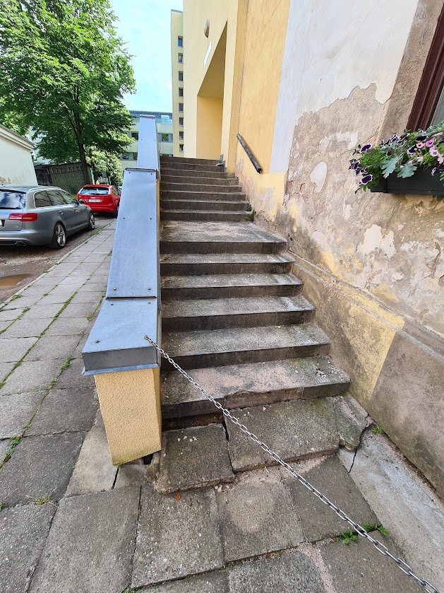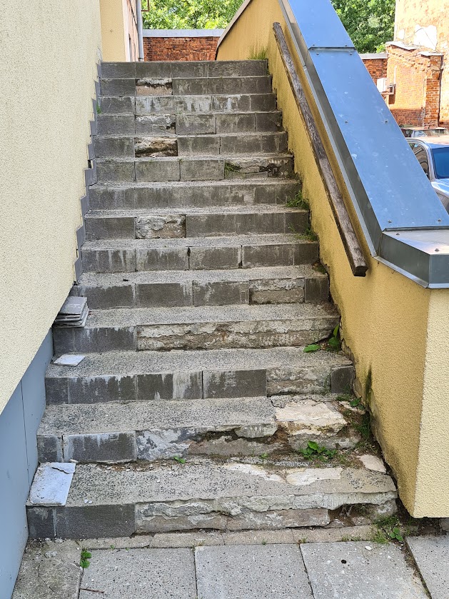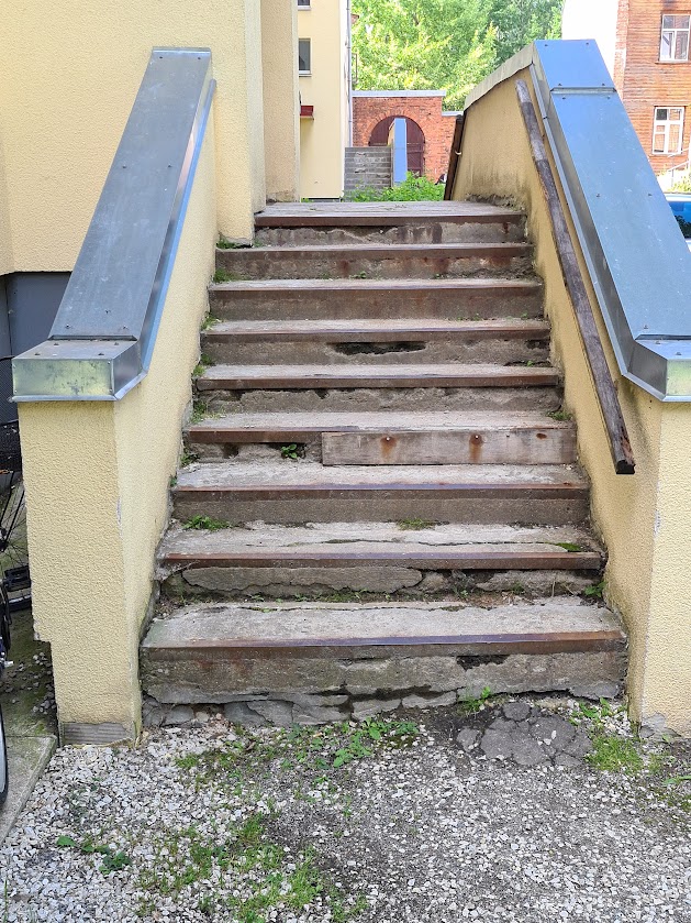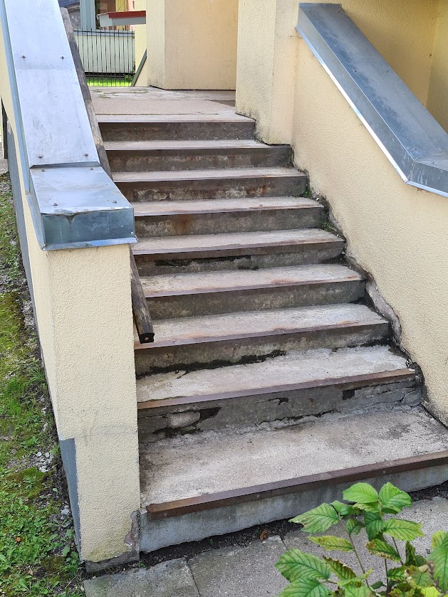 Majal on kaks tugimüüriga ja kahepoolse ligipääsuga välistreppi, mis vajavad remonti või uuesti valamist. Esimene trepp tuleb ümberehitada ühepoolseks ligipääsuks ja ehitada täiendav tugimüür (vt foto "esimene trepp 4"-seepoolne ligipääs tuleb ära kaotada ja tugimüür ehitada ). Antud trepil tuleb tugevdada ka vundamenti.