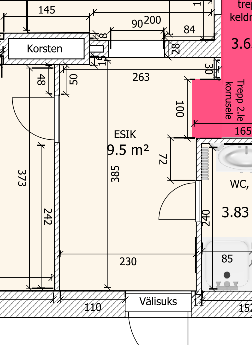 Esiku aluspõrand on uus vesiküttega kipsivalupõrand. Seina eemaldamise tõttu on vaja valada endise seina alune ala, 12cm x130cm, kõrgust vaja ca 6cm. FE-50 on selle tarbeks olemas.