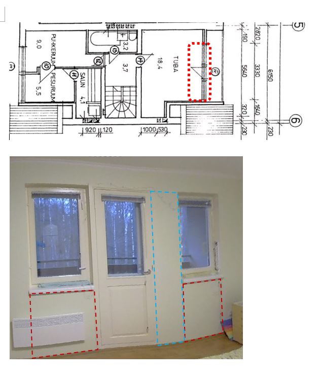 Maja projektikoopia lisatud, kus avade piirkond tähistatud punase punktiiriga.