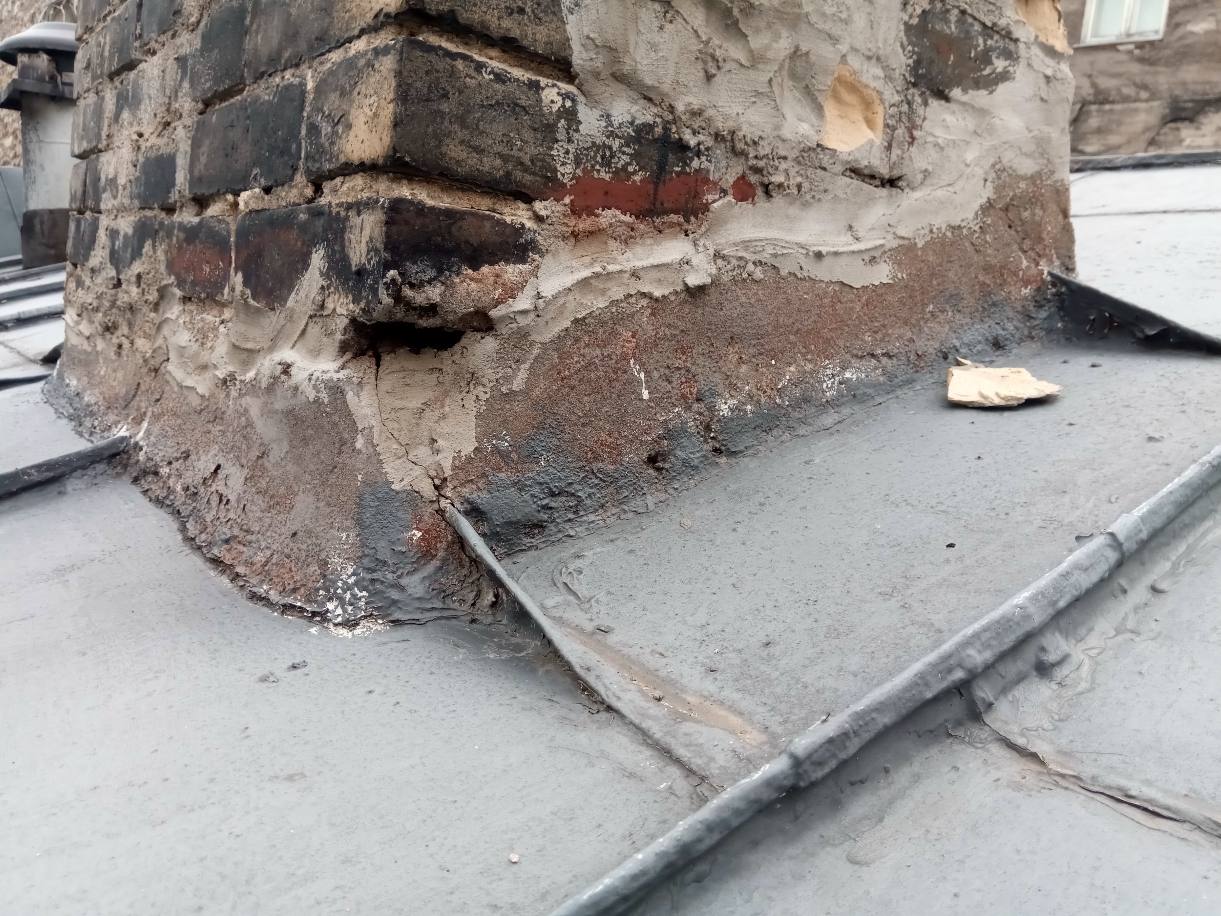 1. Kolme korstna ja ümbruse krohv eemaldada ja kontrollida korstna pleki ühendust. Ühendus uuesti krohvida elastse mördiga. Tihendada ventilatsioonitoru ühendus katusega.