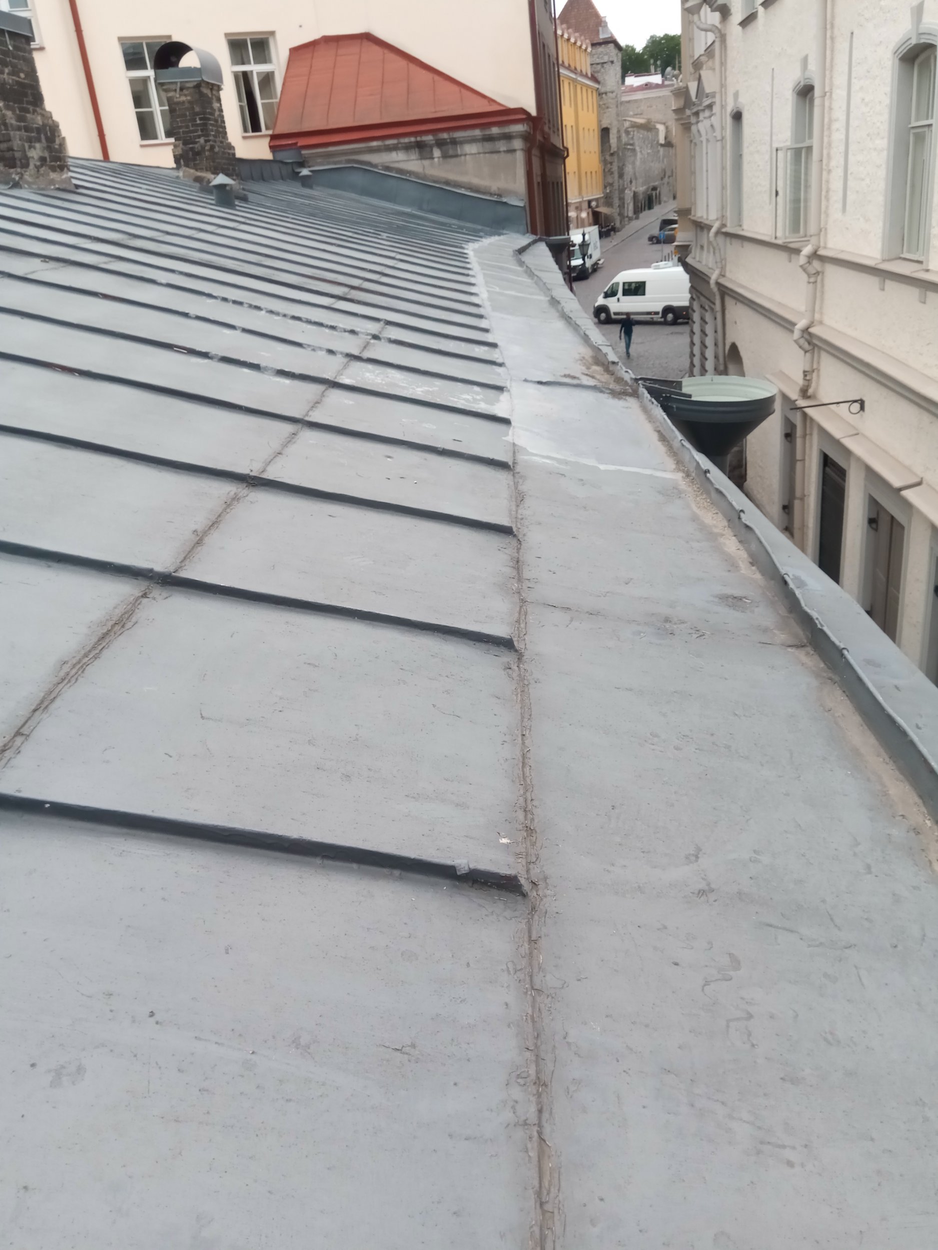 Vana valtsplekk-katus on heas korras, kuid mõnes kohas on läbijooksud, mida oleks vaja parandada.