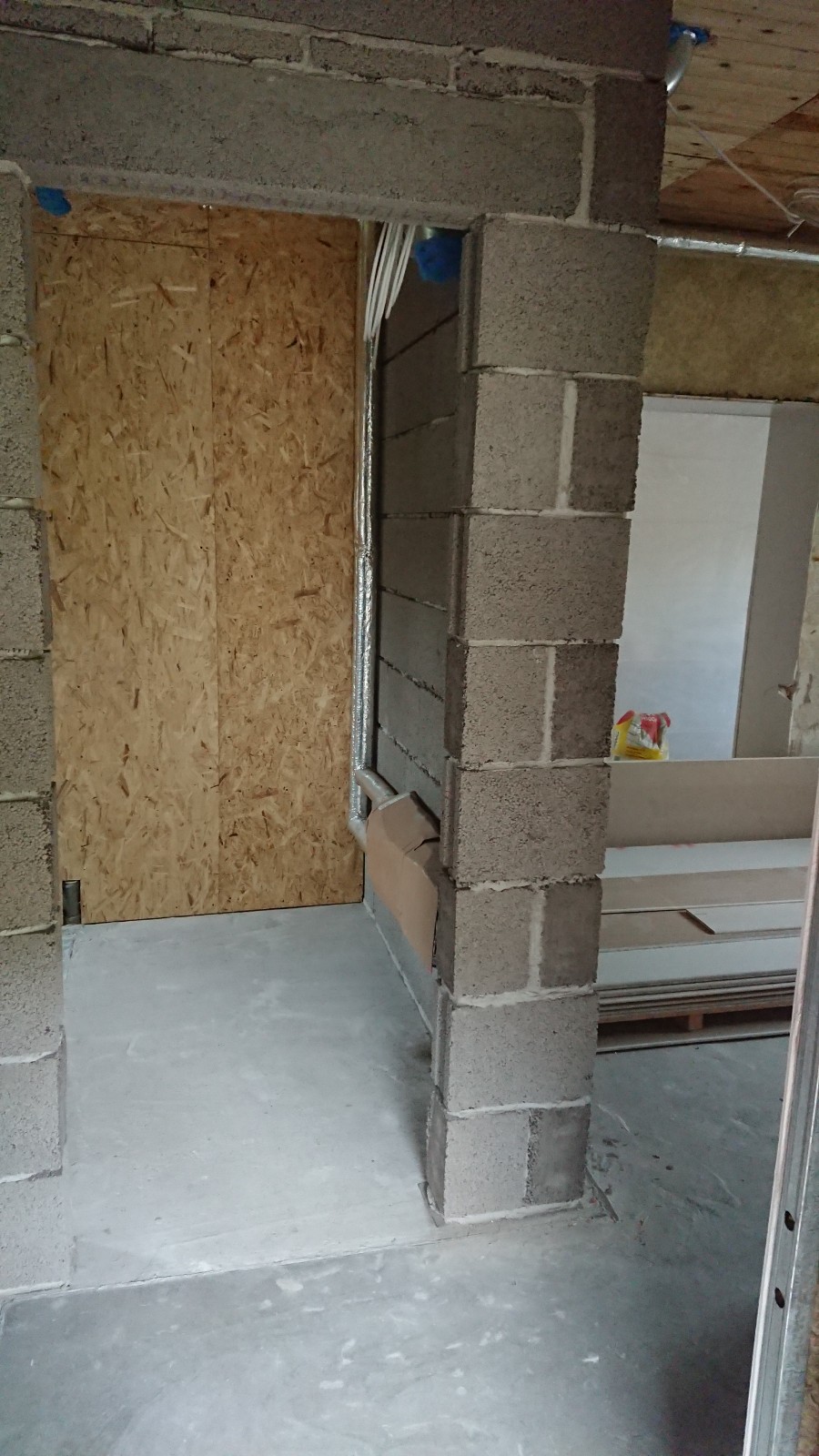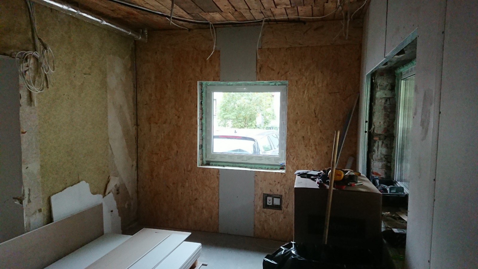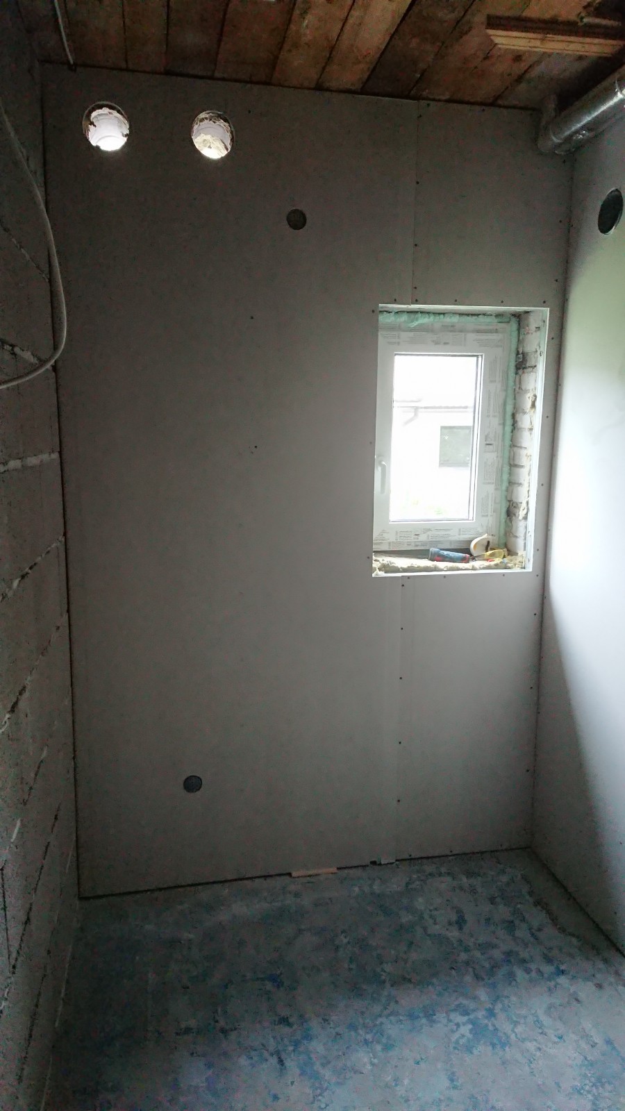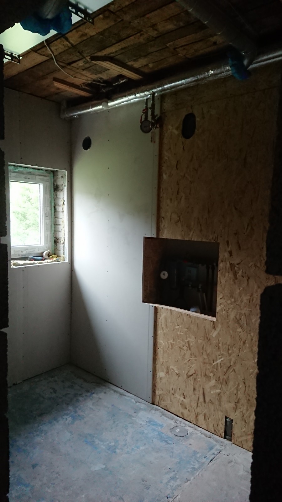 Oleks vaja pahteldada ja värvida kipsseinad (~45 m2) ja kipslagi (~21 m2) ning krohvida ja värvida fiboseinad (~30 m2) ja vana telliskivisein (~10 m2). Sinna juurde siis ka akna- ja uksepõsed. Telliskivisein on juba kaetud krohviga ja mulle tundub, et see püsib hästi seinas, seega seal on krohvimist parasjagu niipalju kui on vaja lahtiste osade täitmiseks ja ebatasasuste silumiseks.